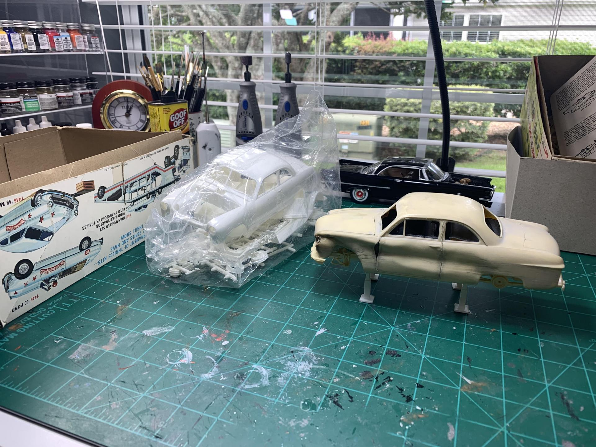 7. Well, I screwed this one up. I wanted to sand off the lower side trim and scribe the doors but it went awry. The original door lines were just too shallow for my old, shaky hands and watery eyes, and I got off track in a few places. When I tried sanding out my mistakes, it just made it worse. I primed and painted it to see if I could cover up my screw ups, then just said the hell with it. Stripped the paint and decided to build a wrecked version. I'm going to start this project over with that kit in the bag there, an old Tournament of Thrills model.
