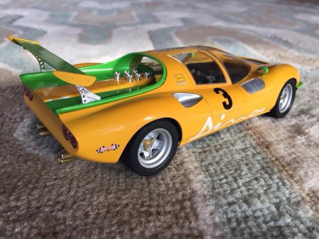 Hi, The history of this little car is very interesting. After watching Bullitt, Chaparral approached Steve McQueen to enhance its motor sports endeavors. Steve, having a fondness for Mustangs opted for a modified Ford V8, a 9.5ltr titanium block and head CanAm prototype engine. Ford's upper management figured because the Chevys were dominating the CanAm series with their distributor being in the back, so they decided to move theirs to the rear as well. Sunoco was going to be a sponsor but had dropped out last minute. Sadly the project was scrapped because the high mounted wing was outlawed. This was meant to be a further down the line project and not my 4th model (I'll stop counting after this as I'm sure some may be annoyed already). I learned a ton and it was one of those things I could have kept going with. Noodling here and there, changing this and that etc... but I wanted to finish her. My original plan was to use Sunoco decals but the ones I got many moons ago were pi$$ poor, bad resolution etc... I was going to bring em into Photoshop for some clean up etc but wanted to be done today. I'm looking forward in doing a more simpler model, one appropriate for my experience. So I've chosen a Round2 Opel GT 3 in 1 reissue which looks fun as hell. PS In terms of the orange peel, i was affraid of handling the body too much due to my recent experiences with it. So i didn't do much polishing. This is basically how she looked after paint and no treatment. I'm sure my fears were psychological but still I thought she'd fall appart etc...