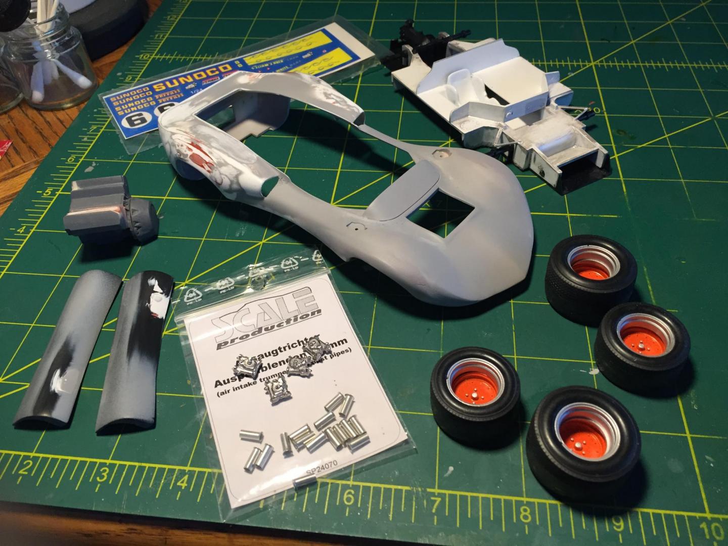Hi, While waitng for a Dino 206 body to come as I destroyed the previous one, I decided to make some progress on an idea; a Chapparal 2D Spyder CanAm. I had an extra Fuji Chaparral 2D kit due to missing key parts from the intial one bought off fleaBay. I duplicated said parts via a resin casting kit so the 2nd Fujimi kit eneded up being complete. I scratch built the wheels in terms of combining tires to make some fat ones. And also built the rims from some lame ones I almost gave away. I bought an already assembled Monogram 2D off eBay for $4.95 for its fenders which were grafted on to the Fuji kit. I had used Bondo spot glaze but it melted the fenders so it took me hella effort to make em ok. Crazy Glue was used to re enforce and harden em as they were rubbery. I then used Tamiya White Putty for the repair work. I read after the fact that warpage could happen when too much Bondo is applied, which it was. I'm scratch building the engine from some parts; a 426 Hilborn Injected some thing or other from some one who is no longer in biz. Webers will be used with some tall intakes. A lot of work was already done on the engine beileve it or not. The idea will be to paint it Sunoco style. There is still 2-3 putty/sand/spray sessions left which require me to lightly spray with Tamiya grey primer in allowing imperfections to show as I go along. All in all a total f-ing PITA but I'm making progress, at times like Molasses up hill. This is technically my 3rd project and man model building has proven very hard for me. As afx once said, I am picking too advanced topics to start with but its how my mind works, a curse at times. Anyways, this will be done in several months as I can't wait to put it down for a while.