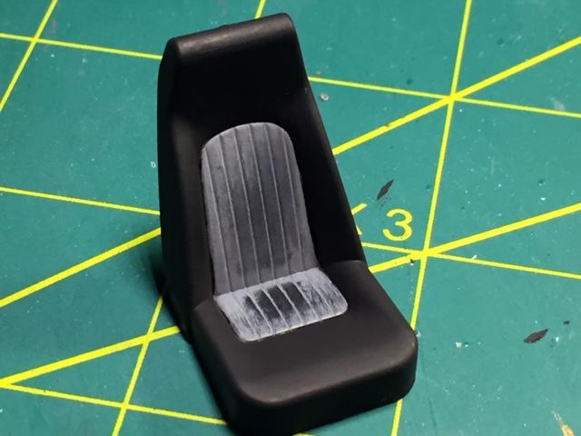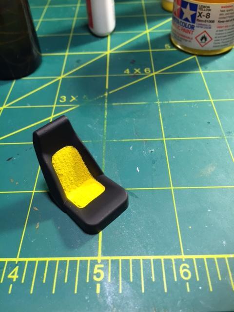 Attached is a pic of a seat I had to strip and repaint due to the yellow mishap. Note the black, its 1 coat of the Vallejo Model Color, goes on wonderfully! I'll probaly use Tamiya yellow tonight. -