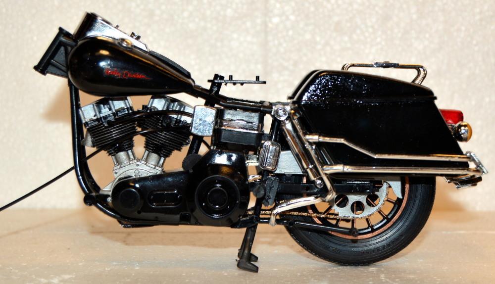 Just a little update. I am wiring the Heritage for the head and tail lights to operate. The installation of the LED's and the wiring has been done. The "black" in the headlight is due to the flash that was used. I am hoping to get this working correctly and end up with a good looking, show quality model....