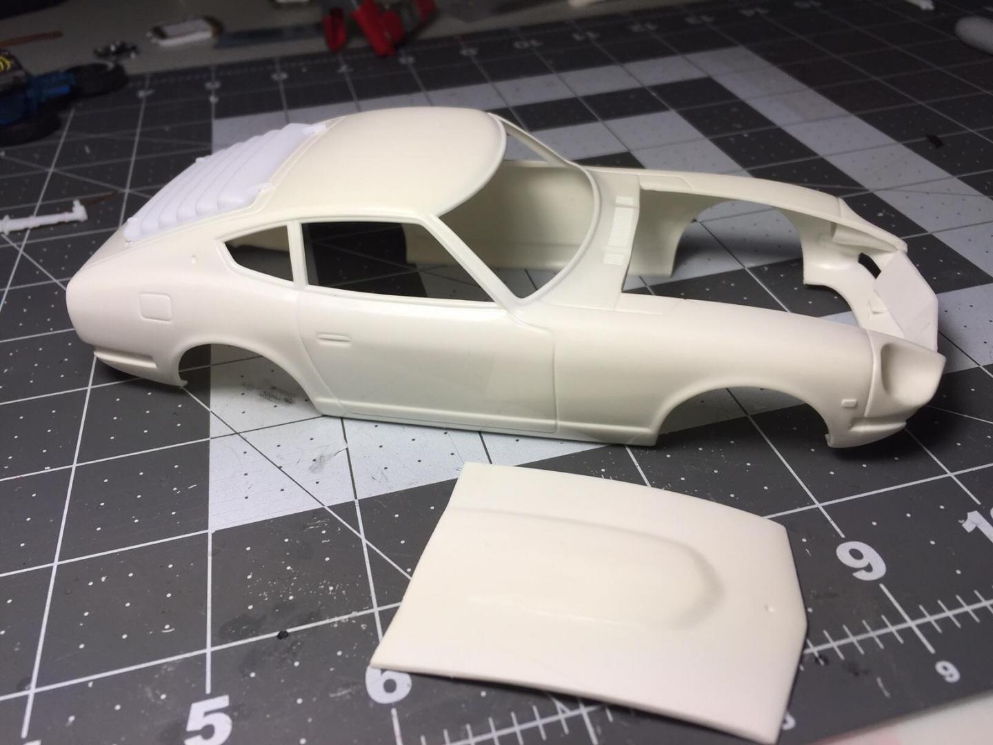Don't know a lot about these cars but my uncle has a 78 280z has done a lot of the work to it over the years. He used to build models not so much now. He gave me the kit while visiting. I've been showing him lots of pictures of other builds and he asked when I was going to do this one. Figured I'd blow the dust off the box and spend some time on this one in between builds. Originally I wanted to cut out the gril and the hood. Wanted to use the mesh that comes with the kit to custom make a gril. Upon googling this car I've realised the hood is hinged on the front similar to old corvettes where would I hinge it? Skills aren't there yet to attempt all of this. Thinking I'll just leave the gril as is and cut out the hood. Be a shame to put a nice engine in it and cover it up.