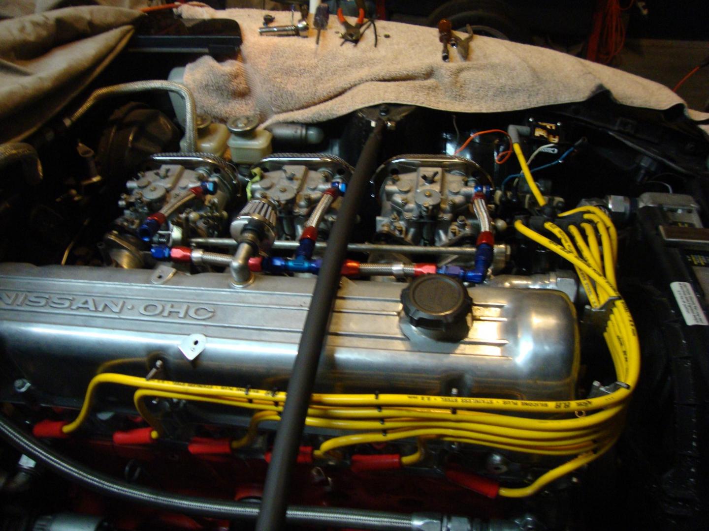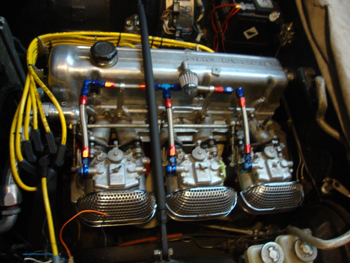 Well guys first of all thanks for looking and for the kind words. Decided to sit down today and do some engine work. Bought Testors Createfx acrylic black wash. Engine was given a light wash since I did earlier with black and thinner. Intake manifold was given 3 wash coats. Carbs were painted gold and washed 4 or 5 times to dull down the gold. Found some copper wire and decided I needed fuel lines. Then found some smaller gauge wire and figured it would make a nice makeshift throttle linkage. Getting cross eyed now so going to call it a night, here are some pics. Let me know what you think usually I stop at plug wires. Comments welcome guys and thanks for lookin! -