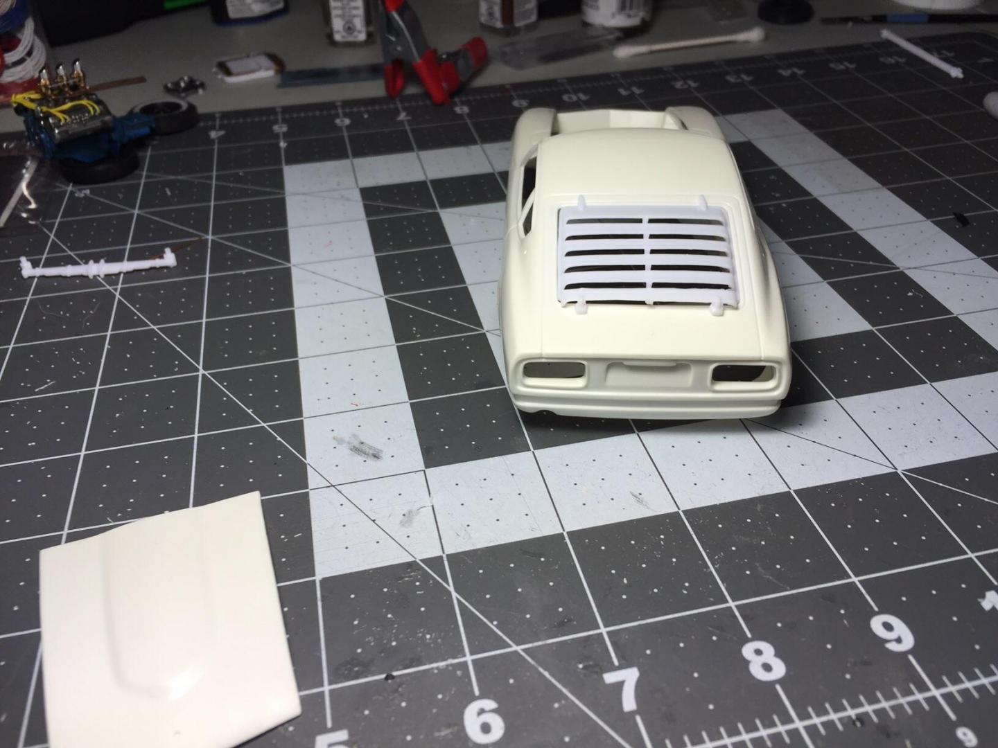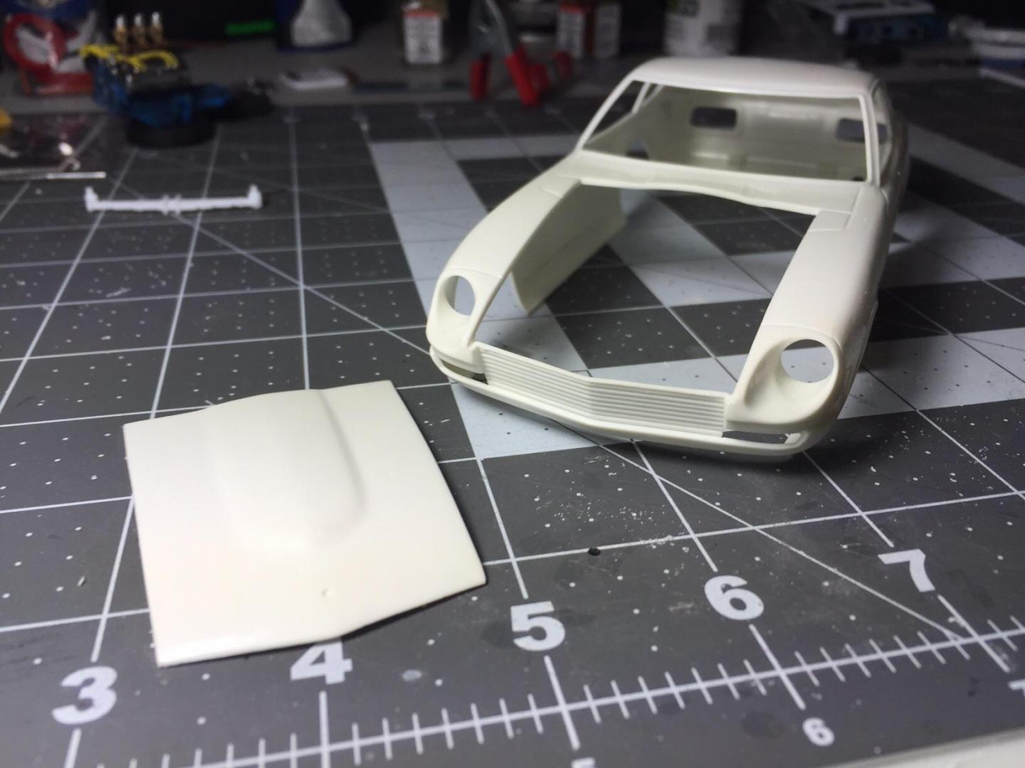 So finally got some bench time in. Work had me all over Alberta and B.C. The last week. This may be a slower build as things are picking up work wise. Finally got the hood cut out. Pretty happy with it. Sanded it down everything looks good now that that part is out of the way I'm more motivated to build this project. Found a window louver from a revelle mustang and it seems to fit pretty well. Still in the air about it. Here are a few pics of what I've got so far.