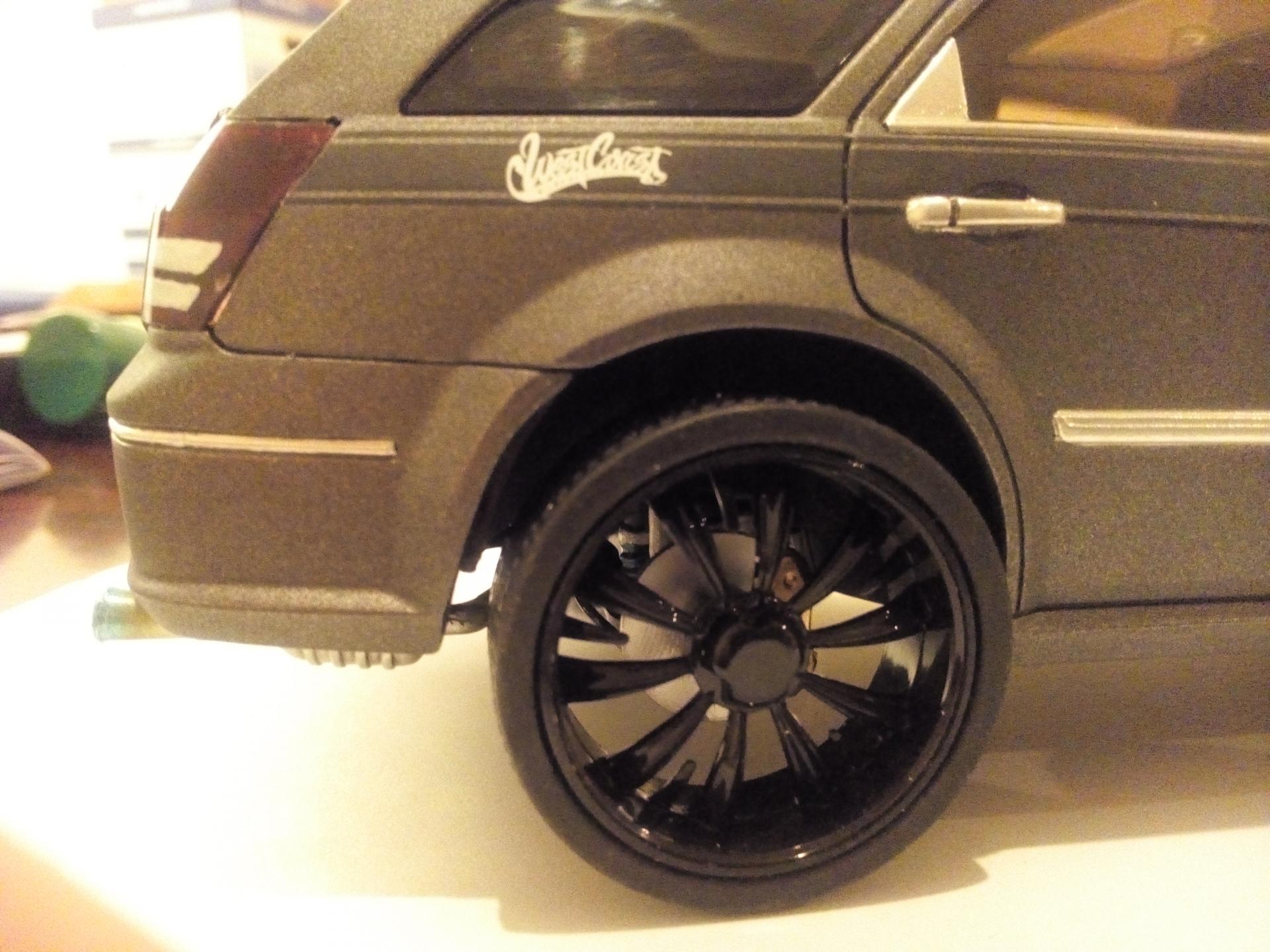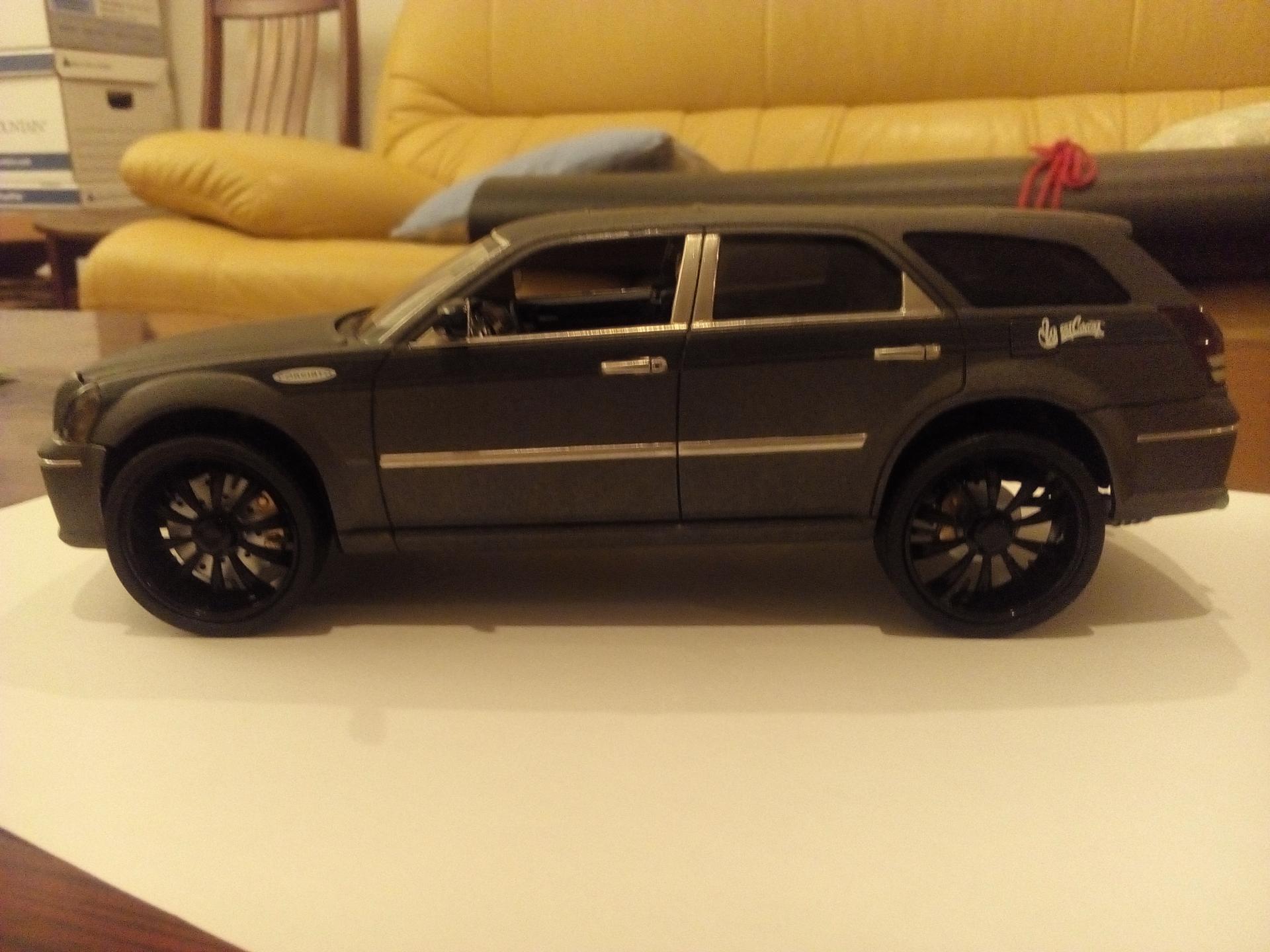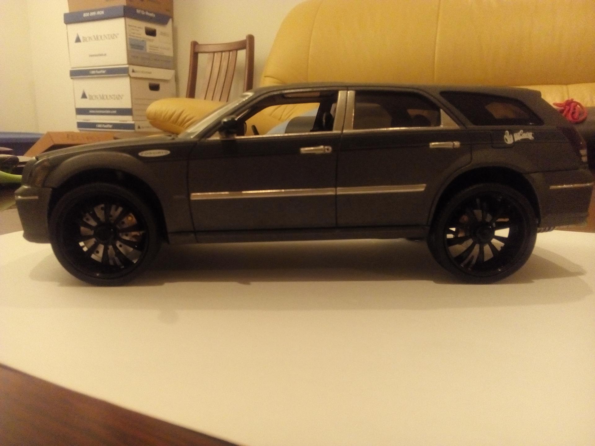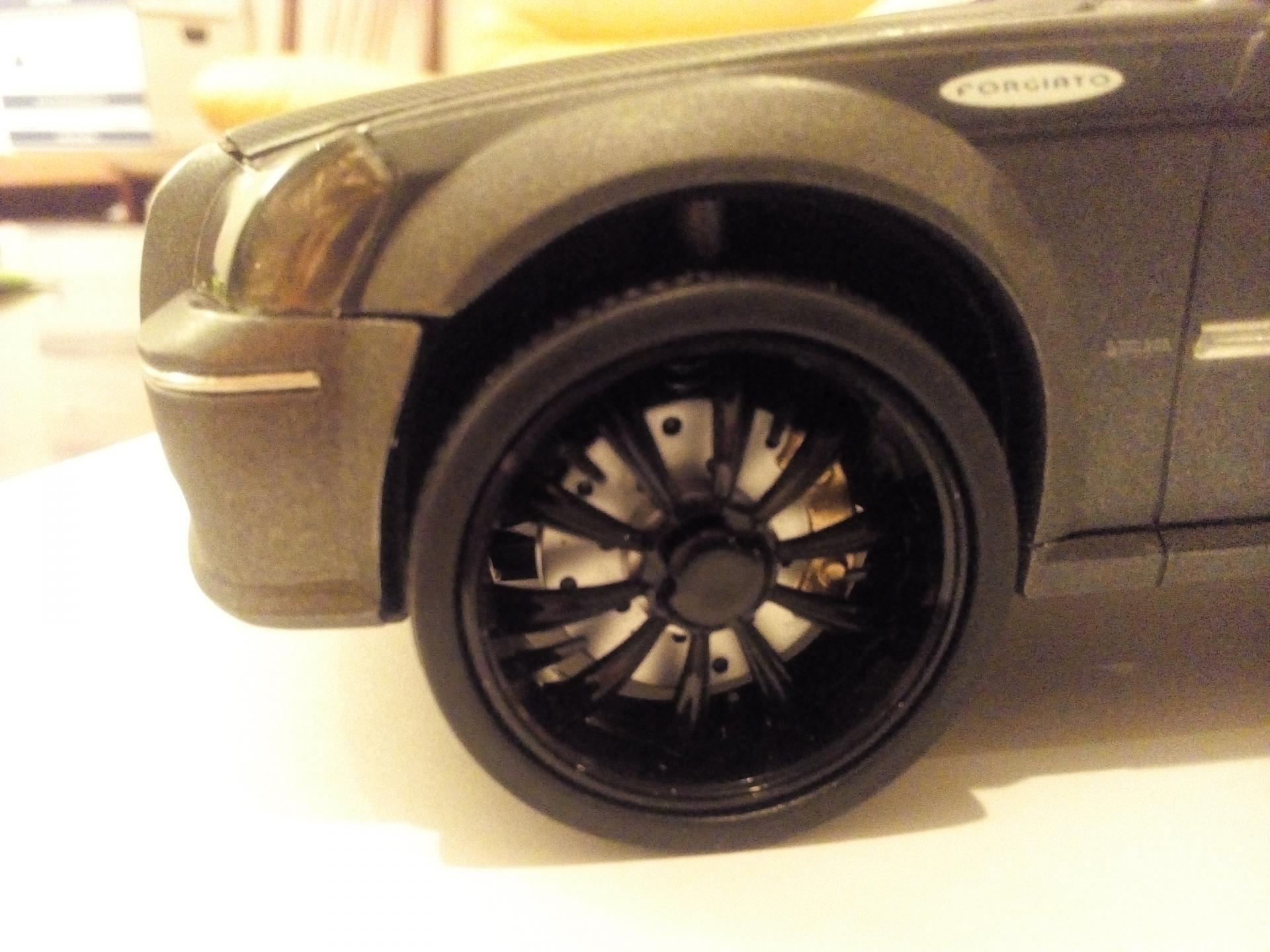 9. Hey there, glad it's finally done. Fitting was surprisingly good considering it's revell. Thought I would have issues with the windshield fitting but did not. My goal was to fit those oversized rims but not make it look like a donk. Mods include Fitted oversized rims Lifted suspension and whole car in order to fit the rims Matte graphite grey paintjob Bigger brake discs Rear subwoofer/speakers Chrome trim by BMF Tinted head/tail lights Some decals here and there Carbon Fiber Hood Meshed grille Exhaust tips with heat stain (my favourite part of the car aside from those rims) That's about it. Thanks for checking it out.