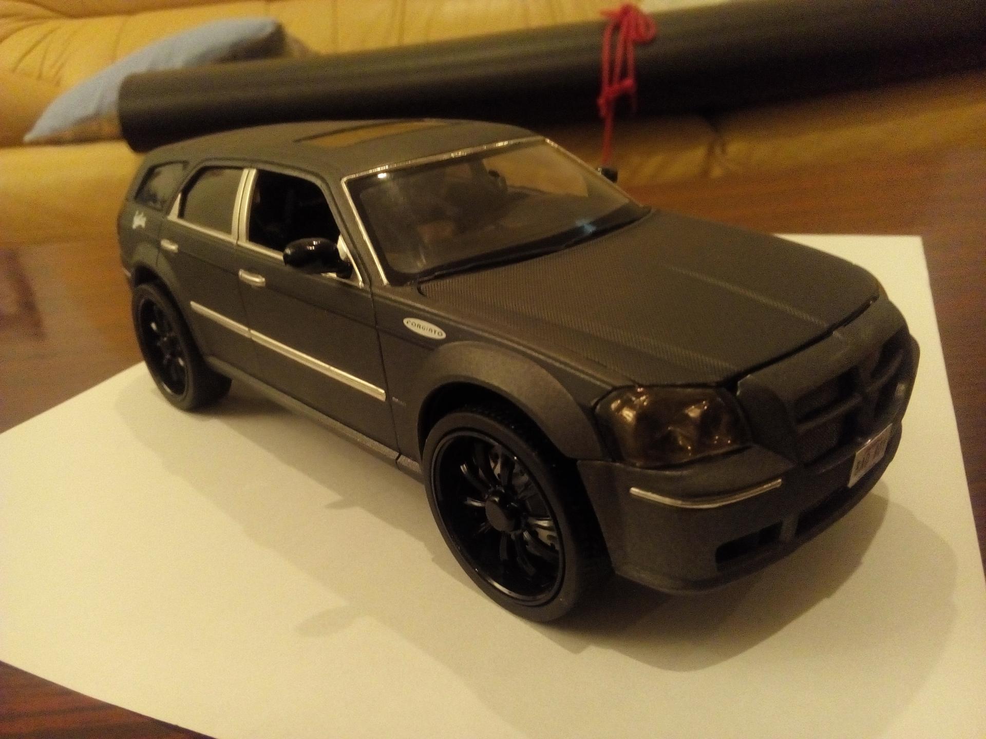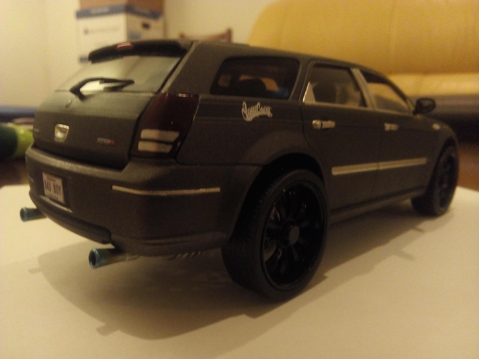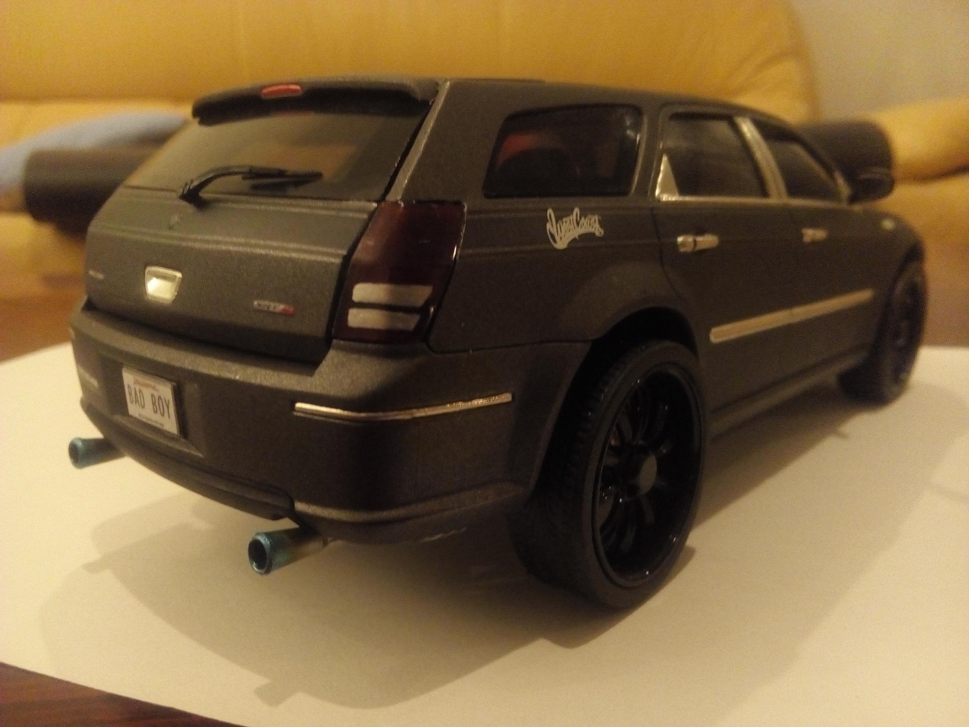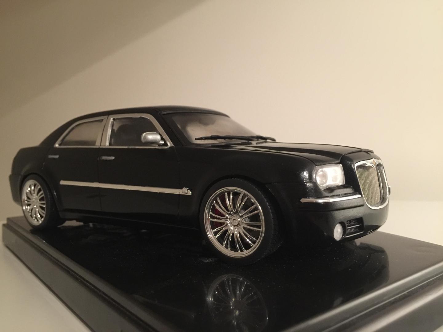 9. Hey there, glad it's finally done. Fitting was surprisingly good considering it's revell. Thought I would have issues with the windshield fitting but did not. My goal was to fit those oversized rims but not make it look like a donk. Mods include Fitted oversized rims Lifted suspension and whole car in order to fit the rims Matte graphite grey paintjob Bigger brake discs Rear subwoofer/speakers Chrome trim by BMF Tinted head/tail lights Some decals here and there Carbon Fiber Hood Meshed grille Exhaust tips with heat stain (my favourite part of the car aside from those rims) That's about it. Thanks for checking it out.