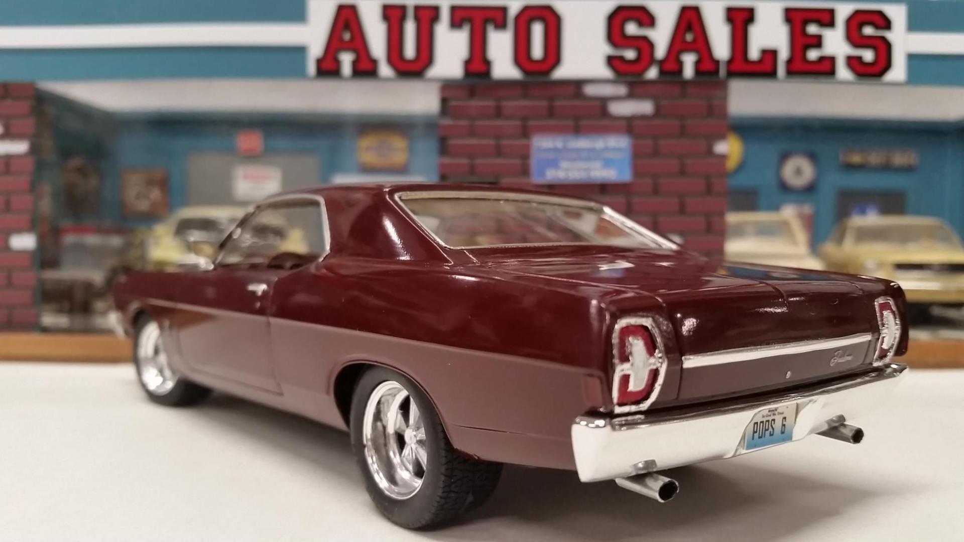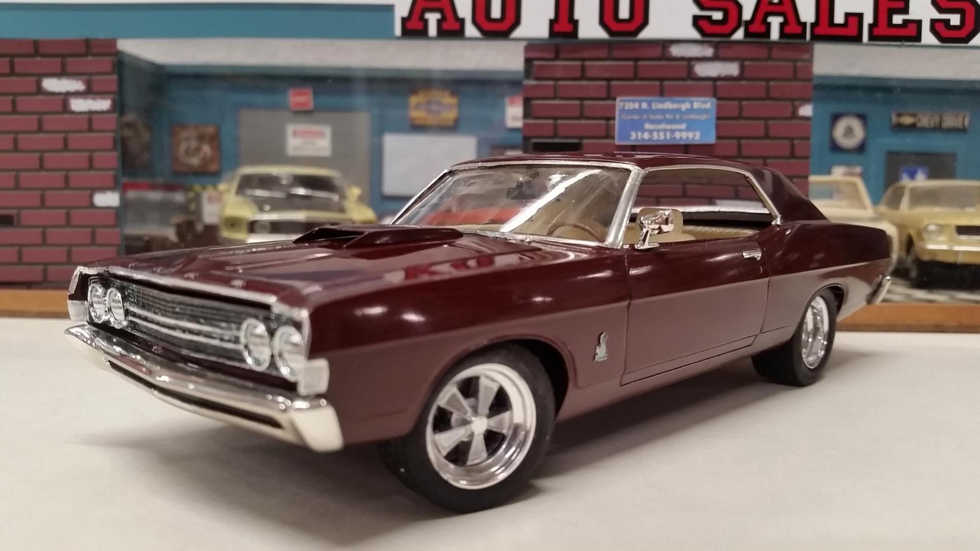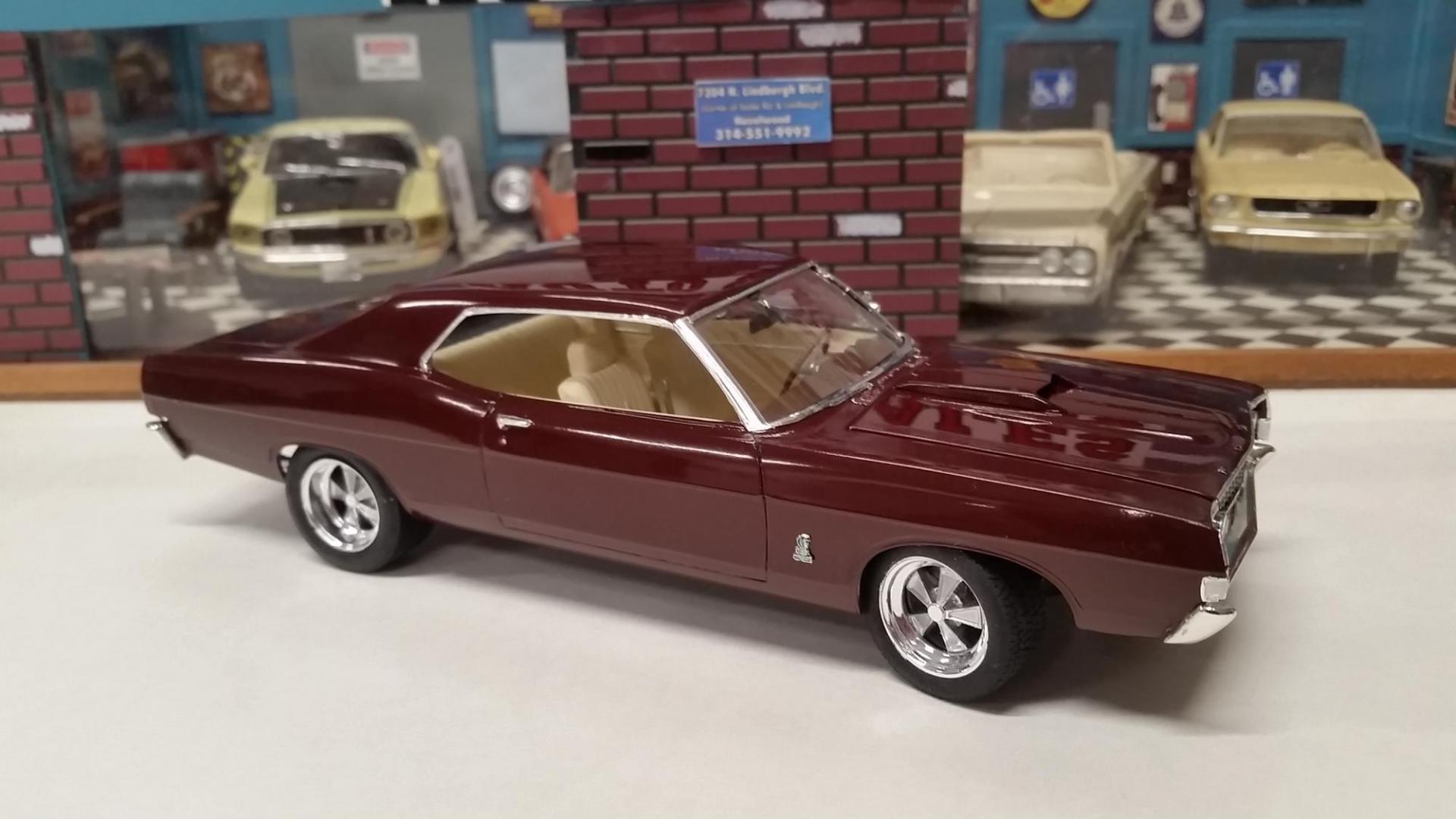 While I've visited this site on a regular basis for a couple of years, I've never posted before. There have been a few late 60's Torinos posted recently that motivated me to finally share one of builds. I built this 68 Fairlane to replicate my dad's 1:1 as close as possible. My skills are nowhere near what I see on here but it came out pretty good for the shelf. Here are the highlights: Body: The body started as a resin 68 Torino. I removed the Torino emblems which was quite a challenge on the grill and trunk while retaining the trim underneath. The cobra fender emblems were scavenged from a 68 Shelby Mustang. I almost forgot...the grill and bumper are molded together on this kit. I felt that the grill stuck out too far and needed to be recessed back under the hood more. I cut the bumper and grill apart, careful to not damage any visible chrome. That allowed me to set the grill back further under the hood. I also made a gravel pan from styrene to fill in the gap between the grill and bumper. That got painted body color. Chassis: The chassis is from an amt 66 Fairlane. Other than moving the rear axle forward just a bit, it was almost a direct swap. Wheels: The wheels were a lot of work since I'm unaware of any kit wheel that closely replicates the wheels on the real car. I wanted to replicate 17" Cragar Eliminators. I used the faces monogram 65 shelby mustang wheels and fitted them to larger, deeper rims from the parts box that looked about 17" to me. Tires are from the parts box. Engine: The engine came from the amt 67 mustang. My dad's car has a 351 Windsor which is slightly taller than a 289 so I added some shims under the heads to effectively give a taller deck height and make it look a little bigger like the 351. Interior: I cut the floor out of the interior tub since the top of the 67 Fairlane chassis is the floorboard in that kit. That allowed me to eliminate the console since my dad's car doesn't have one. Steering wheel was borrowed from an amt 67 shelby mustang. Seats are from the am 69 cobra since they had headrests to further replicate the real car. And now for the pictures. Hope you like it. Just added a picture of the 1:1 car that I replicated.