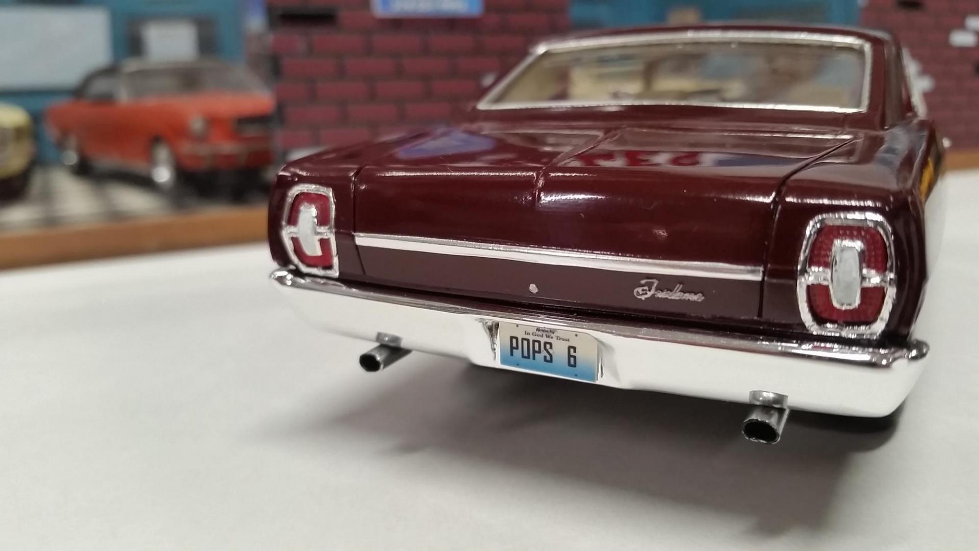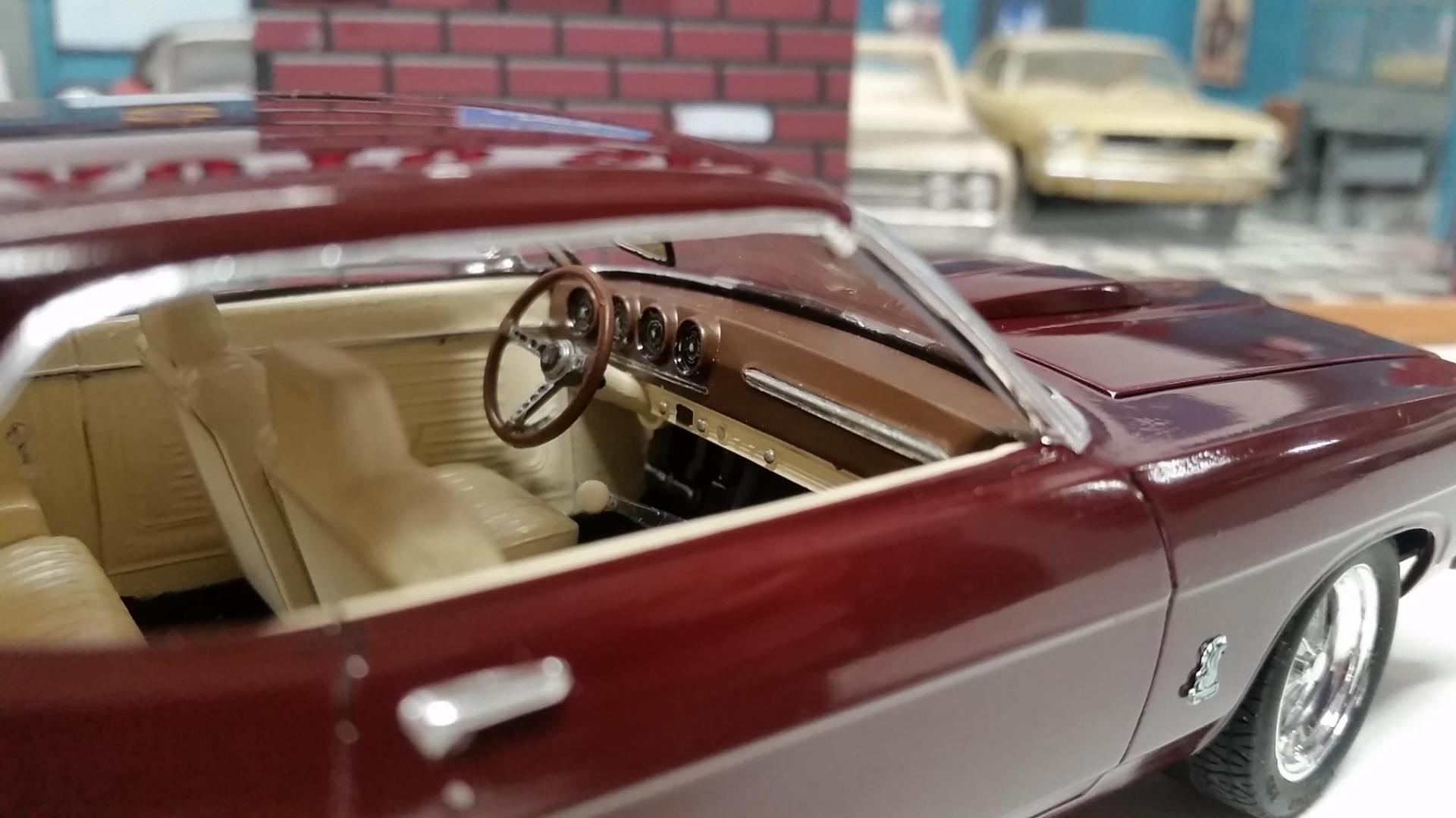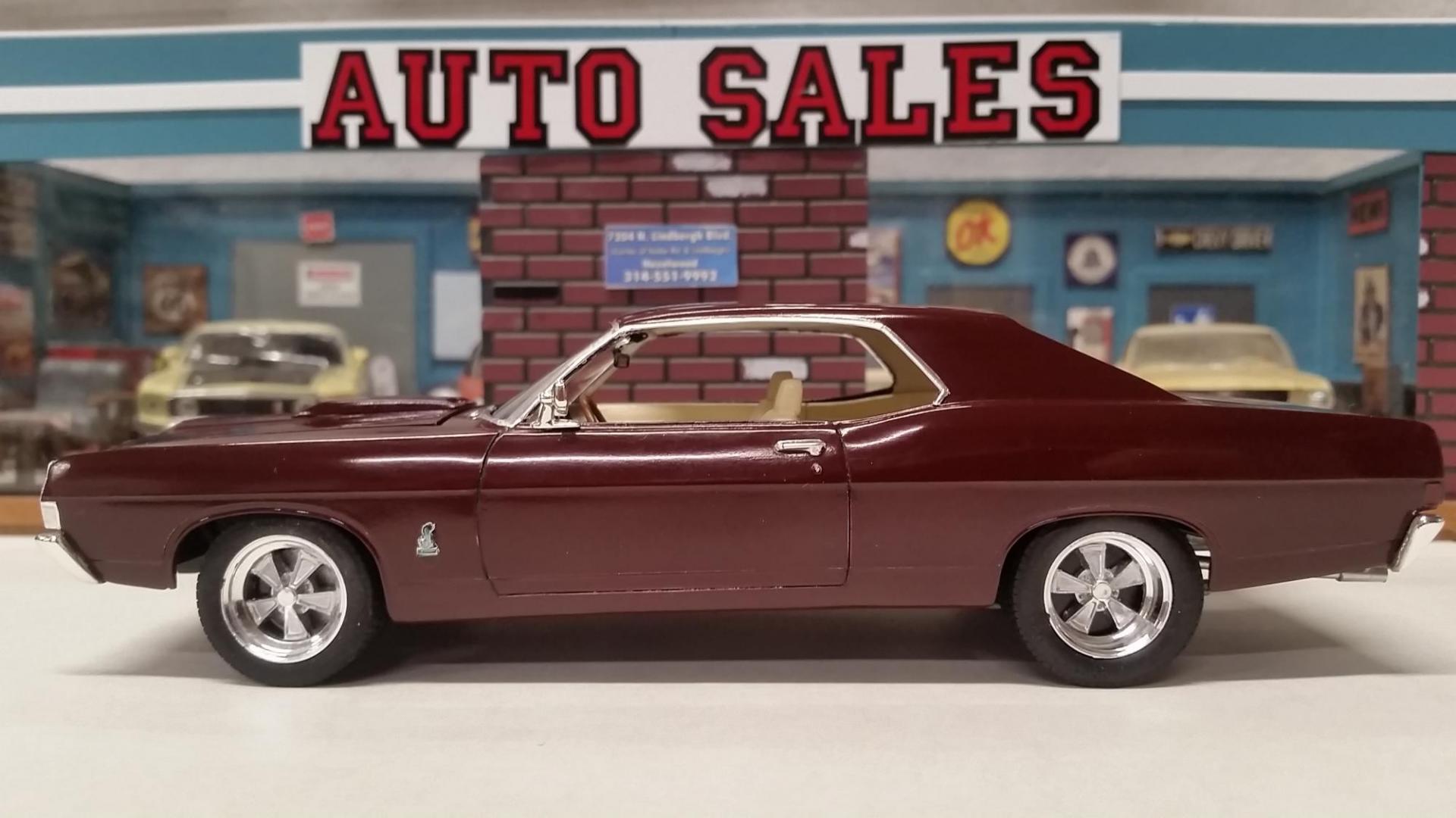 While I've visited this site on a regular basis for a couple of years, I've never posted before. There have been a few late 60's Torinos posted recently that motivated me to finally share one of builds. I built this 68 Fairlane to replicate my dad's 1:1 as close as possible. My skills are nowhere near what I see on here but it came out pretty good for the shelf. Here are the highlights: Body: The body started as a resin 68 Torino. I removed the Torino emblems which was quite a challenge on the grill and trunk while retaining the trim underneath. The cobra fender emblems were scavenged from a 68 Shelby Mustang. I almost forgot...the grill and bumper are molded together on this kit. I felt that the grill stuck out too far and needed to be recessed back under the hood more. I cut the bumper and grill apart, careful to not damage any visible chrome. That allowed me to set the grill back further under the hood. I also made a gravel pan from styrene to fill in the gap between the grill and bumper. That got painted body color. Chassis: The chassis is from an amt 66 Fairlane. Other than moving the rear axle forward just a bit, it was almost a direct swap. Wheels: The wheels were a lot of work since I'm unaware of any kit wheel that closely replicates the wheels on the real car. I wanted to replicate 17" Cragar Eliminators. I used the faces monogram 65 shelby mustang wheels and fitted them to larger, deeper rims from the parts box that looked about 17" to me. Tires are from the parts box. Engine: The engine came from the amt 67 mustang. My dad's car has a 351 Windsor which is slightly taller than a 289 so I added some shims under the heads to effectively give a taller deck height and make it look a little bigger like the 351. Interior: I cut the floor out of the interior tub since the top of the 67 Fairlane chassis is the floorboard in that kit. That allowed me to eliminate the console since my dad's car doesn't have one. Steering wheel was borrowed from an amt 67 shelby mustang. Seats are from the am 69 cobra since they had headrests to further replicate the real car. And now for the pictures. Hope you like it. Just added a picture of the 1:1 car that I replicated.