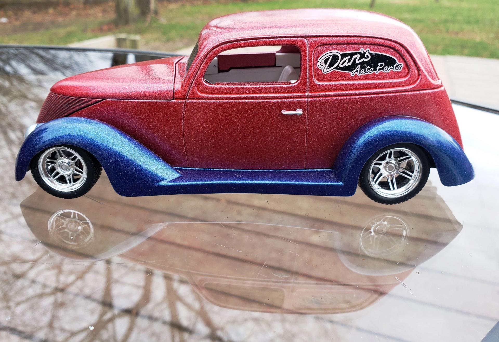 I started with a 1932 Ford Victoria. Used the custom plans and pretty much built it to stock. I painted it with Vallejo Model Air Red. The interior is Vallejo Model Air Blue. I used the left over decals from the Revell Kenworth W900.