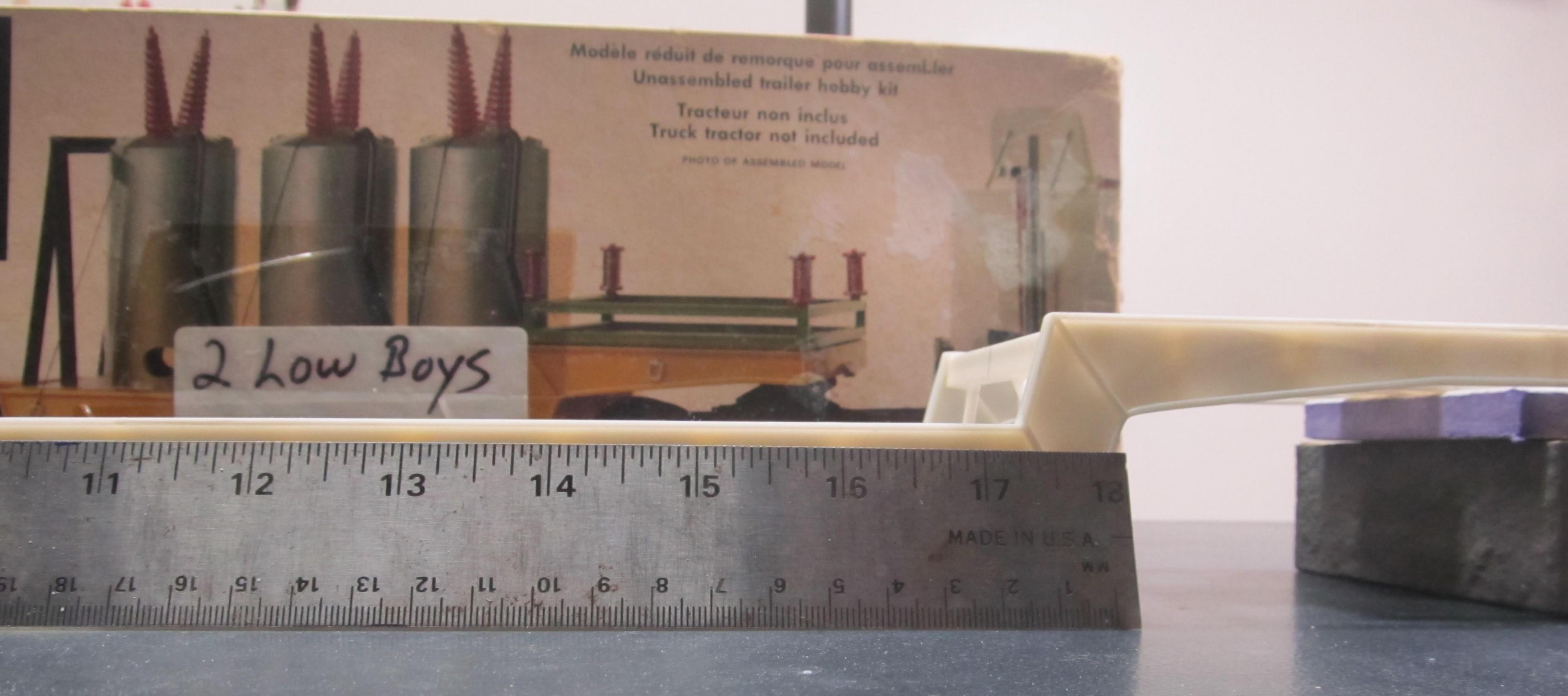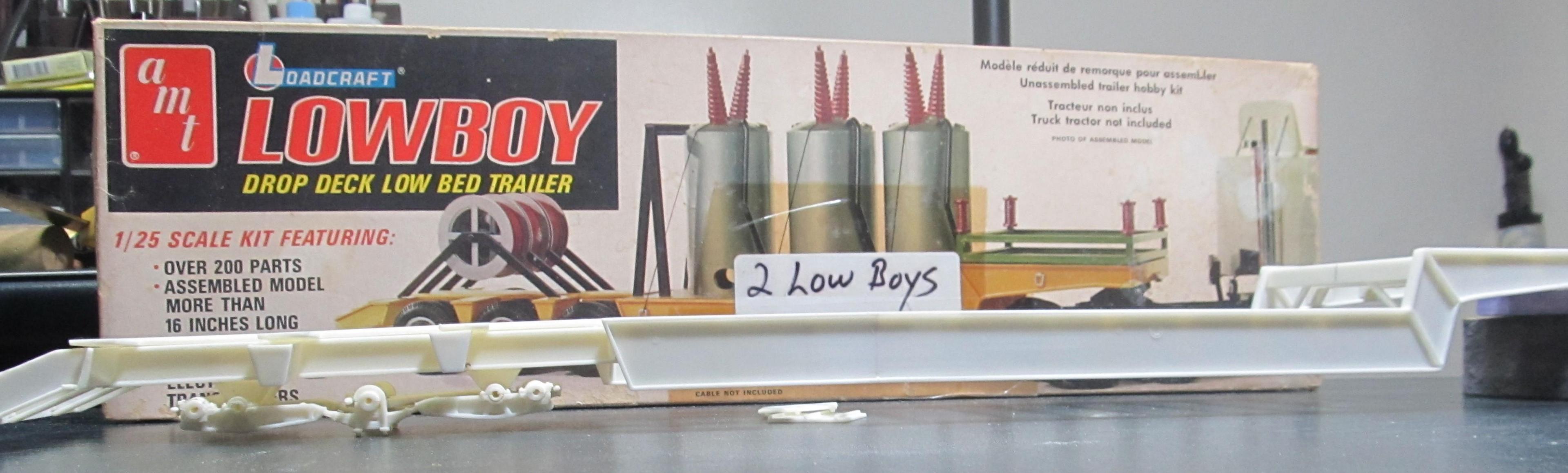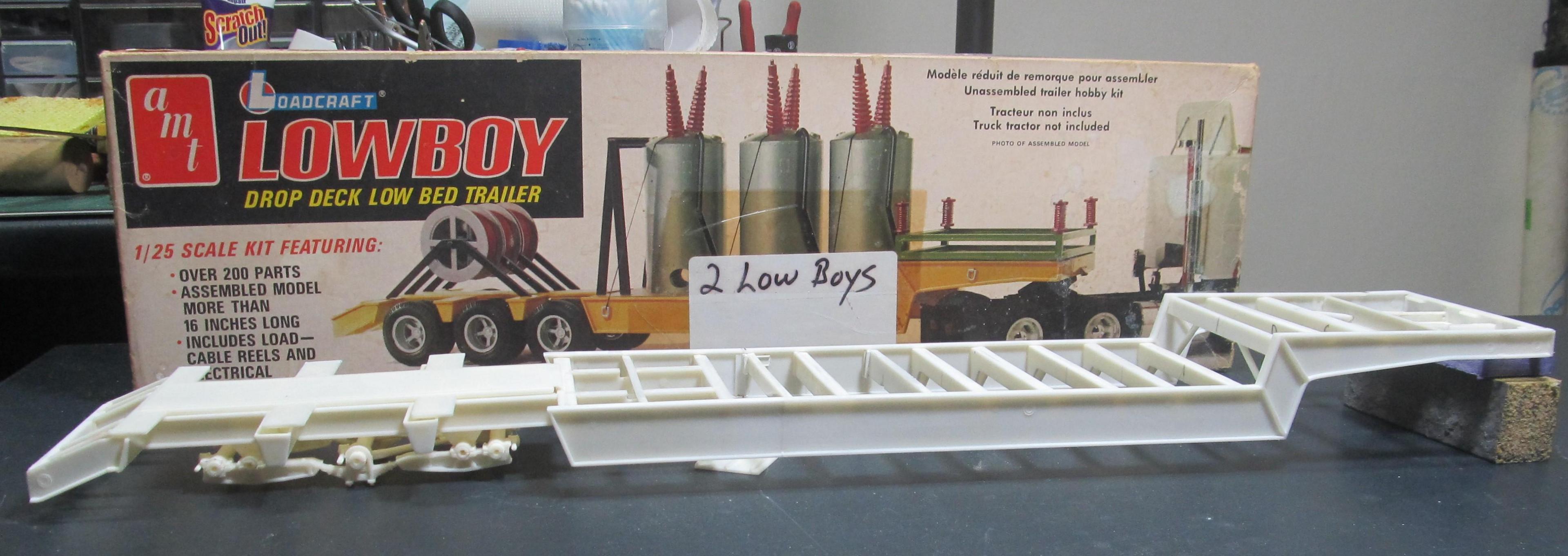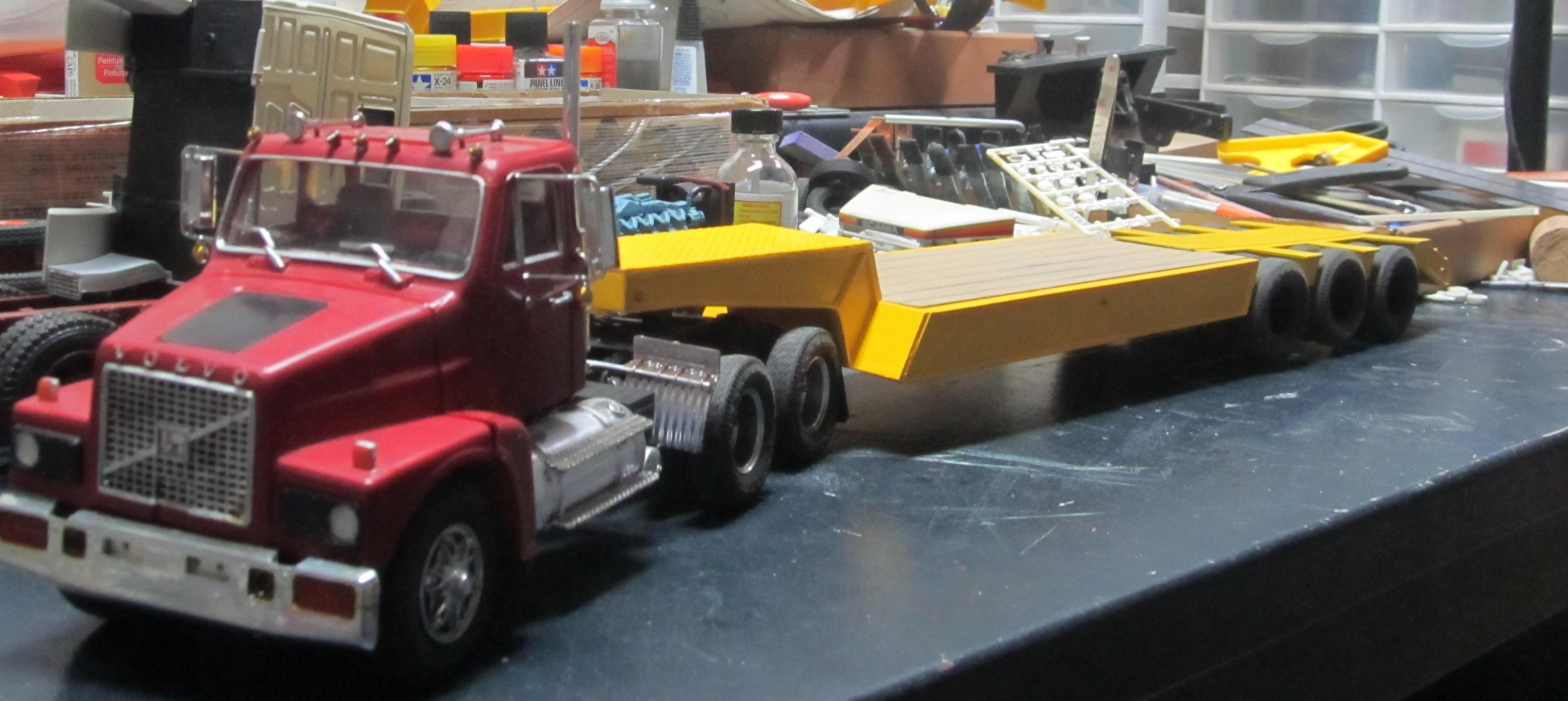 I built this kit many years ago . And I survived several moves in the last 8 yrs . I pulled this ERTL metal chassis Volvo out of a storage bin . It was a bit worse for wear. Having suffered a broken front axle . I repaired the front axle, put the mirrors and other bits back on . The lowboy is a modified AMT lowboy . It has a real wood deck .