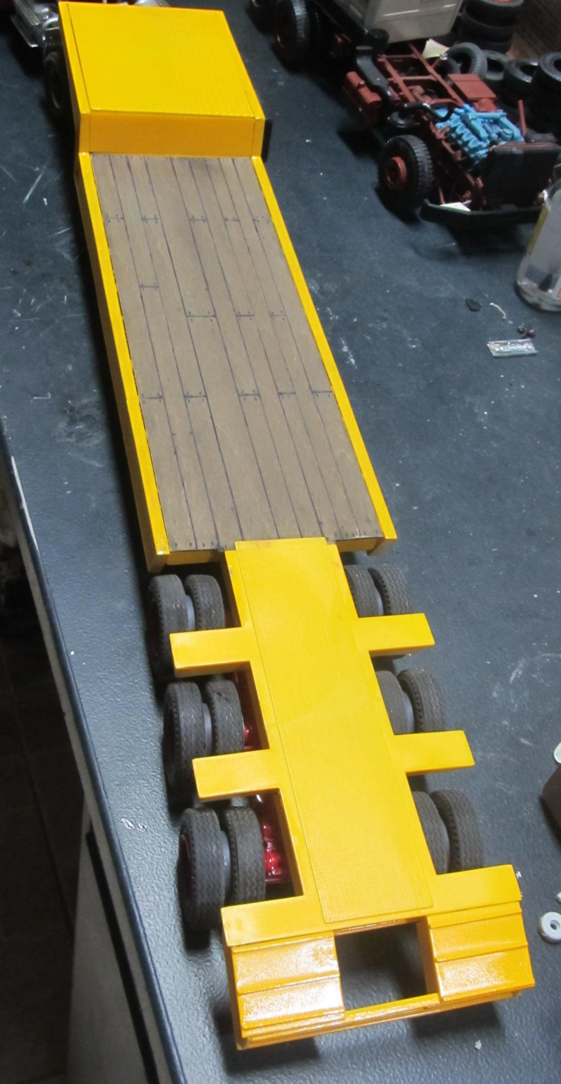 Got some more work done on this project. Went with a real wood load deck , and a diamond plate goose neck deck . Still need things like tie down loops and marker lights and some weathering . Be Well Gator -