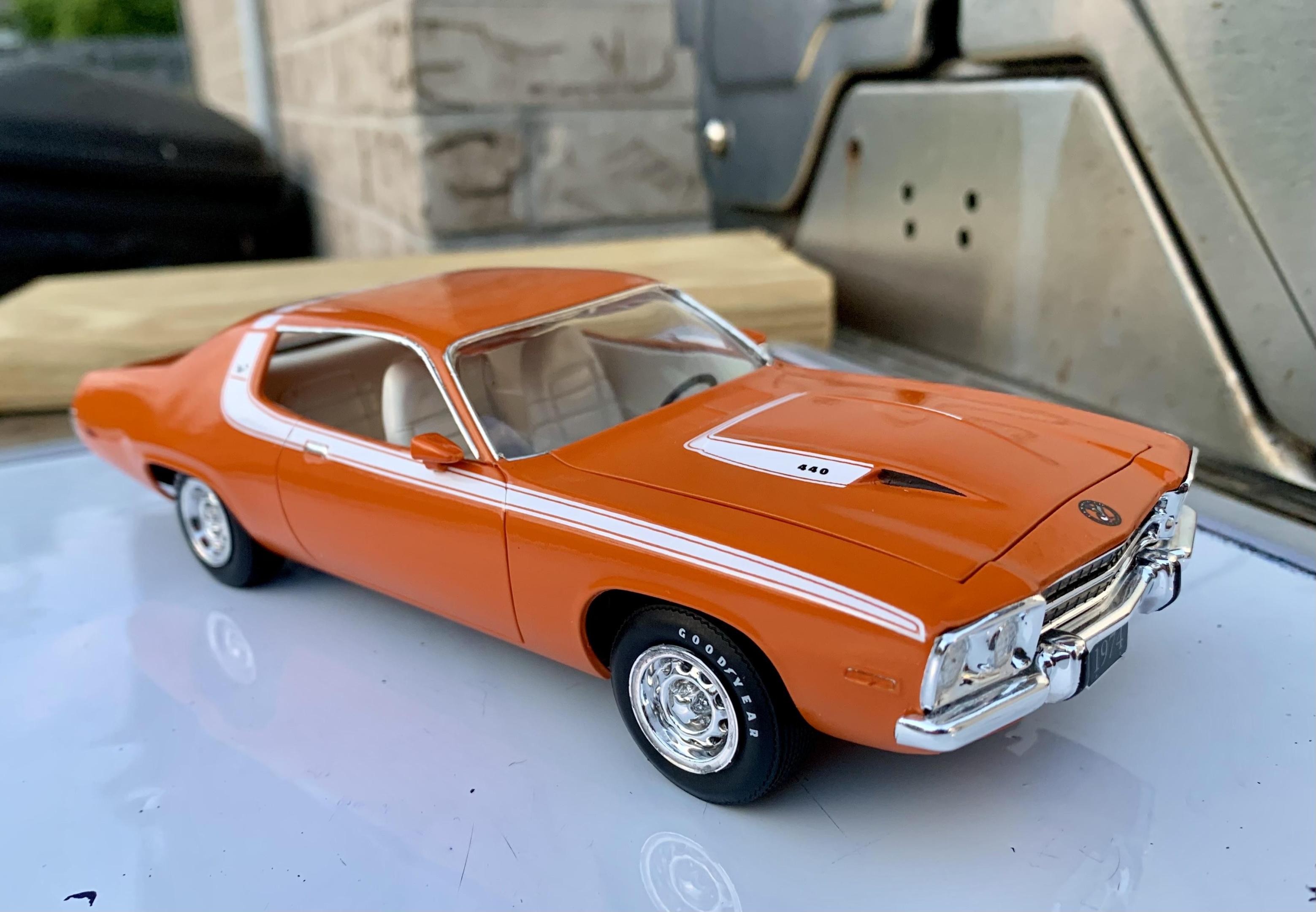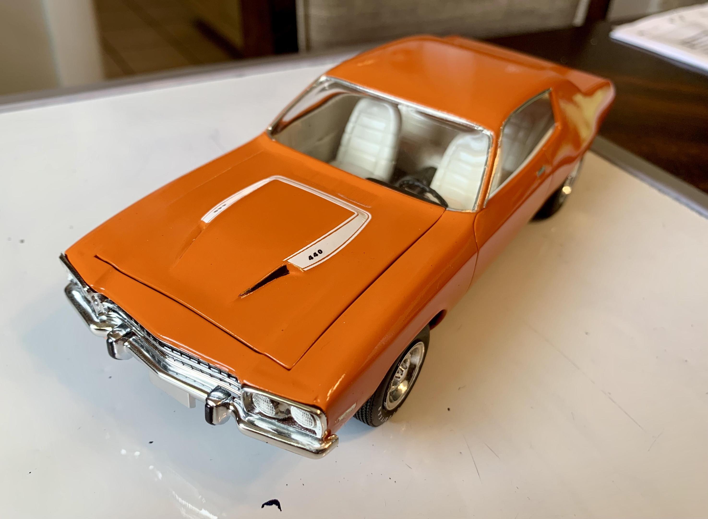 It's been a while since I've visited the forum, and a while since I've built a car. My wife bought me this kit, and thought I'd give it another go. I've already started some of it, so I'll jump in with a kit intro and where I'm at. I feel it's a pretty simple kit. A bit more cutting off and sanding of the styrene pieces than I'm used to, but all part of the build. I plan to model the kit around this car I saw for sale online (minus the rims). I always like the Mopar Orange color, and I happen to have a can on official Mopar Hemi Orange in my shed from another project. I primed the body first with flat white and gave it two coats of hemi orange, and did a slight wet sand between the coats. Also, started with some of the wheels. I'm getting paint on various parts on the tree and assembling the engine next.