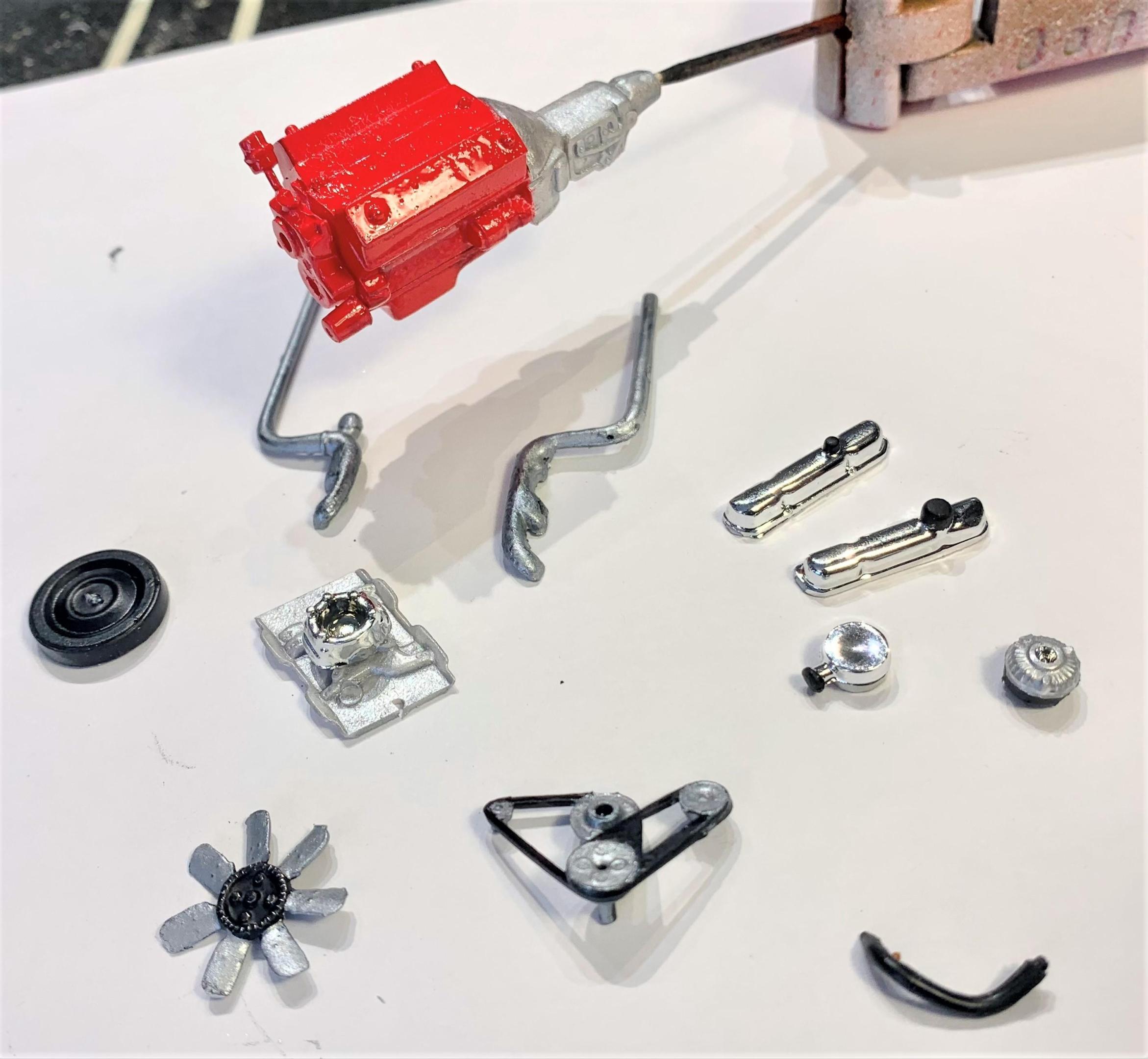 I started some sub-assembly and paint on the engine parts. I decided to go red on the engine instead of the traditional hemi-orange (since body color is that). I like the look of red on orange, still need to paint a few items on the engine. Painted most parts either aluminum or flat black, I didn't leave much chrome except a few pieces. Hopefully the assembly of it will look good.
