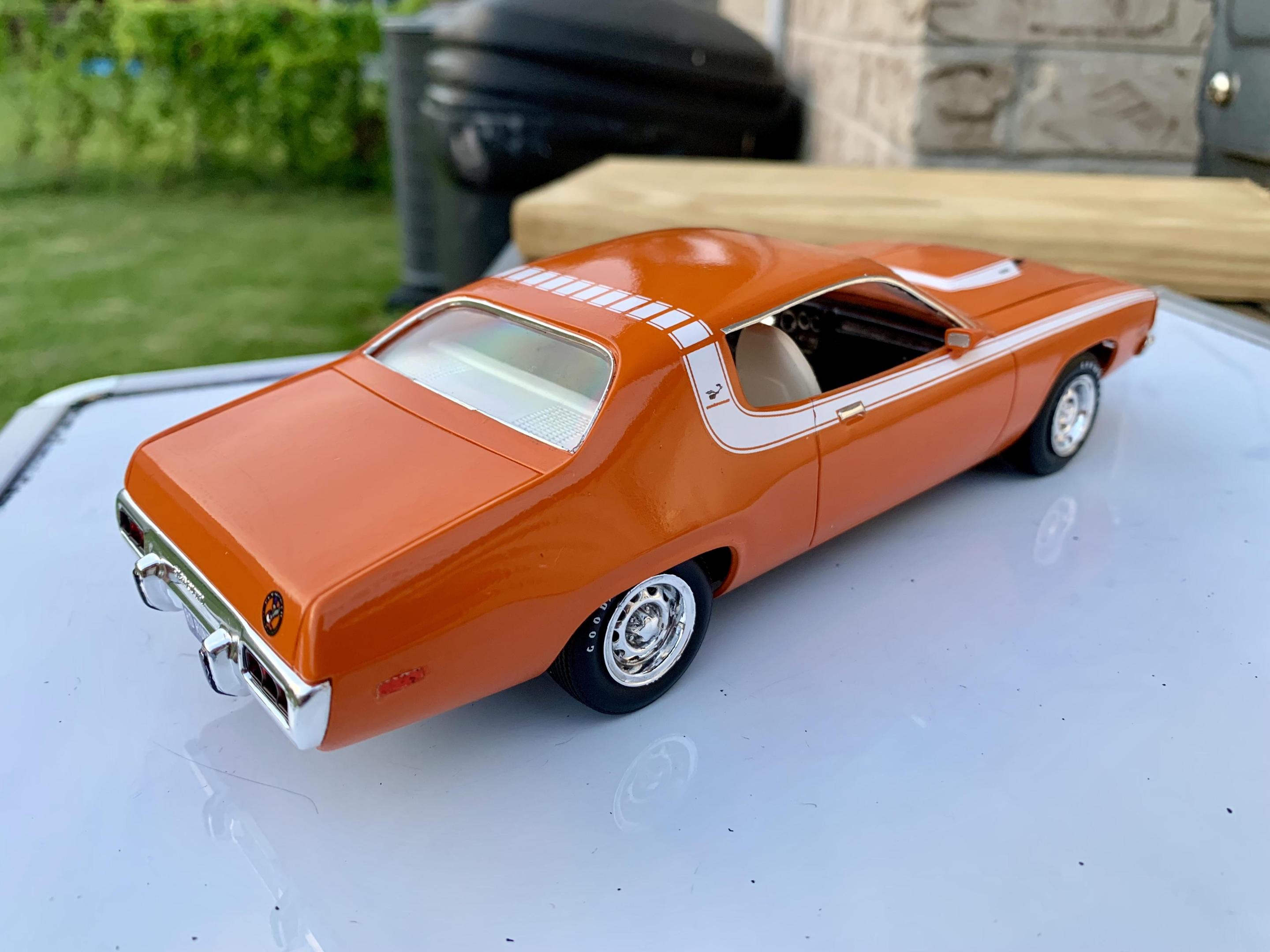 Hi guys, been a while since I've been on site. I've got the bug to start building again, but I wanted to concentrate on something new. Weathering and Rust. So, I decided to take my left over Monogram 71' Satellite (That I bought just for the hood for my Road Runner) and make it a junkyard card. I'm doing this on the fly. I haven't planned out how far I'm going with it (broken glass, flat tires, etc...) and literally just learn how to rust yesterday from watching videos. I tried the salt method. It was how the body turns out to decide if I'm going to continue. So, here is where I am now, and any critiques or comments on rusting I'd appreciate. Paint the black body rust color primer and washed it up with some lighter rust and black Applied the salt to the water spots I made, could have broken the salt smaller I know. And here is where I am now
