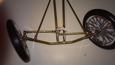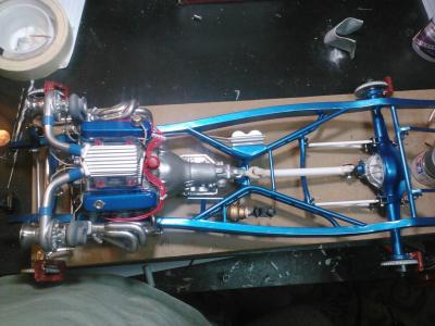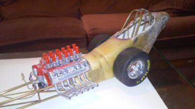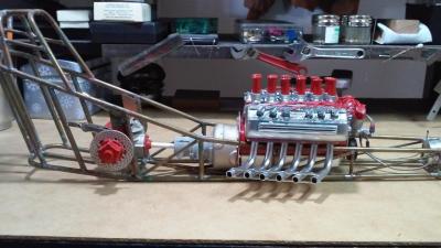 Ive been working on this off and on for about a year..The chassis is based on a 220" wheel base.. Its an old school new/ school build...old school power and a few modern upgrades...The engine is a "Big John " Hockney resin "Lincolnstein" V-12 with Ardun heads and fuel injection, scratch built the oil pan,dual mag set up, fuel pump and zoomies..TDR supplied the 9" and lenco as well as the clutch can and rear brakes .. Ive ordered some ET's from Micro Nitro and they should be here in a few weeks.. The body is fiberglass and is currently being puttied and shaped and should be in primer in about a week...It measures just a tick under 32" long.. Im hoping to get hot and heavy on this soon (gotta get over this crud first) ..Hope to complete it by May of this year...
