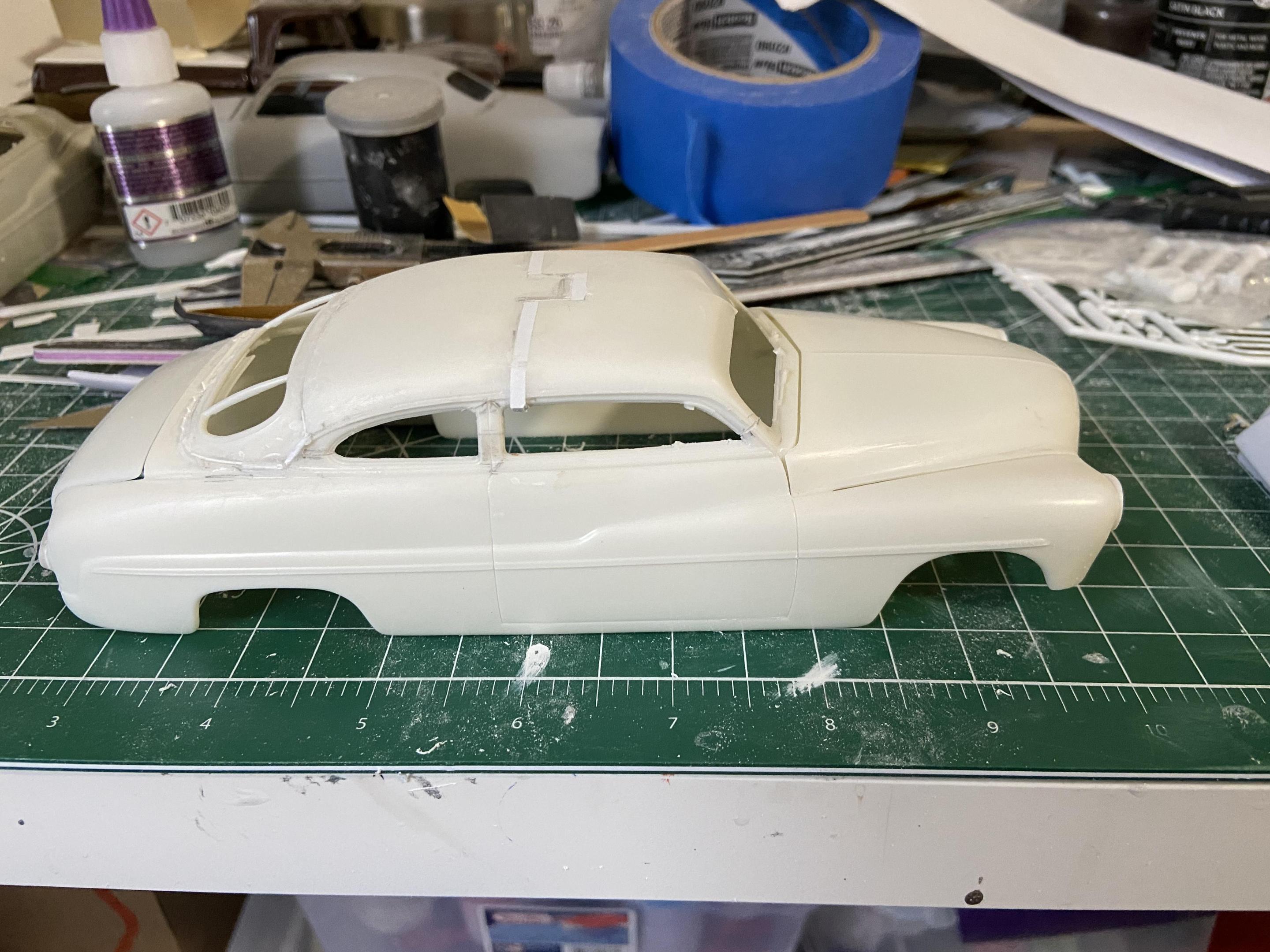 I decided what I needed to do is do a wedge chop. I cut 2 mm out of the C pillars and about 4.5 mm out of the windshield posts. I kept the back window stock height. Cheers