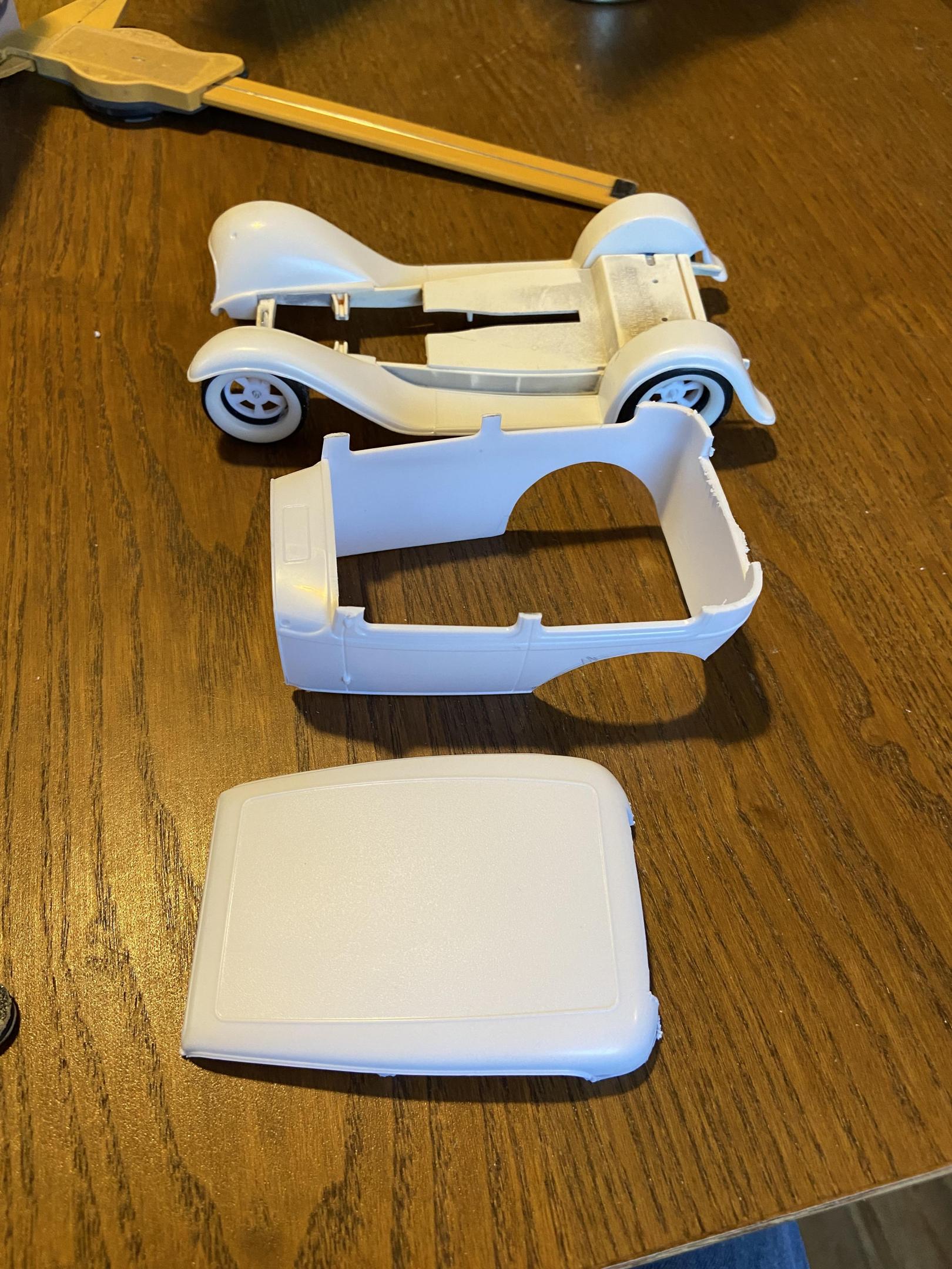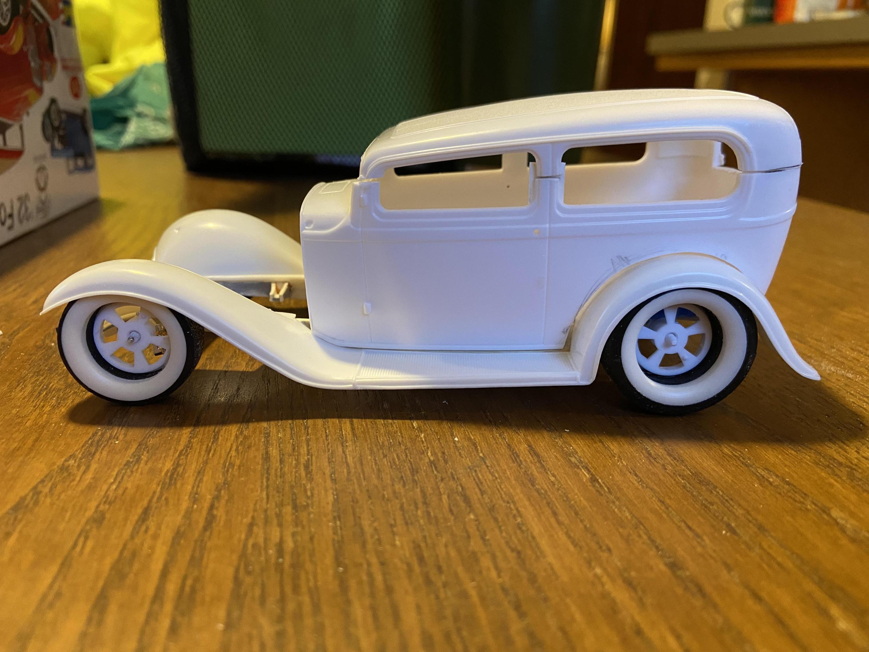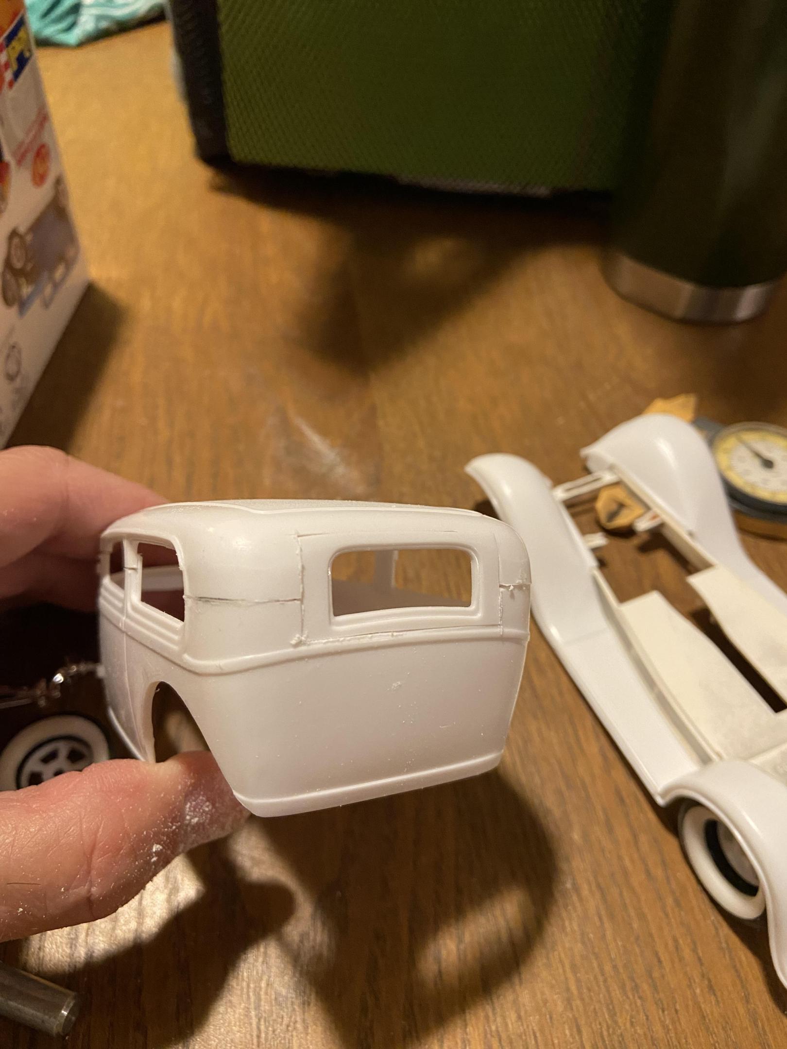 I’m having to start over. My first attempt failed because the body was from the old Revell re-issue of the orange crate and the condition of the body was not good. So I did manage to find the more correct 32 Ford.Tudor to use. It’s not going to be an accurate representation of the Lil coffin, but it will serve as my inspiration.
