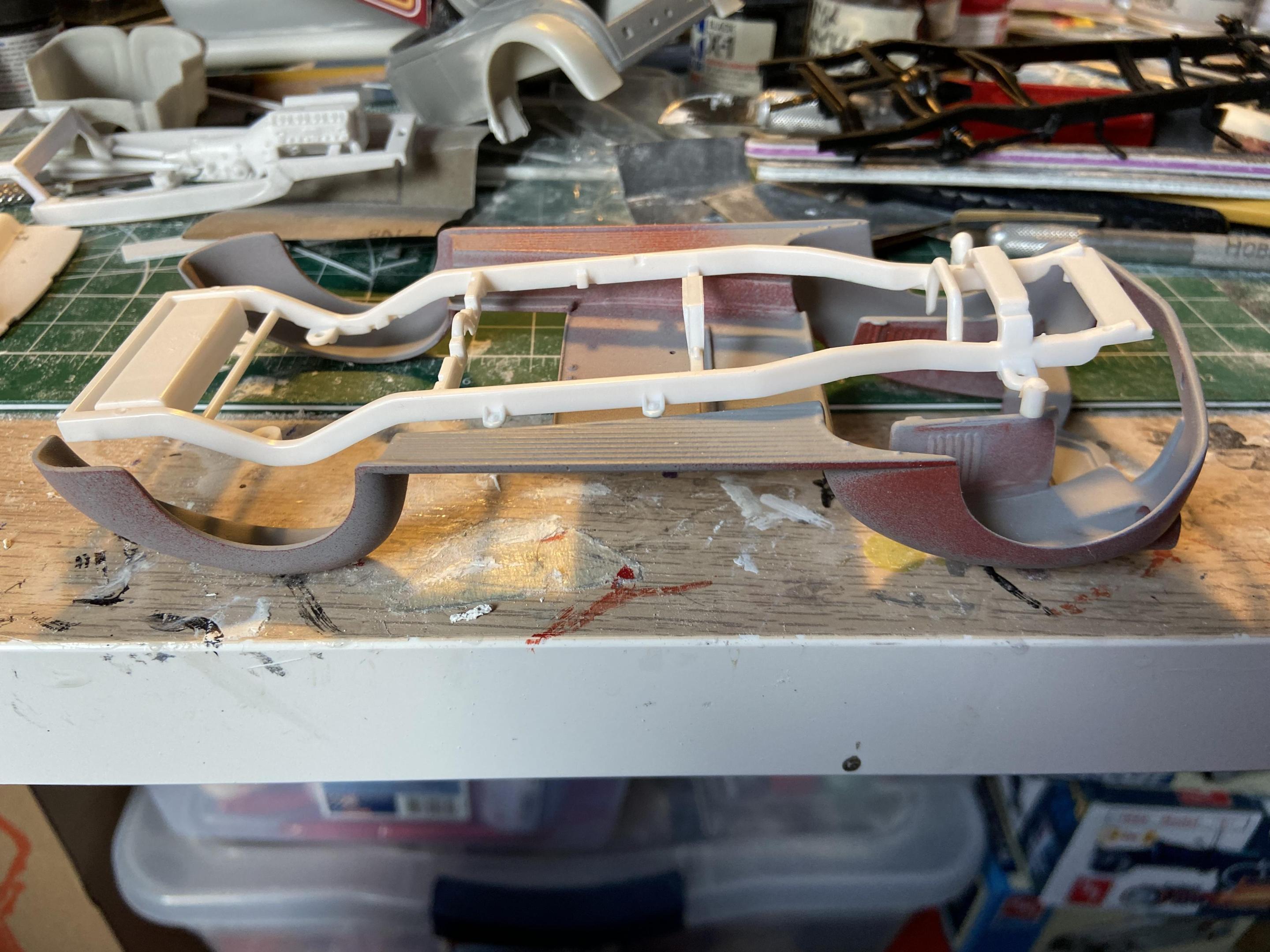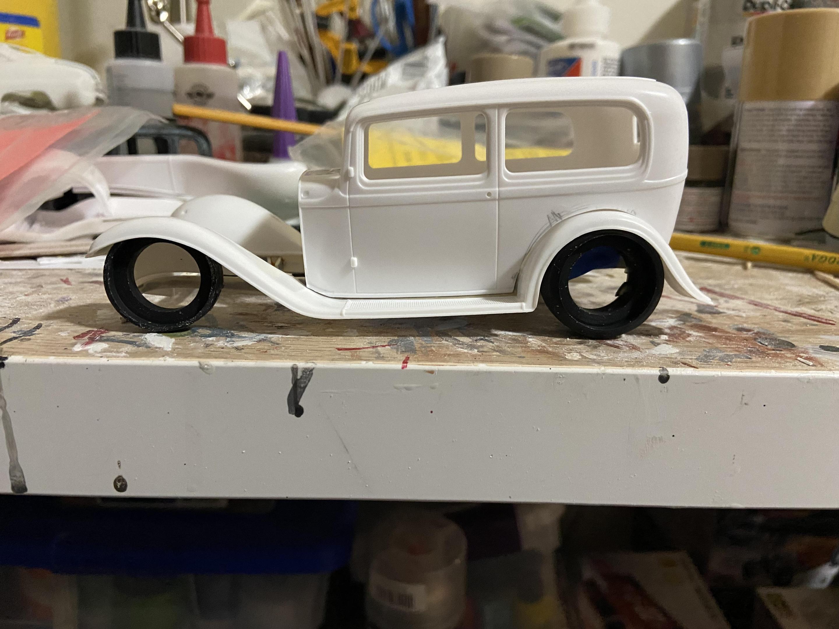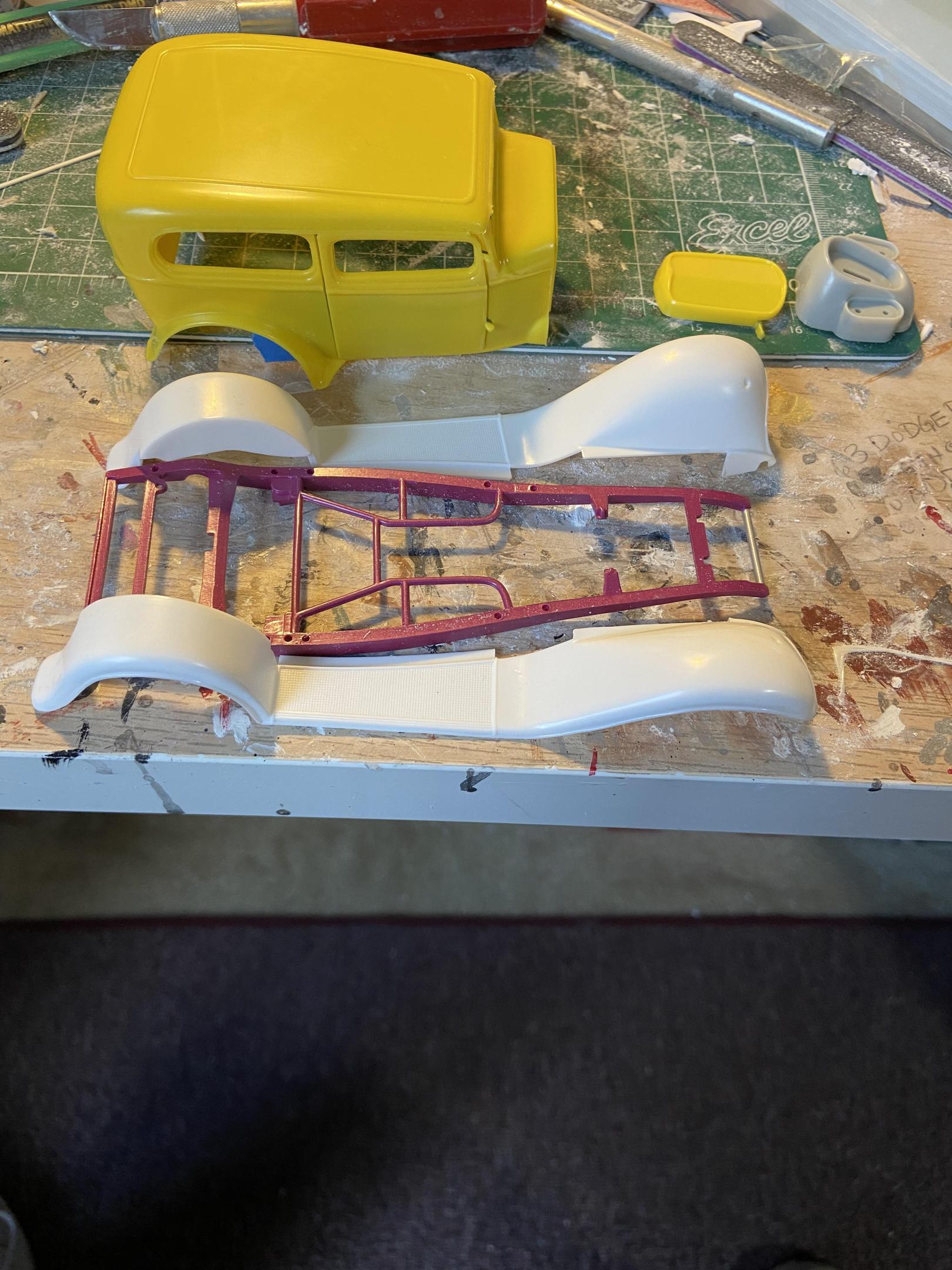 I’m having to start over. My first attempt failed because the body was from the old Revell re-issue of the orange crate and the condition of the body was not good. So I did manage to find the more correct 32 Ford.Tudor to use. It’s not going to be an accurate representation of the Lil coffin, but it will serve as my inspiration.