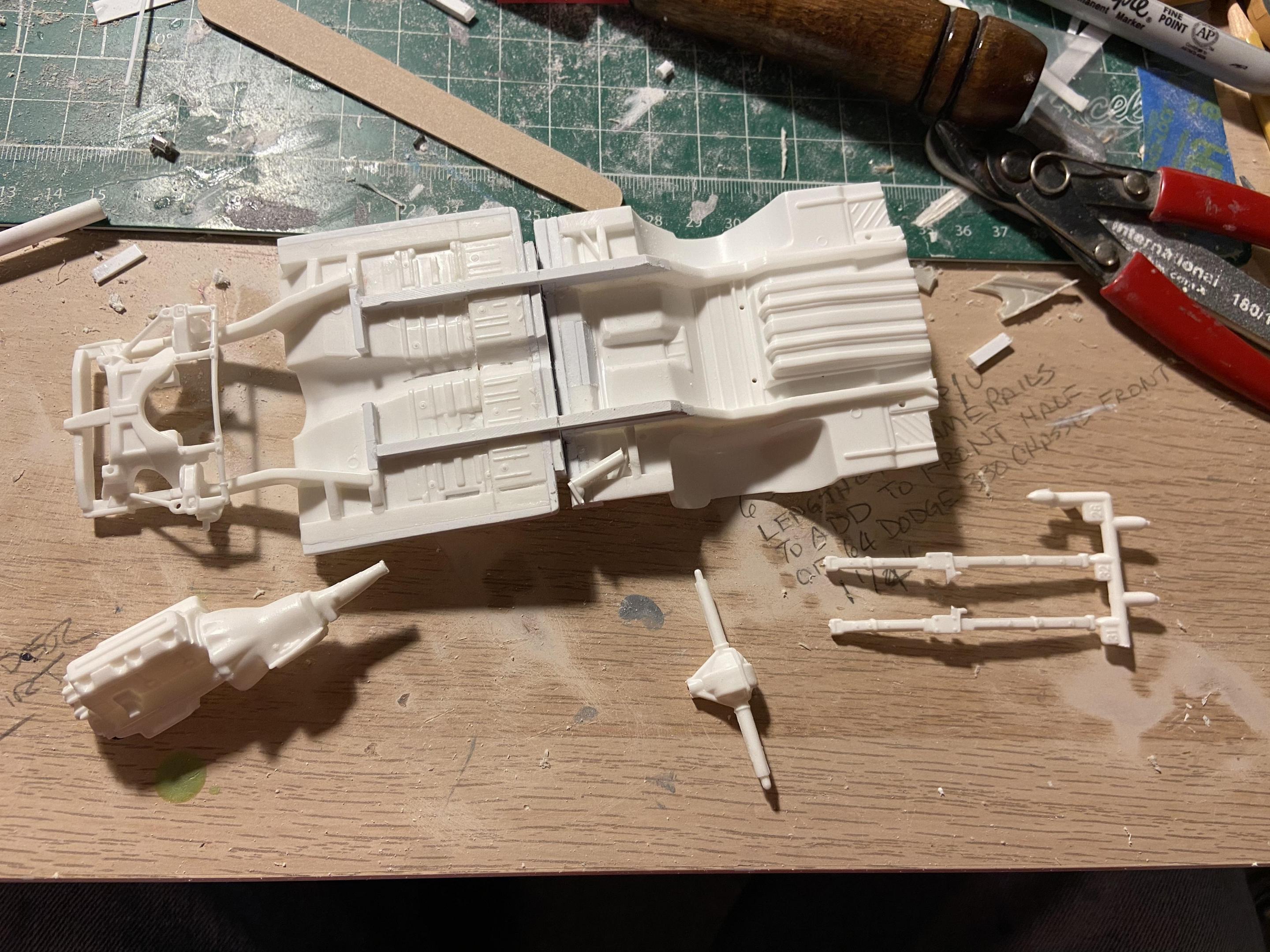24. Update: I finally got back to this - been busy the last few days. I got the chassis pan and frame glued up. It looks a bit ugly but it will do the job. It almost looks like something Roadkill would do, Ha ha ha. I’ve lined up a few of the other parts from the Dodge 330 kit. But there is a lack of some detail. I’ll see if I can make this work still. Rind to think of wheels and tires. Cheers.
