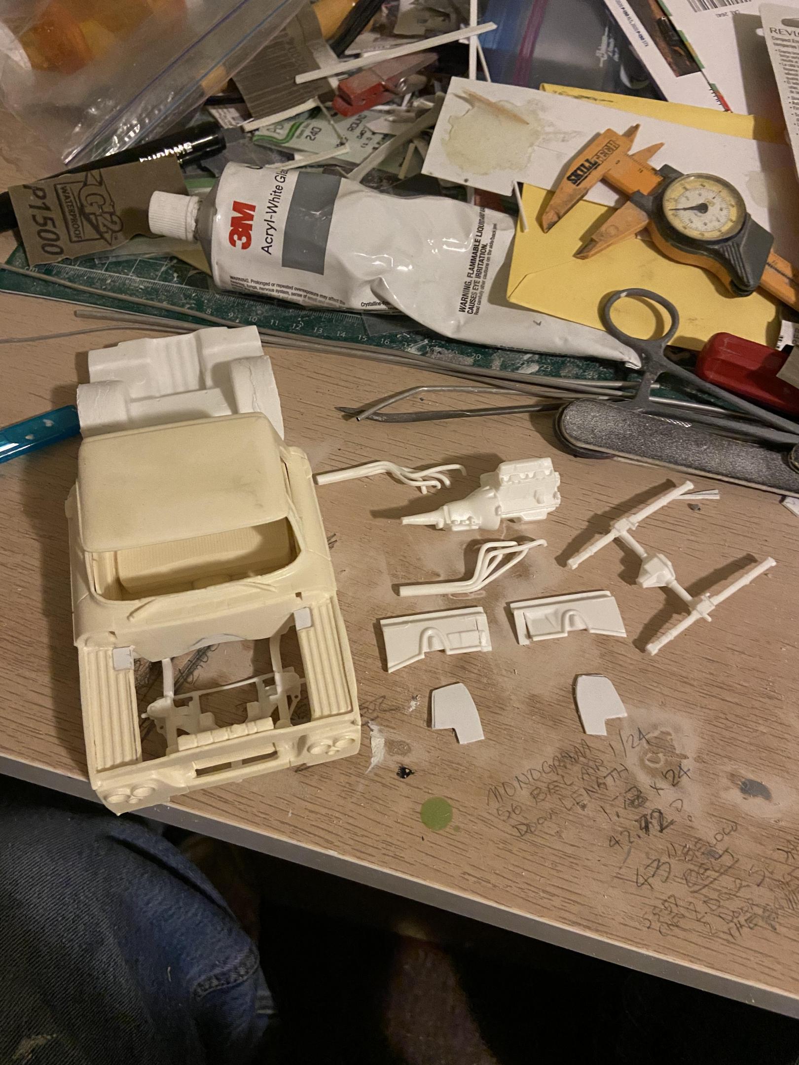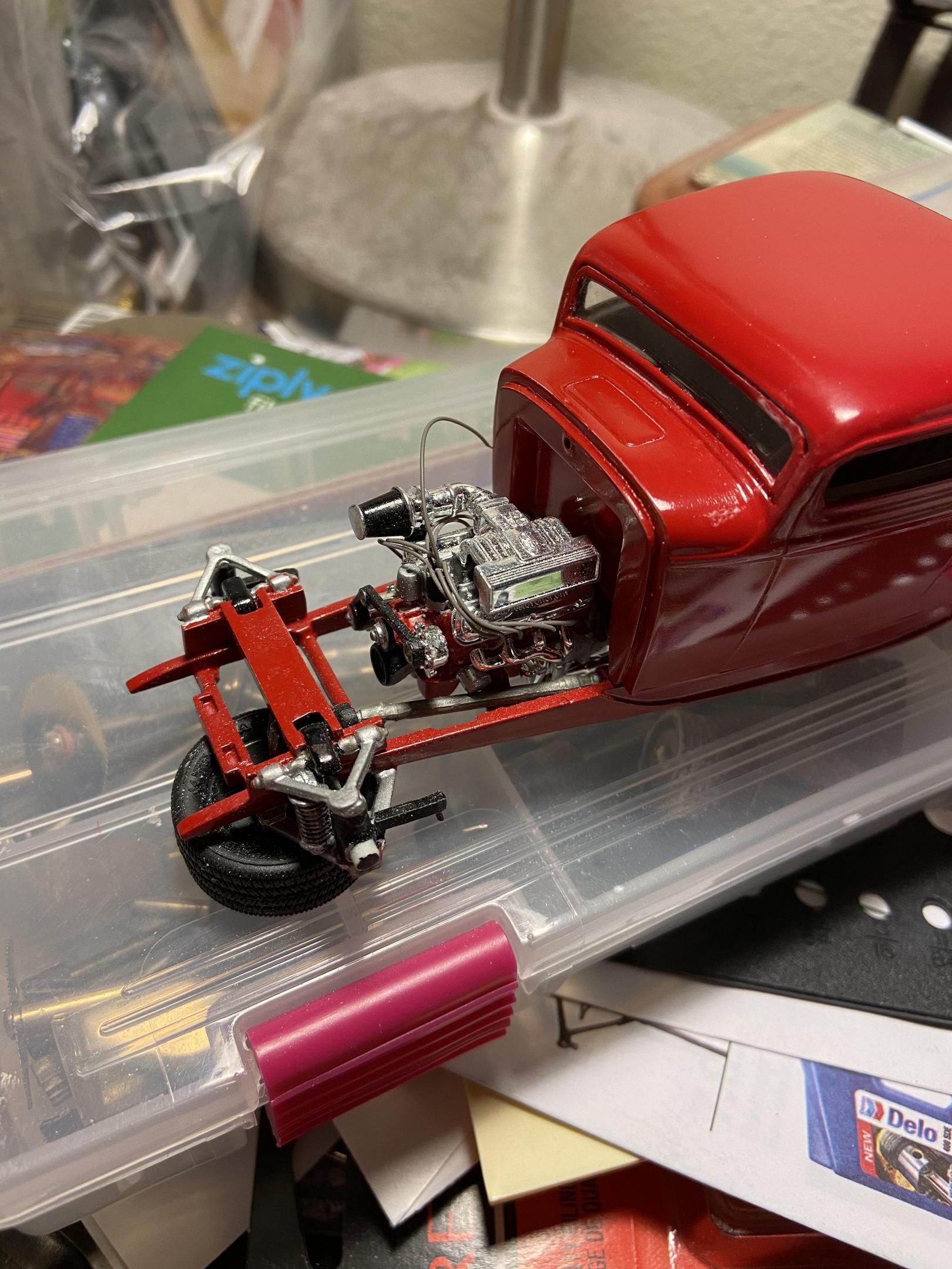 15. I have started this as a challenge build on Facebook and I thought that I would share it here too. On Facebook there is a 4x4 challenge and all the moderator requires is that all four wheels are driven, so this is my entry, I’ve always wanted to do this and now I found the excuse. The inspiration for this build is the Summit Racing Quadradeuce. I am using the Revell 32 5 window coupe. The roof has been chopped. The frame’s wheelbase has been extended to roughly 114”, the rear of the frame has been modified too. Front A-arm suspension and rear differential & suspension is from the Smooster kit. The front differential and transfer case is from the AMT 97 Chevy Blazer. The engine is from the Revell 32. The front hood nose piece is from the 37 Ford Pickup (the latest release). Hope that y’all enjoy, cheers.