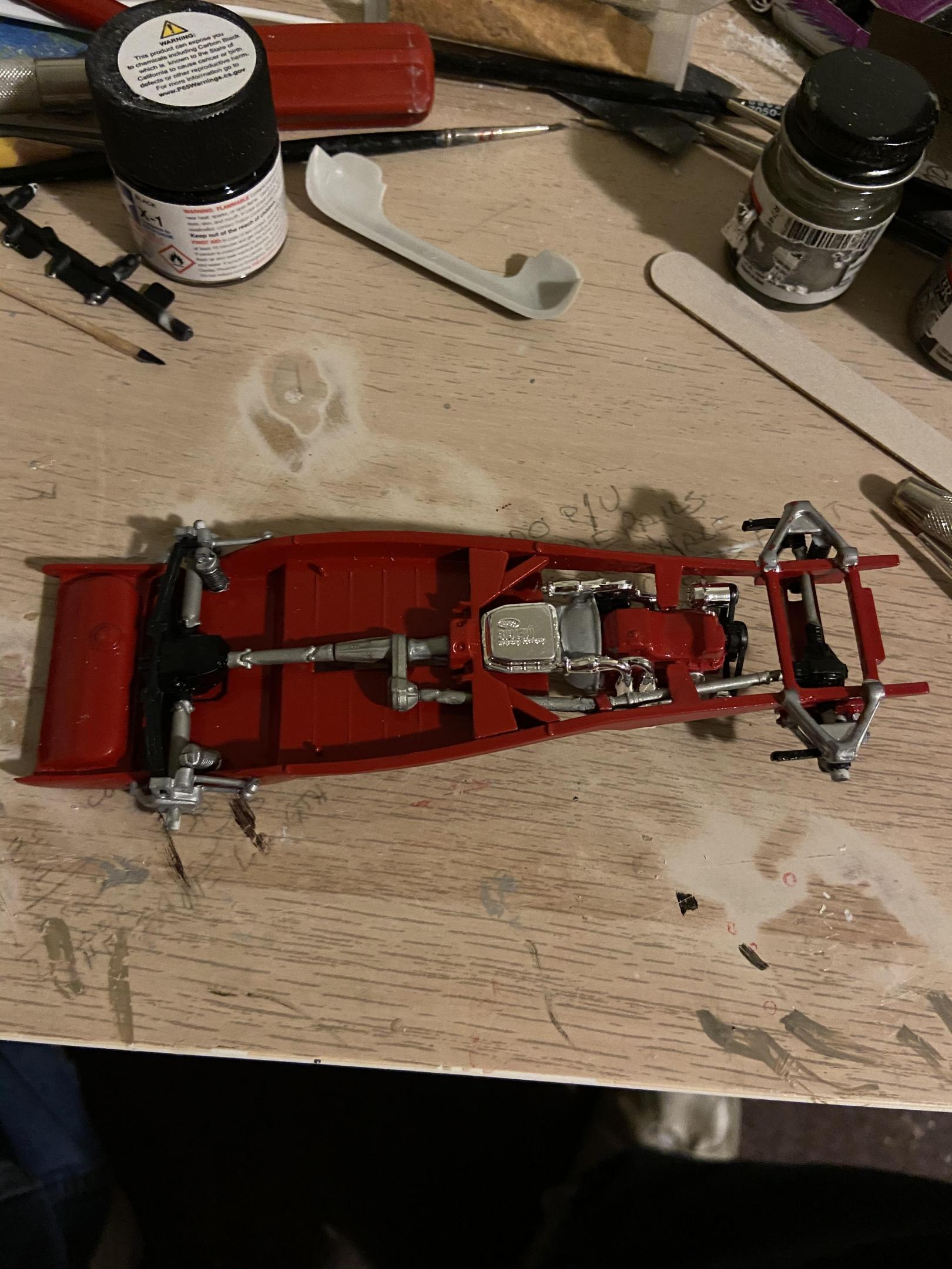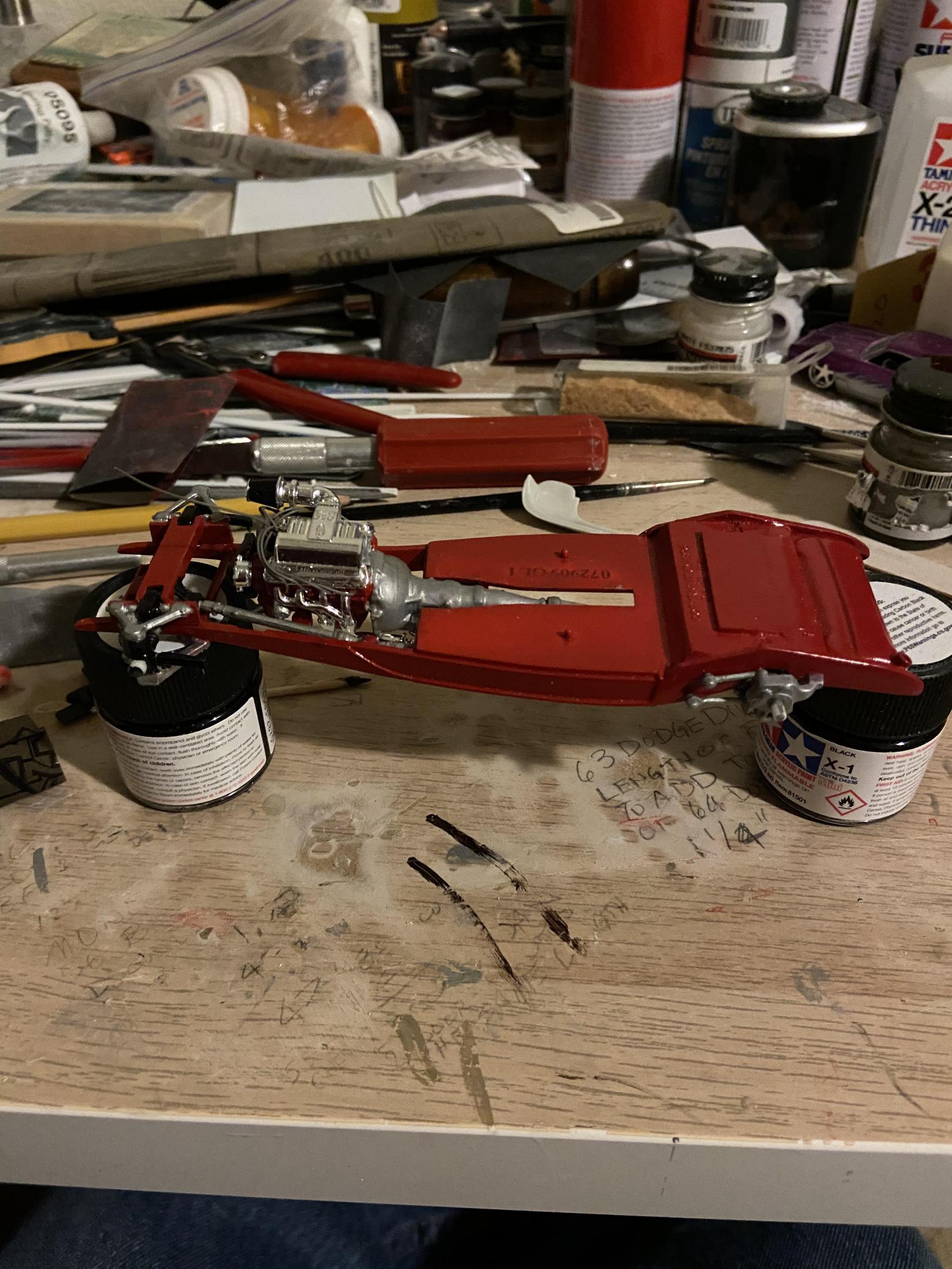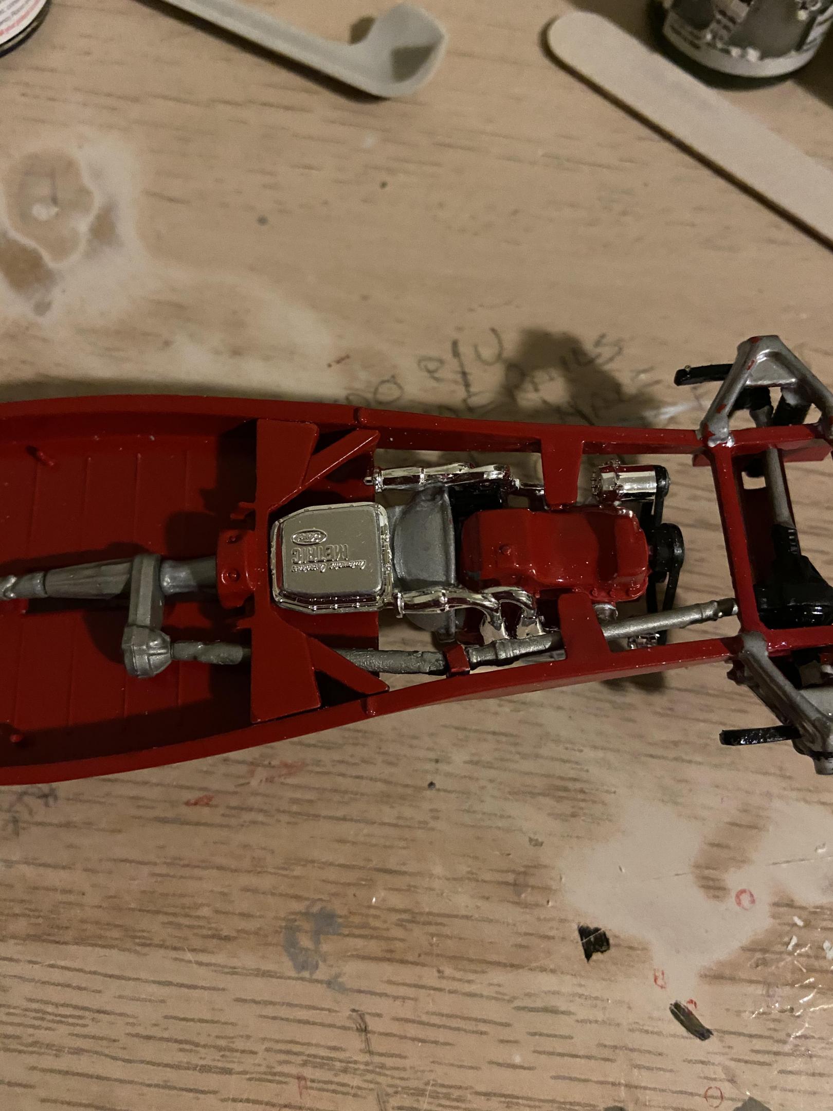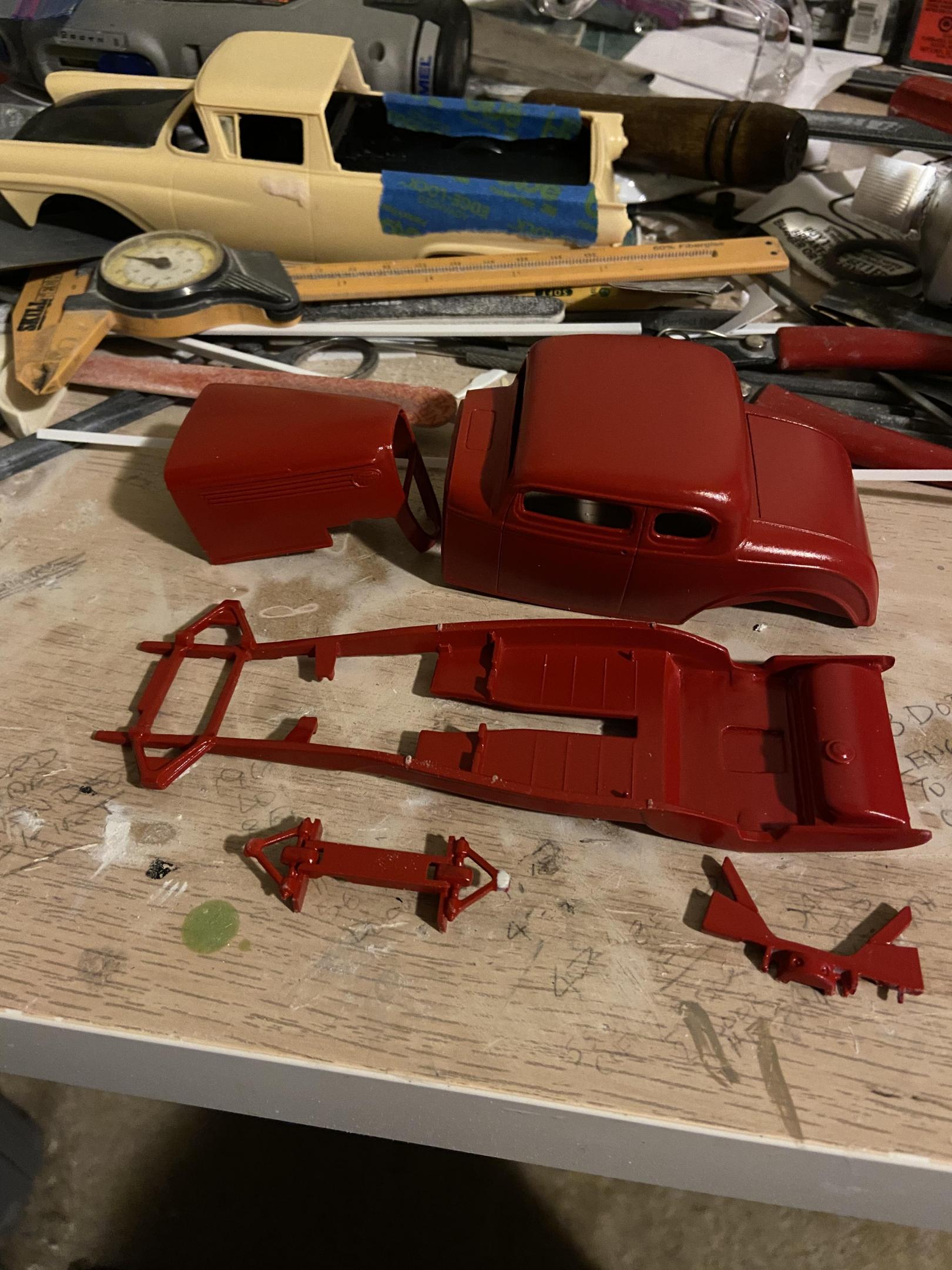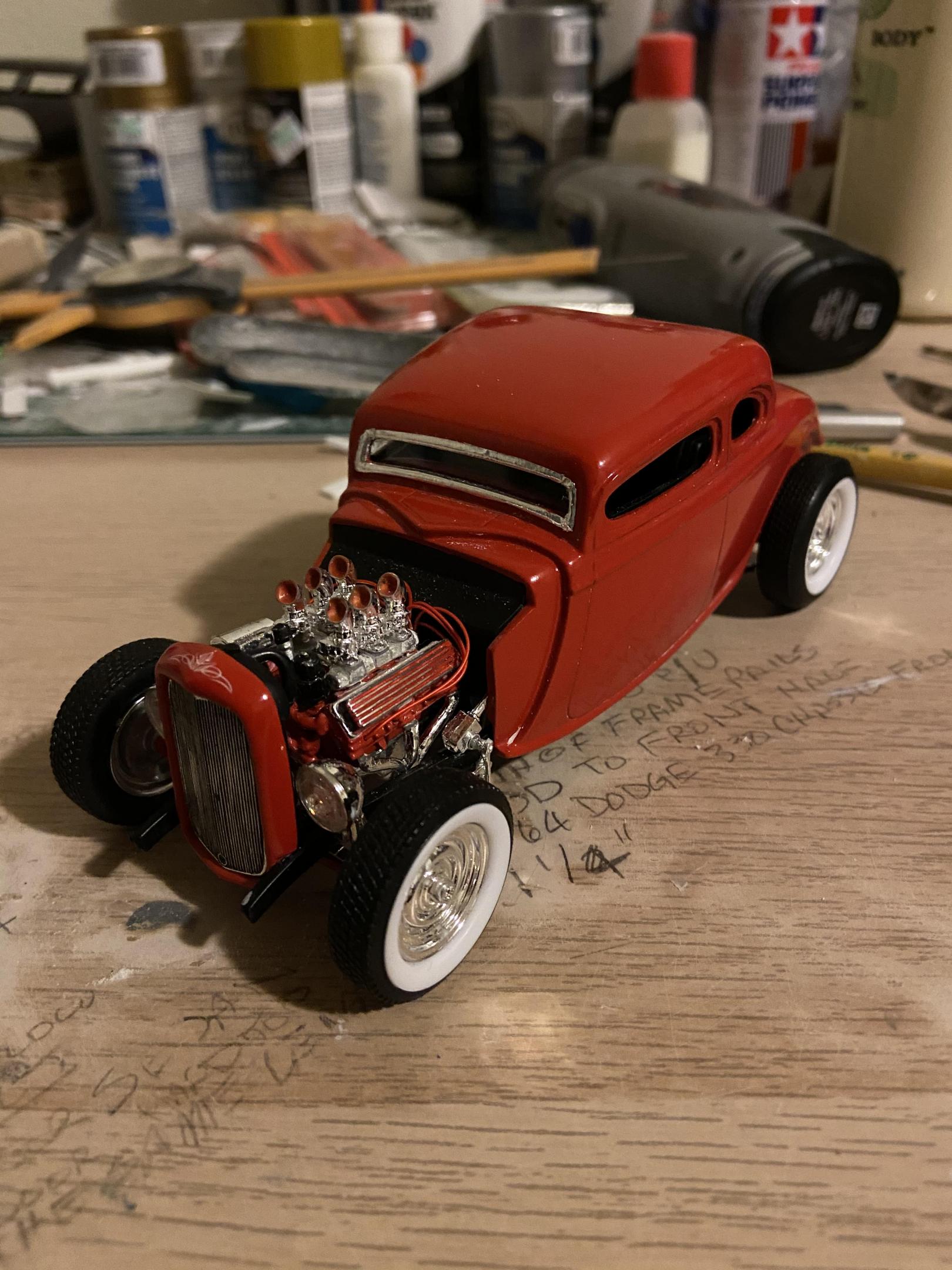 9. Update: My apologies for not keeping things updated. I have been rather busy. The first three phots is what I had to modify for CD a radiator. A Revell 29 Model A gave up its radiator shell and the shortened radiator for the optional channeled rod were modified to fit inside the hood. The last photo shows the painting process so far. I have interior to think of. Thanks for all the kind words Y’all. Cheers