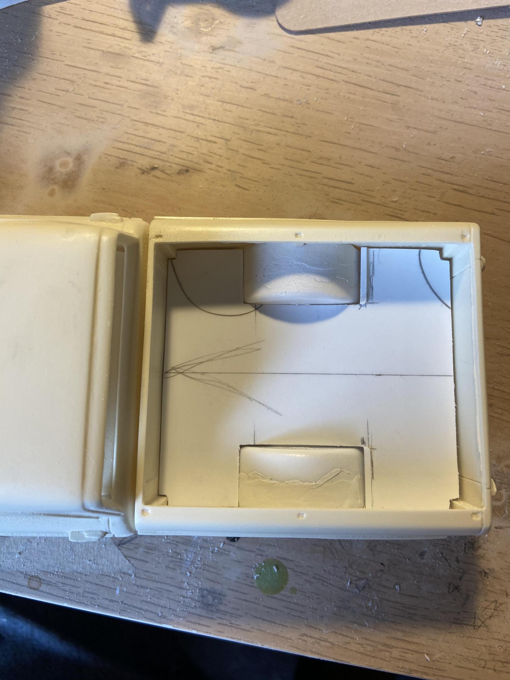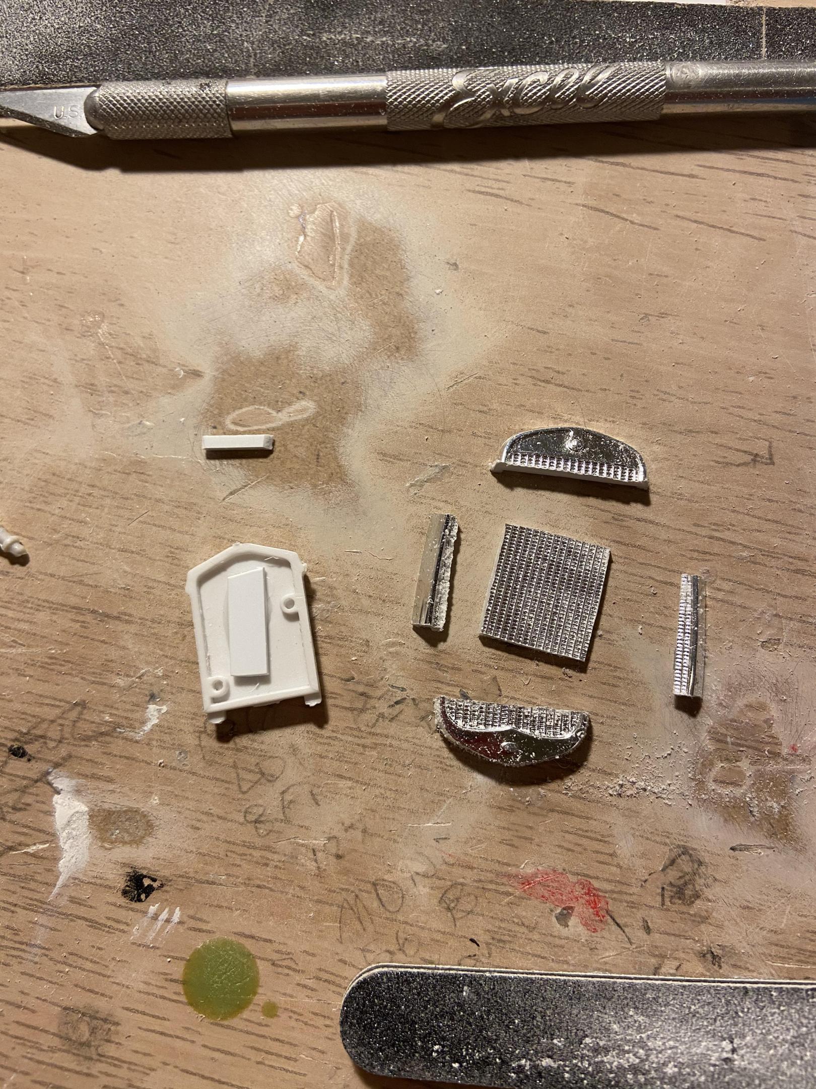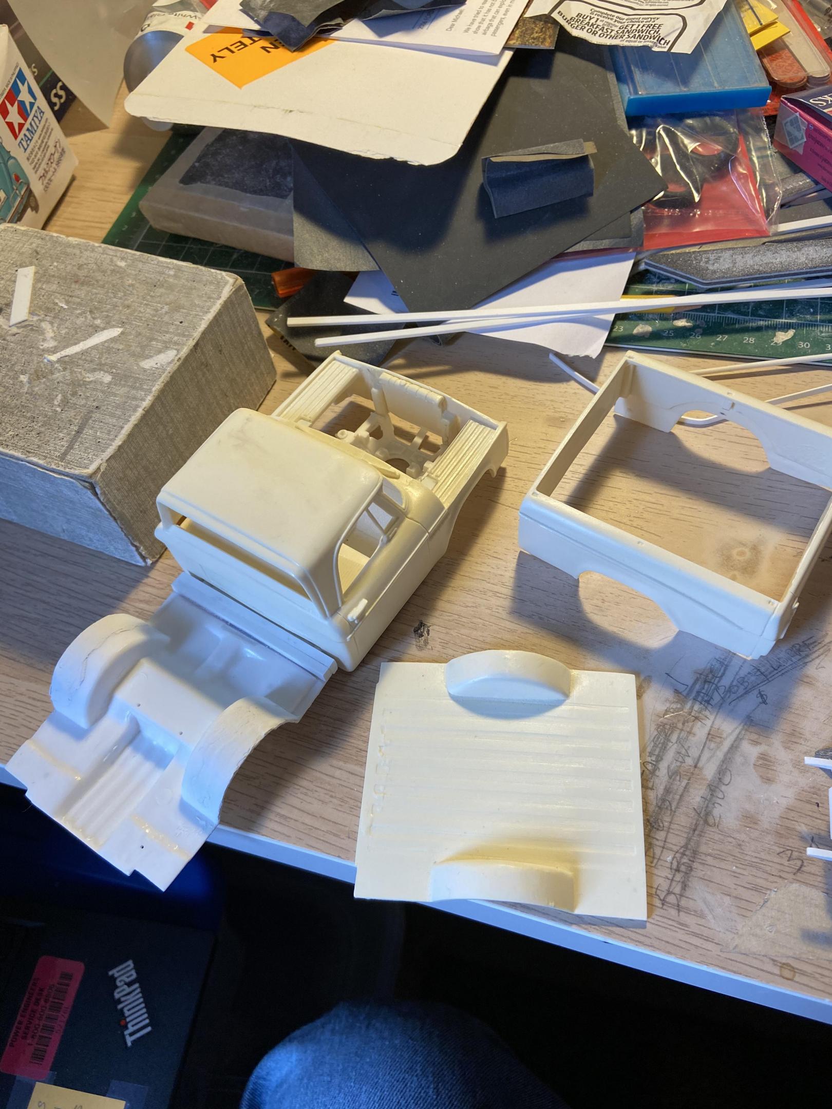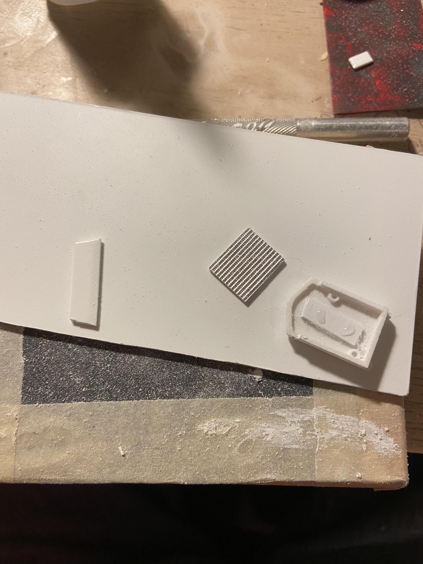17. It’s been quite awhile, my apologies but I’ve been rather busy on some other projects. I had to spend today making the truck bed floor. I took the resin bed floor and cut it up to fit the tubs and such in the back, next I cut a fresh sheet of Evergreen 040 to size. The fit is okay but not the greatest. I may need to redo it. Got to think it over. Things are moving ahead, soon to start thinking about paint colors.