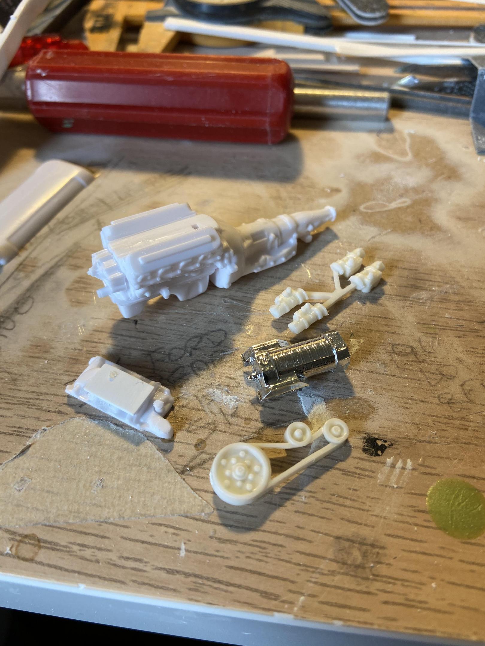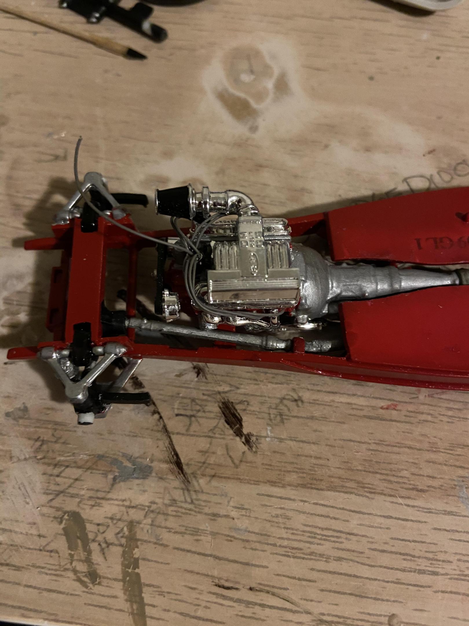 21. Update: Sorry to be late on this, I’ve been busy on other things. Some more of the major assemblies are done. The 426 Max Wedge is assembled and spark plug holes drilled, long tube headers are built and yes they will fit. I took the donor kit’s inside wheel wells and trimmed them to fit inside the engine bay- yes they fit like a glove. Lastly I did have to make some inside fender pieces, the resin body firewall leaves a huge gap. I’ll be gluing these in during the assembly later. Time to start thinking of colors to paint. Hope that y’all like it. Cheers.