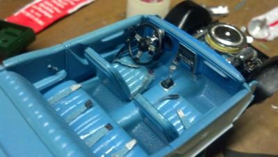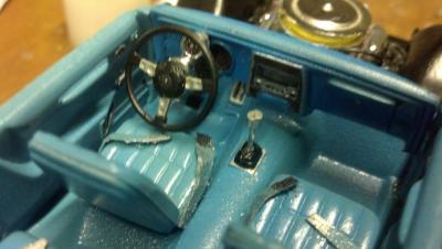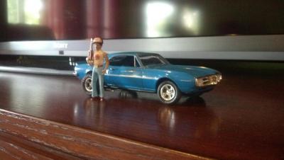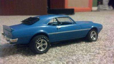 My grandma bought a 67 firebird 326 H.O brand new. It ended up being my dads first car. We still have the car now. When he drove it in high school he added rocket wheels, power steering , a later model trans am tilt wheel , a spoiler, and traction bars. I started this build with a revell 68 firebird a had to make a lot of parts to convert it into a 67 model. Also a lot of parts came from my parts bin. I wanted to make it the same way he had in the 80s. The paint is model master bright light blue exterior and a blend of model master bright light blue and Pontiac blue interior.