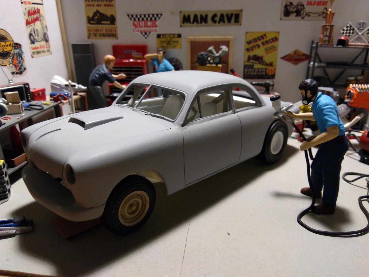 Since the molded in taillights had been sanded off, I needed something in the back since it looked soo blank..I decided to add in the custom taillight housings from the 50 convertible kit..they are a little too long , so I cut the solid ends off to shorten them down closer to the body. The taillights will be fitted into the now hollowed openings..it was at this point I decided to stay with as many 49/50 kit specific parts as possible. I set the build in my garage Dio for fun showing my mini crew hard at work on it..