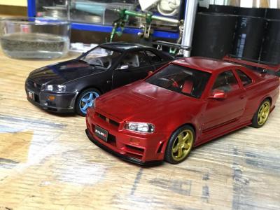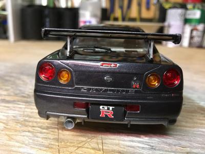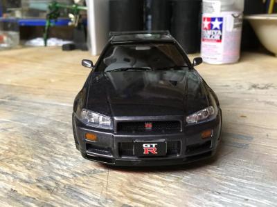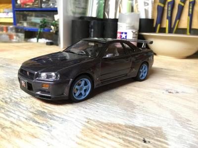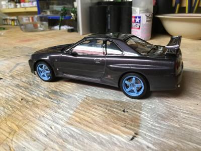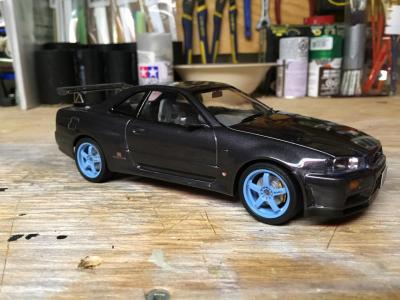 Another tamyia curbside kit. This was a really fun build and I finished this one in probably half the amount of time it took me to do my first R34. for the body I sprayed it with tamyia gunmetal (Ts-38) I took a few other few modelers advice from the site and painted the trim black on this one. I used Bmf around the tail pipe, I also cut the gaps between the backs of the headrest of the front seats out. it has 3 coats of clear , ( 2 mist , 1 heavy) Im really happy with the finsih ,I know it's not show quaility but for sitting on my self it's perfect, I got a hair on the bonnet I manage to get it out of the paint but it also pulled some of the sparkles out of the paint so there's a bit of a "swirl" but you can barely tell and I'm happy with it , any questions or postive criticism are very welcome .hope everyone enjoys