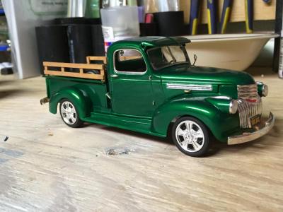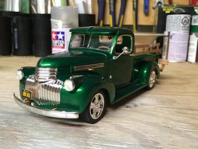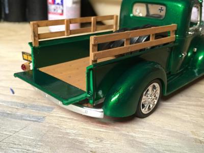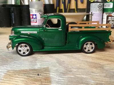I have to say this would have to be proably one of my favorite builds. The build the entire time never seemed to give me to many issues. the kit went together fairly nice other then a few problems with Lineing up the front hood. I sprayed it with testors one coat lacquer (mystic emerald) I can't count the amount of coats of paint I put on this sucker 2 100ml cans of spray later and everything was painted and ready for assembly , the bed was finished with testors natural wood ( the bottle I have is from Id say 20 years ago) but still works great after 30 mins of shakeing it furiously, I made my own disturbotor and added a few fuel lines to the bay , I'm still learning the ins and outs on engine detailing. this was my first adventure using bMF and the stuff seems pretty easy to use just takes a bit of patients hope everyone enjoys , questions and positive critism are very welcome