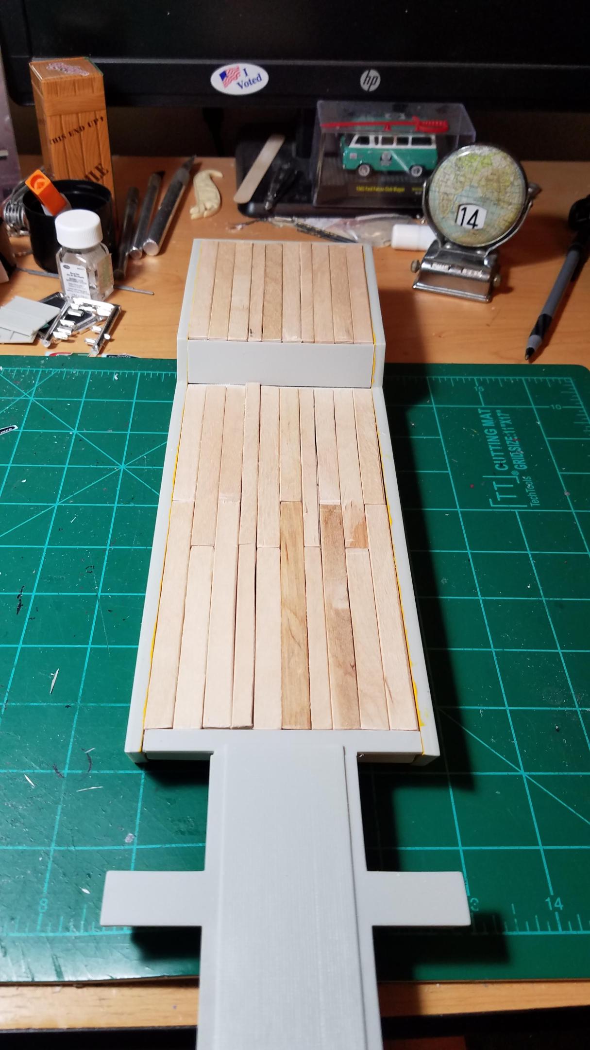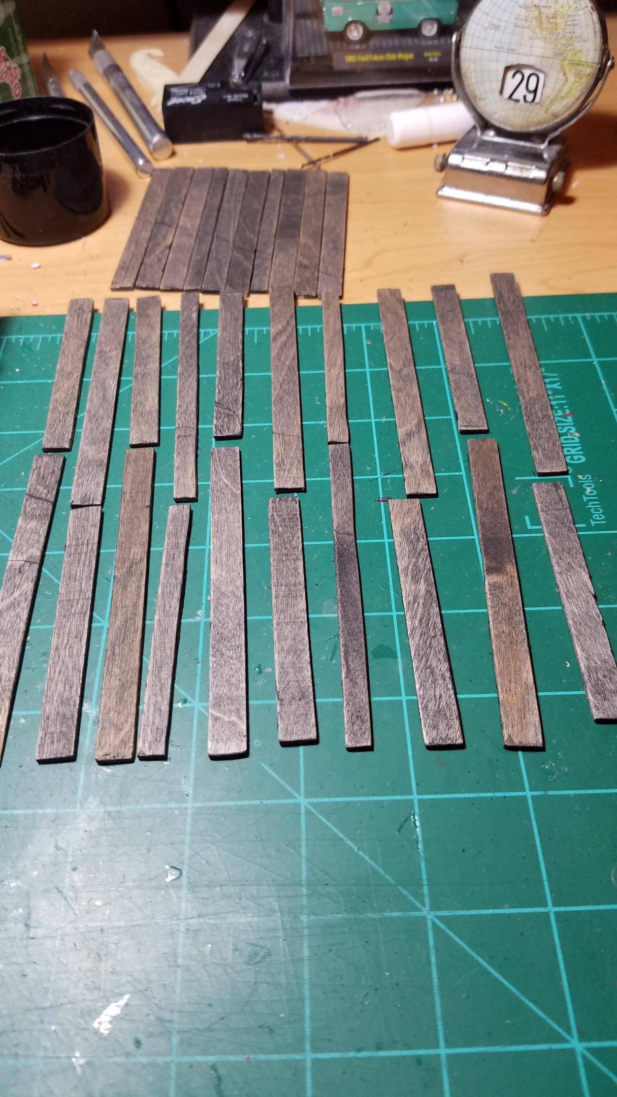 All the wood finally cut and placed for reference. Will paint underside black and weather and maybe scar the boards. -