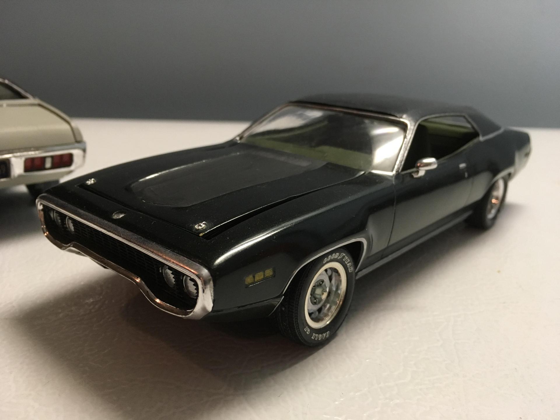 I can tell you’re a fan of these cars, like me. I wouldn’t give up hope completely that they won’t reissue the kit at some point, but if it were easy pickings, I think they would have done so by now. I never thought the ‘74 would ever come back- I remember when the old ones got expensive (early 90’s) but lo and behold, they did come back. For that matter, they brought back the ‘78 Dodge pickup this year. I did stump on that one for a long time- and was told by a few different sources that that tool was too far gone, but we did get it back eventually. I think Round 2 does listen, they are very astute when it comes to these releases. They don’t leave any money on the table, they just might not have the resources to do every release they want to at once. I think mostly they have to shuffle around those tooling inserts for the chassis and engine, wheels and bumpers to bring the ‘71 back. I would still be worried about that windshield though. Most of the ones I saw were at least slightly bent there. The ‘87 reissue had supports added to the side windows that the originals didn’t have, so they must have had some idea of that issue back then. You did give me a great idea: I might just hunt down one of those Jada (Dom’s Car) die casts, maybe I could adapt that ‘72 rear bumper to the Revell GTX kit and cast it. Personally, I think the Revell GTX/ Satellite is a MUCH better building experience. The details are much better on those kits. If I had the itch to build a bunch of these, I would just start with the Revell kits. I do have a G machine build in the works using one of these, and replicas of my ‘71’s were based on the Satellite kit. I’m in a posting pics mood: First is my last SSP. Second is my first car. 3,4,5 & 6 are replicas of my first ‘71, and a friend’s, both drivers in the ‘90’s. The last two pics are of a Revell Monogram Satellite I acquired that somebody else did. A beautiful build, I’m just going to correct a few very minor things.