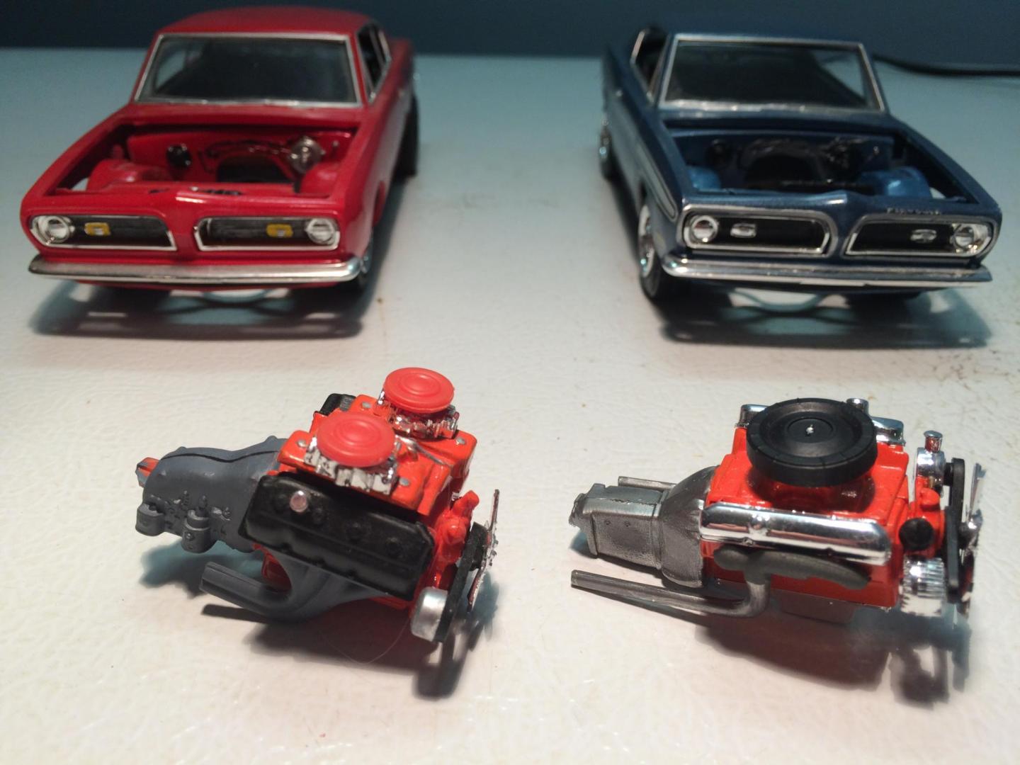 Re: the chassis: the '67 through '69 annuals had single exhaust (slant-6 for the stock building option, remember?), the drag and street machines thru the '70's and early '80's had no exhausts molded in (at least- the Killer Cuda and Avenger Cudas I had showed no exhausts, I would imagine this began with the Miss Mighty Mopar or Great Street Machine, whichever came first), and from the late '80's to present- it had dual exhausts to match the 383. Keith Marks used to do the Cuda 440 graphics. I haven't looked at his site in quite some time, but I got a set from him some time ago. Here is a pic of my Avenger. It has the '68 style marker lights for both front and rear. I did come across a swap meet body that was molded in white that had marker lenses just for the rear. The plot thickens... One pic also shows the Hemi from the Avenger (very similar to the one in the original '69), and the 383 from more recent issues.