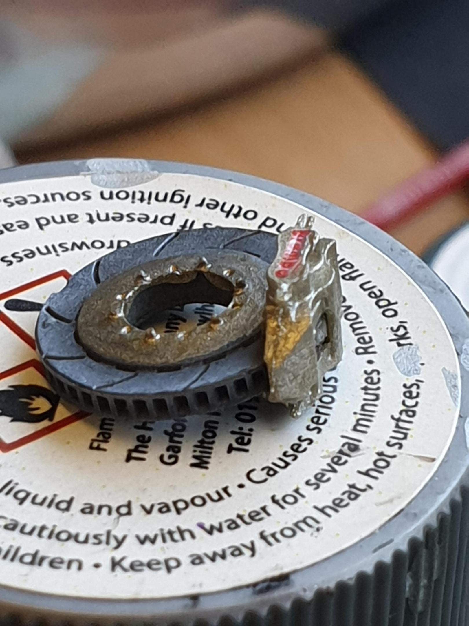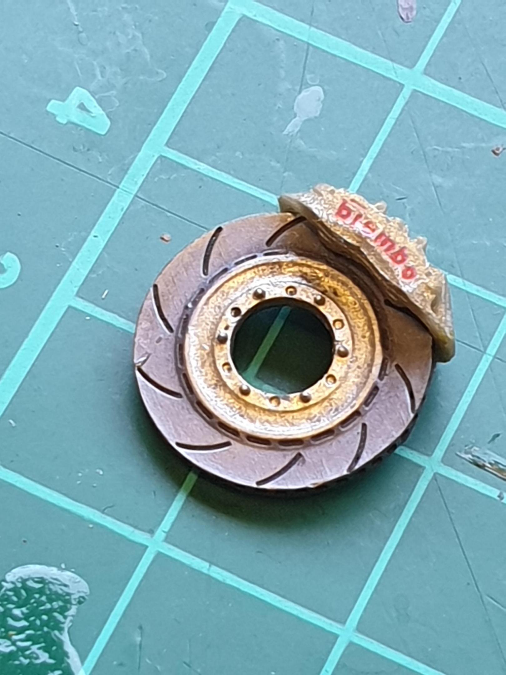 Plenty of time to work on this, chassis is complete, resin wheels and tyres are painted and detailed. Used BMF on the rear firewall and Uschi metallic powder on the discs. The CF decal is Tamiya extra fine weave. Tyres were sprayed in a very dark grey Tamiya mix with a puff of semi gloss clearcoat over the sidewalls, the wheels are a combination of XF1 and flat gunmetal. Body clearcoat next.......