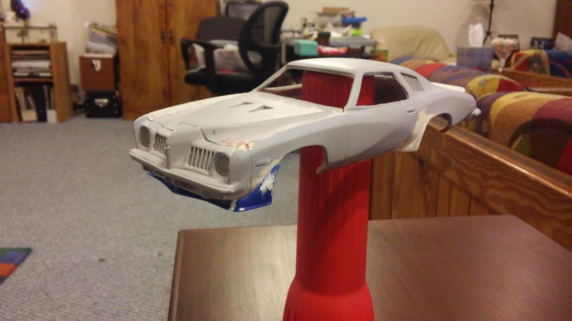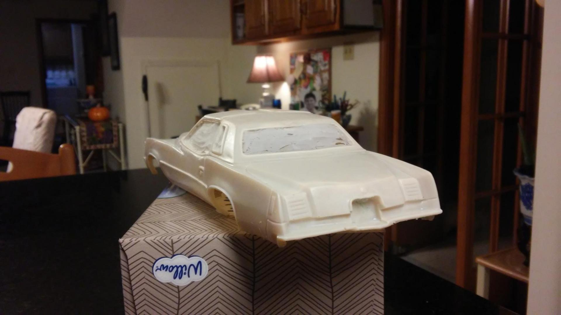 After completing several 73-77 Pontiac projects, some friends asked if I had ever done a 73-77 Grand Prix. I had not, but had several friends growing up who had real ones, including a Hurst T-Top car which was really nice. I started by getting a bunch of pictures and then carved up one of my resin 77 Can Ams for a hood and nose. The rest is a Revell 77 Monte Carlo snap-tite body, a bunch of strip styrene, some Jo-Han Cutlass parts and copious amounts of Squadron and Tamiya white putty. All of the big parts are on it, now it is just final body sculpting and checking for symmetry. After that, a resin casting. It looks like a blob now, but it is moving along nicely.