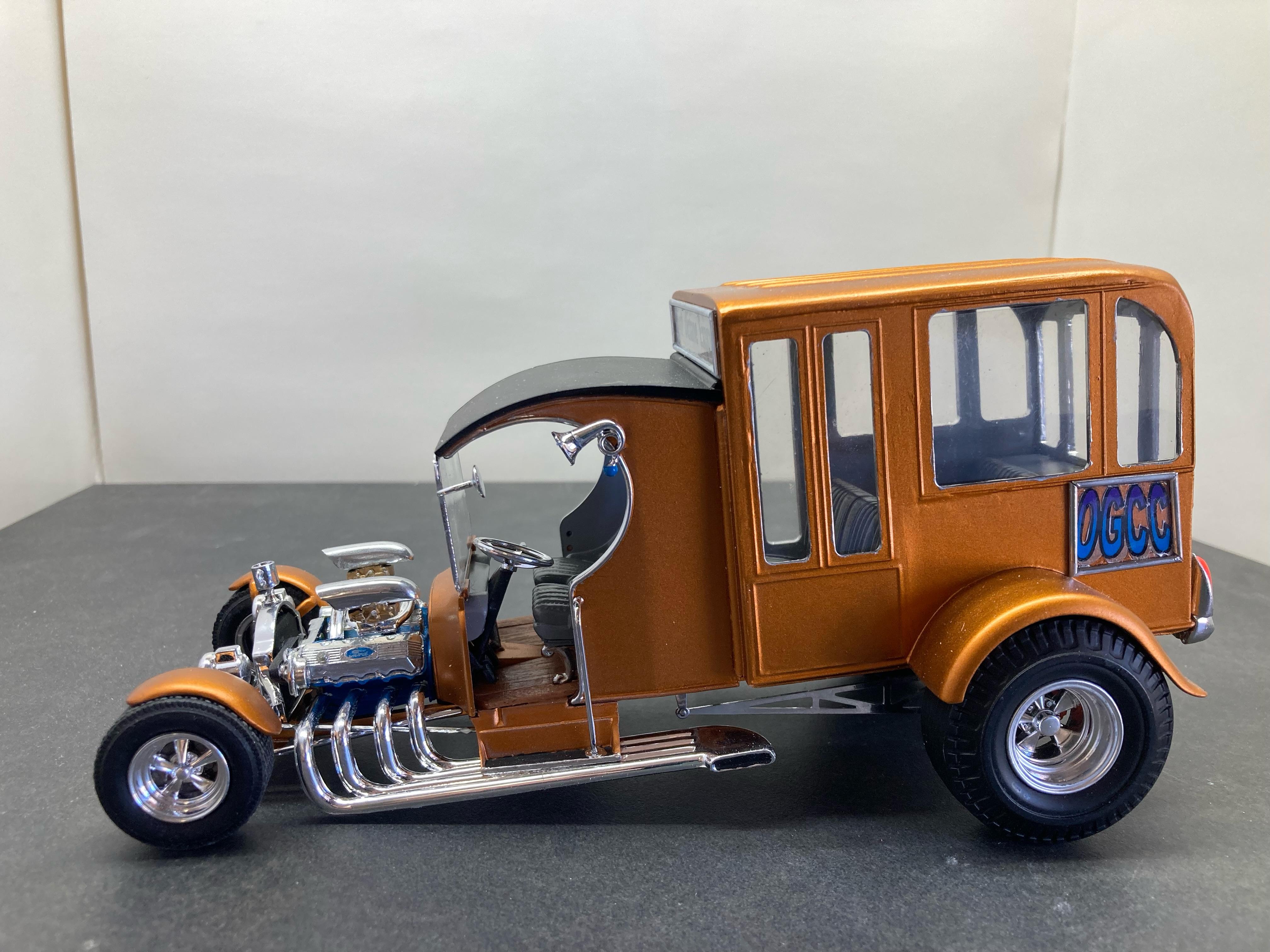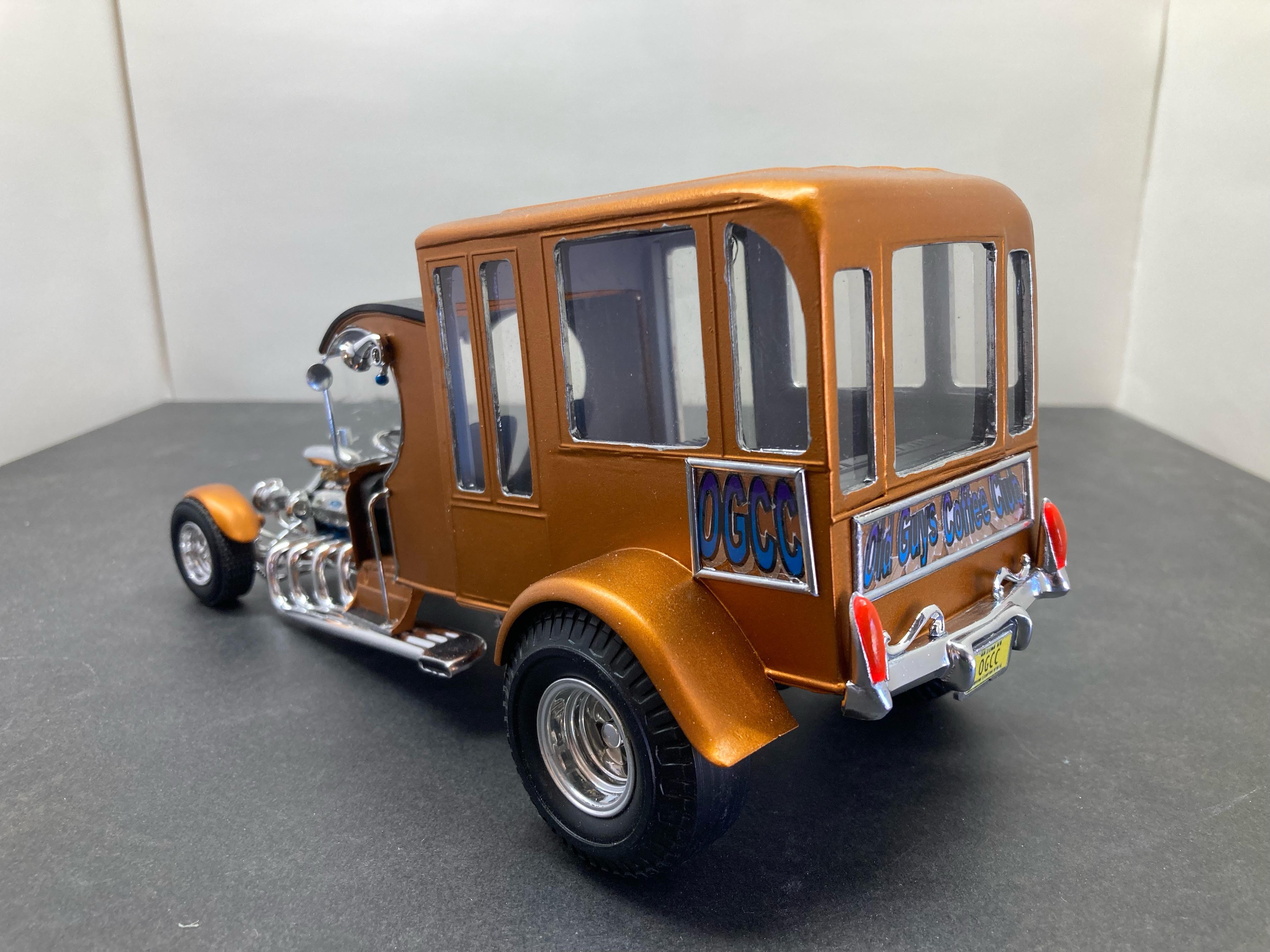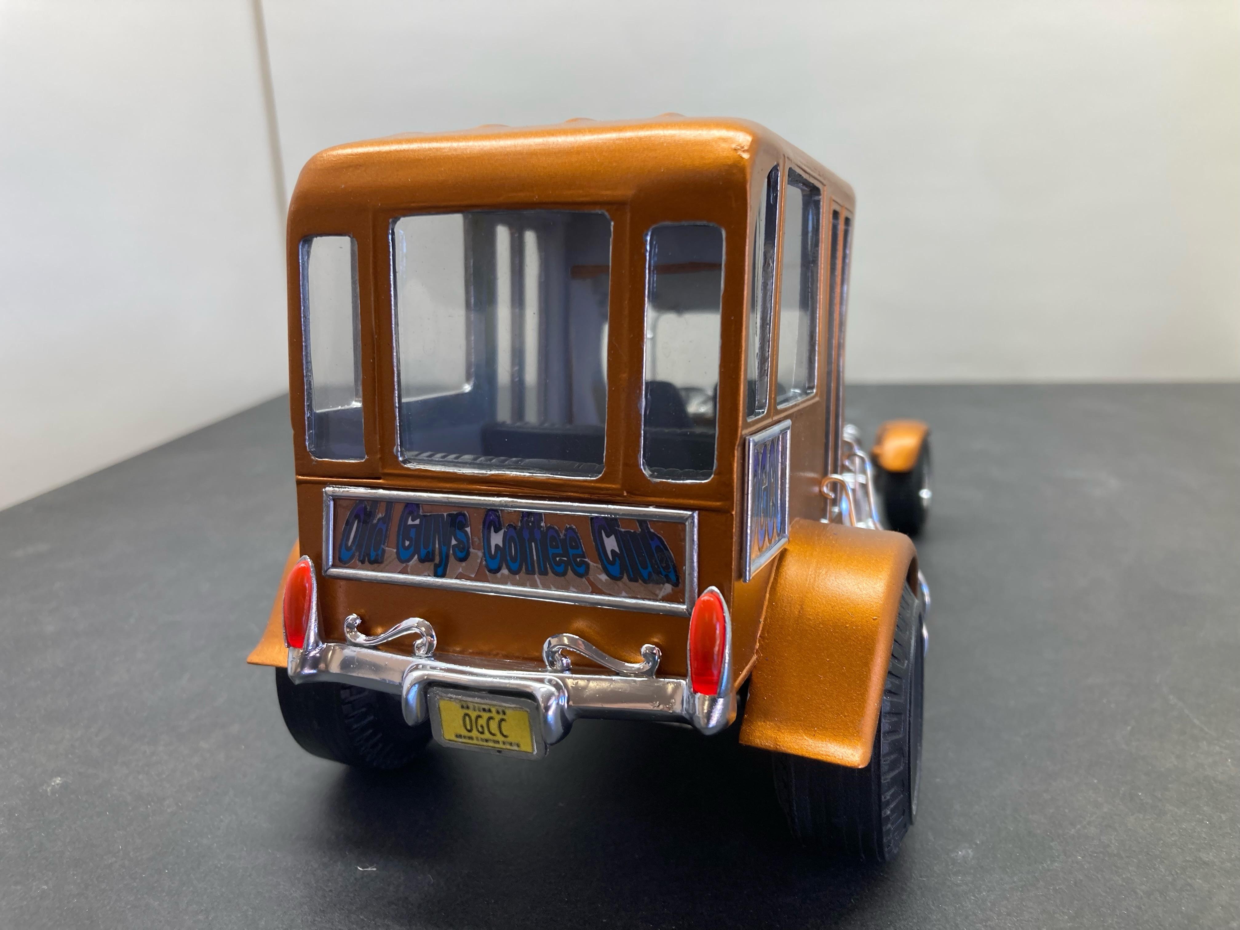 I had finished this a month or so ago but didn't take any pics until the other day. As I had written in the WIP thread, I had bought an AMT School Bus that was a total mess of a glue bomb at NNL East about 15 years ago and it sat in my parts box since then. Quite a bit of it was unsalvageable due to a huge amount of glue someone used. Much of the plastic had melt marks from the old glue. I took apart as much as I could but the plastic was very brittle so I was only able to save parts of it. Since I retired four years ago I have been going to coffee with a bunch of other retirees. Most are car guys and they love my model creations. We call ourselves the OGCC (Old Guys Coffee Club). I decided to build a courtesy bus model to honor the members. I took what I could salvage and altered it quite a bit. I added part of the roof from the Tom Daniels Street Fighter and the front from his Paddy Wagon. The headers, rear tires and wheels are from the 1/12th scale Popcorn Wagon they seemed to work. The engine needed to be large so I used a Ford 426 and the criss-cross carb set up from the Paddy Wagon. I scratch built the coffee mug on the top of the grill along with the rear bumper and taillights Thanks for looking and I hope you like it. Dave