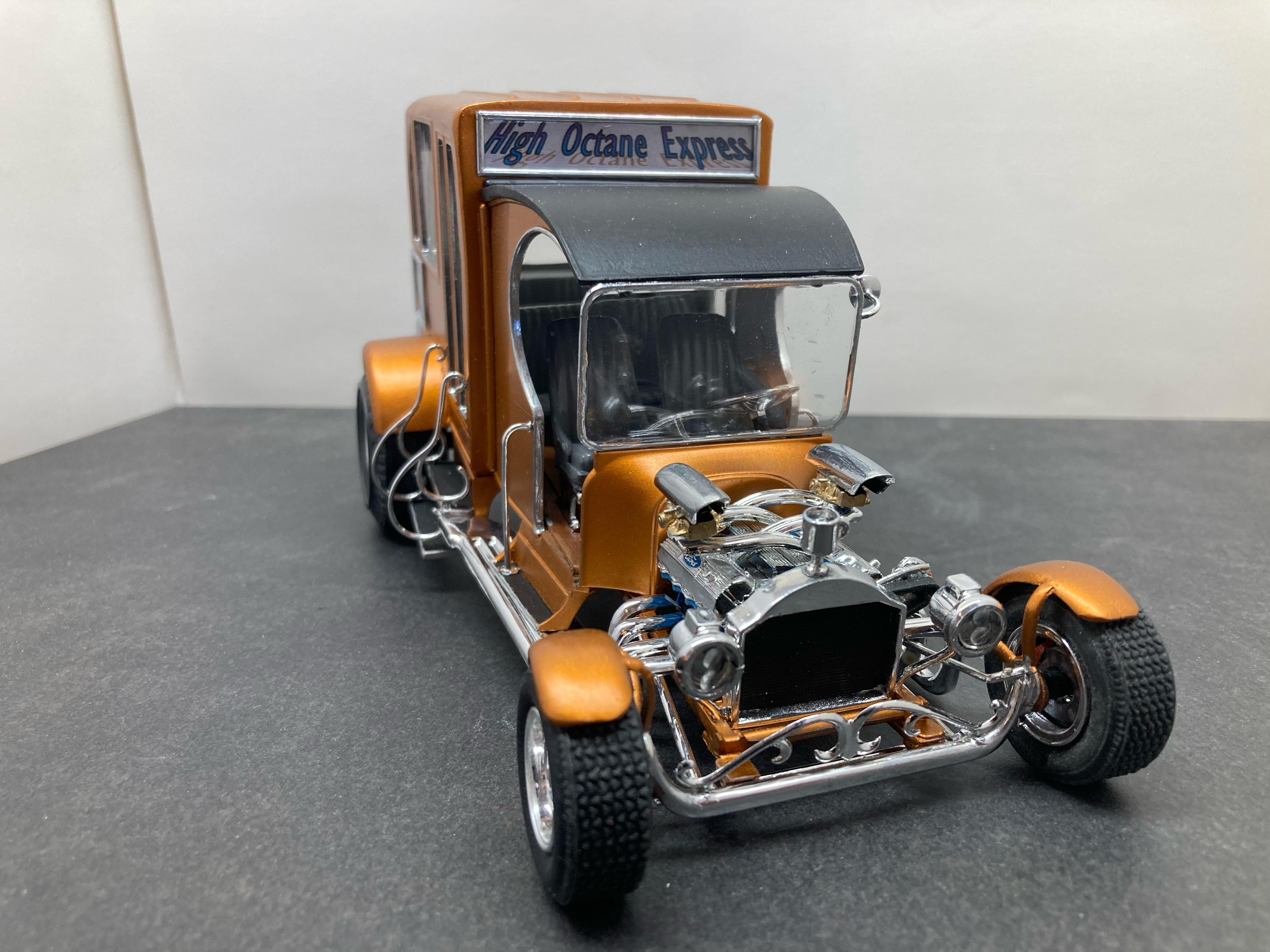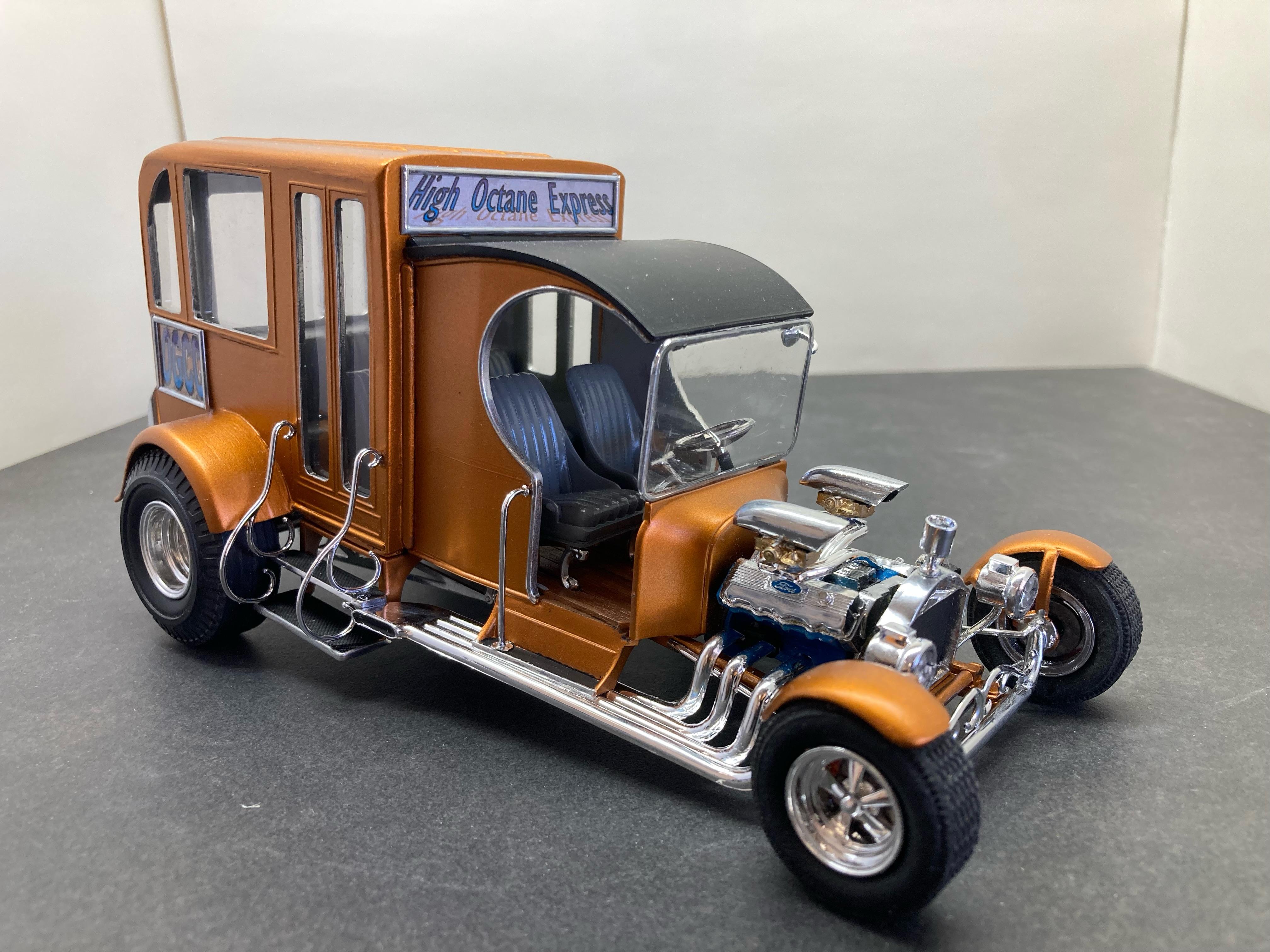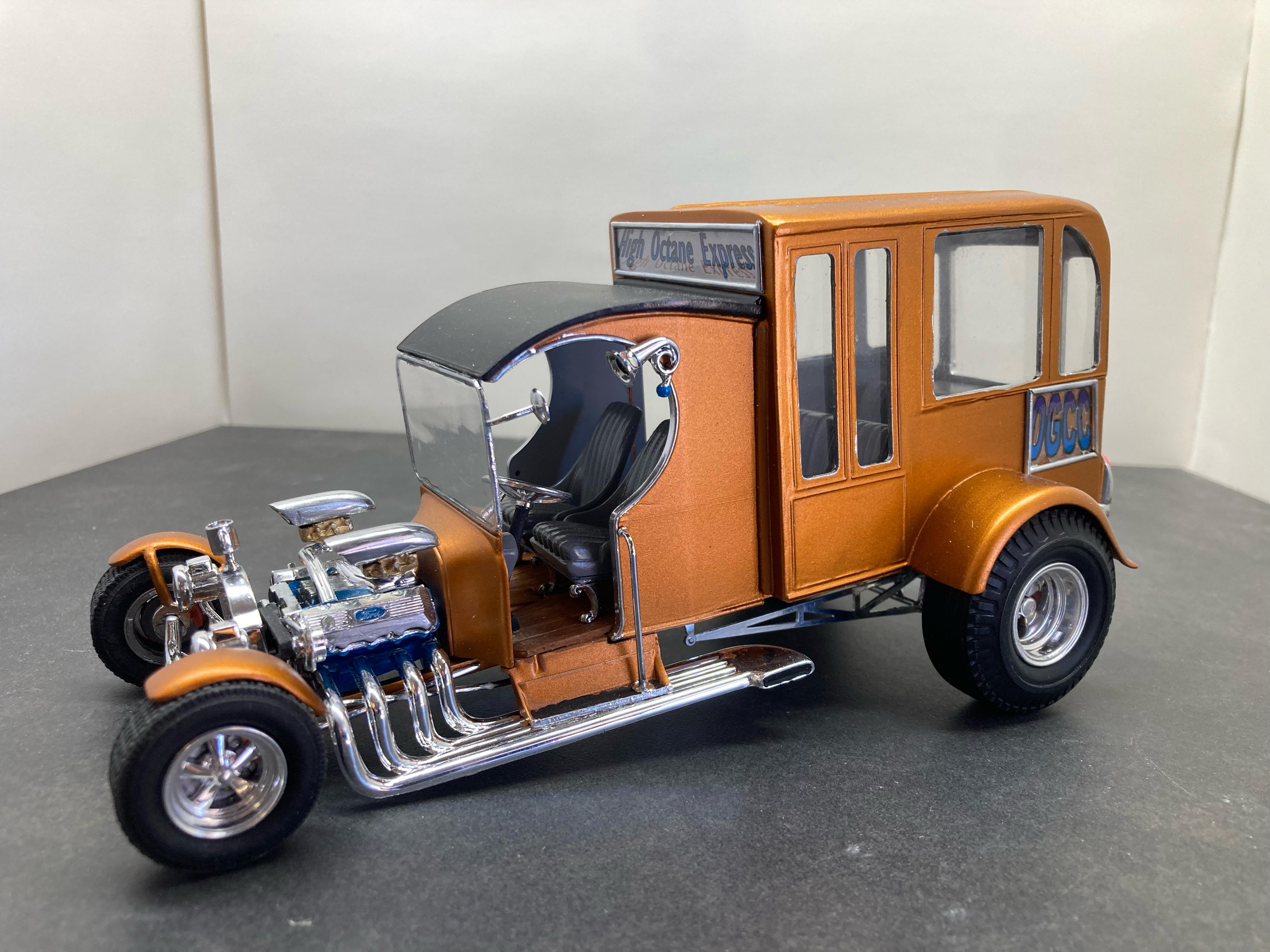 I had finished this a month or so ago but didn't take any pics until the other day. As I had written in the WIP thread, I had bought an AMT School Bus that was a total mess of a glue bomb at NNL East about 15 years ago and it sat in my parts box since then. Quite a bit of it was unsalvageable due to a huge amount of glue someone used. Much of the plastic had melt marks from the old glue. I took apart as much as I could but the plastic was very brittle so I was only able to save parts of it. Since I retired four years ago I have been going to coffee with a bunch of other retirees. Most are car guys and they love my model creations. We call ourselves the OGCC (Old Guys Coffee Club). I decided to build a courtesy bus model to honor the members. I took what I could salvage and altered it quite a bit. I added part of the roof from the Tom Daniels Street Fighter and the front from his Paddy Wagon. The headers, rear tires and wheels are from the 1/12th scale Popcorn Wagon they seemed to work. The engine needed to be large so I used a Ford 426 and the criss-cross carb set up from the Paddy Wagon. I scratch built the coffee mug on the top of the grill along with the rear bumper and taillights Thanks for looking and I hope you like it. Dave