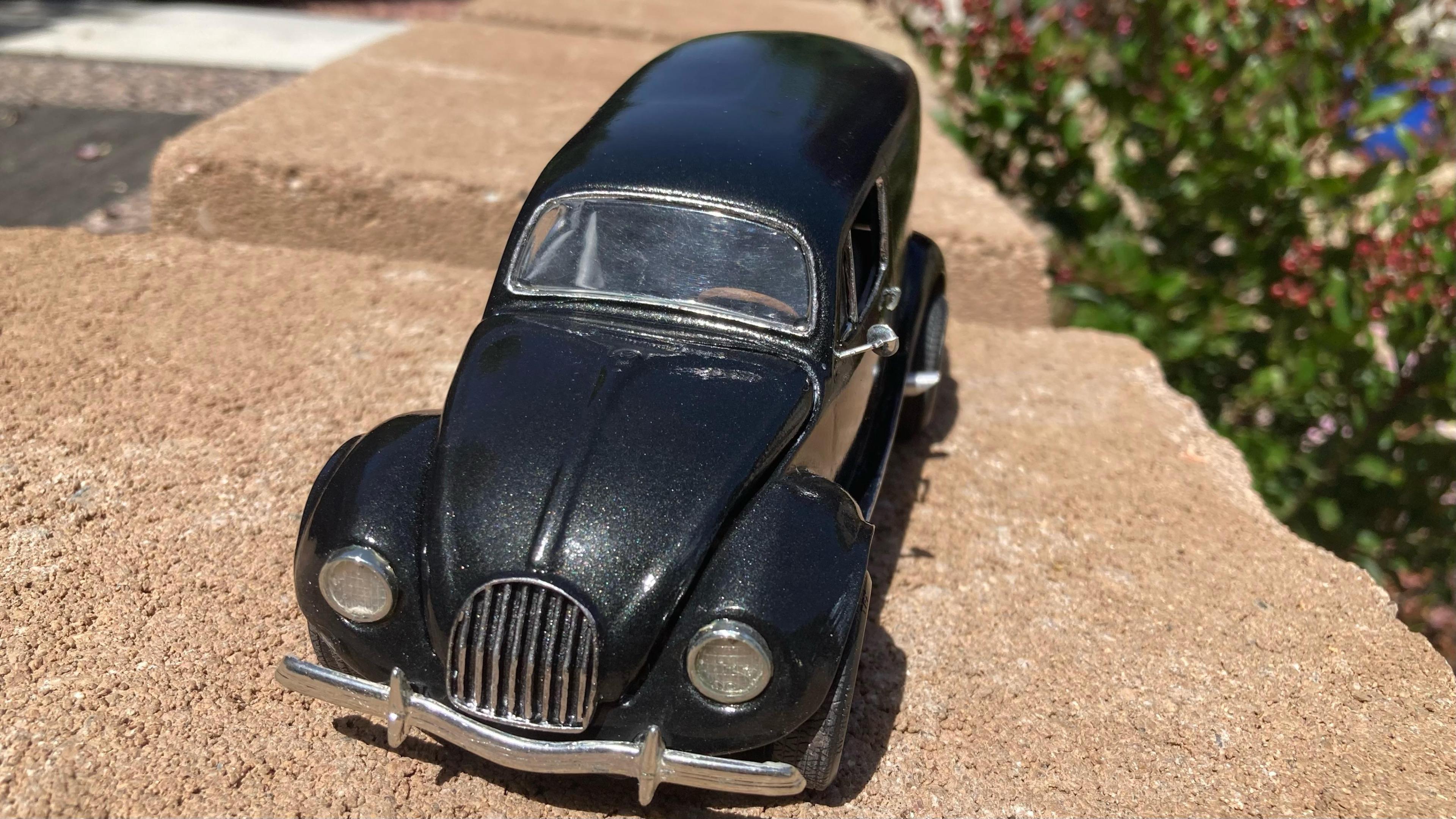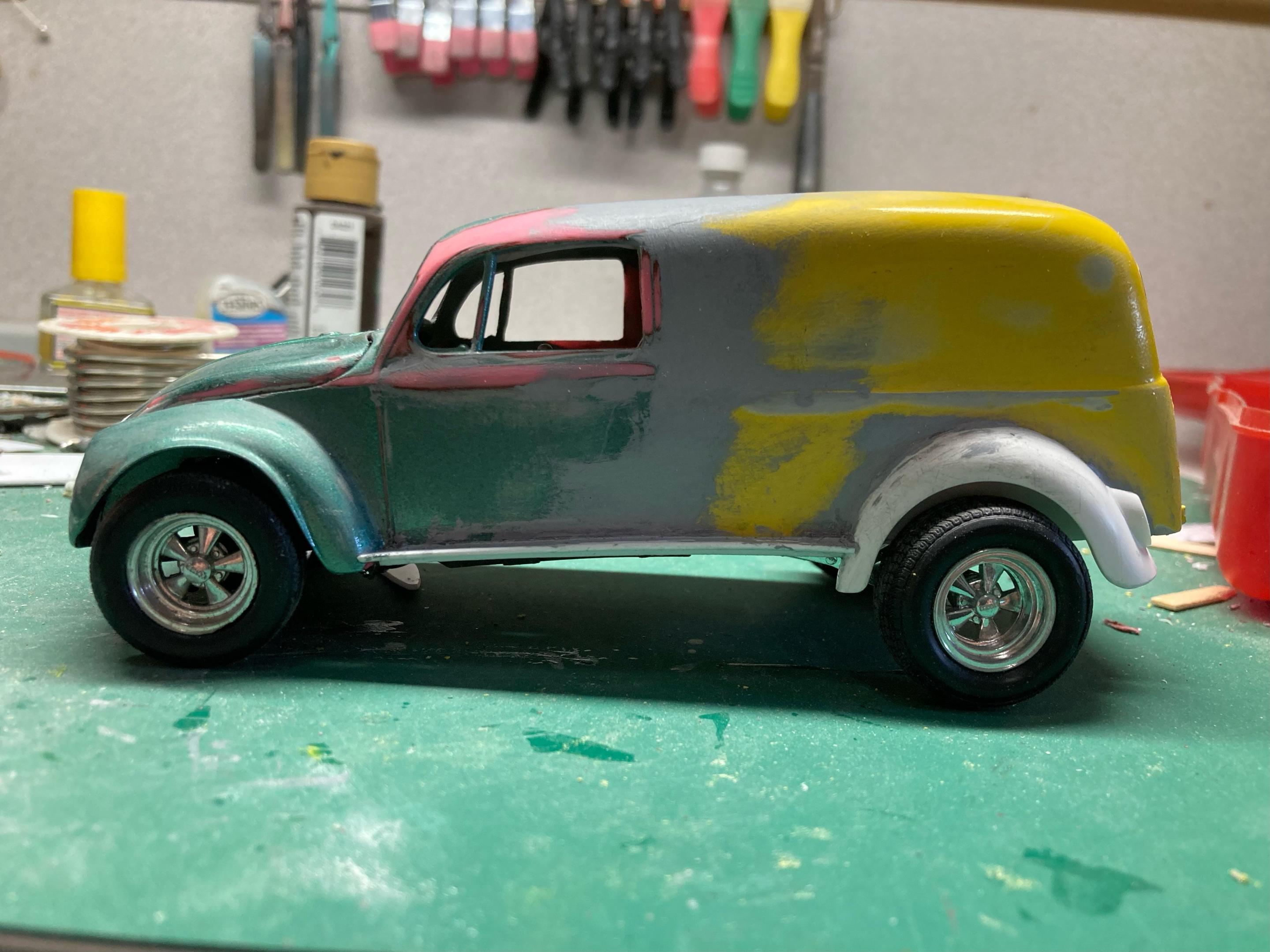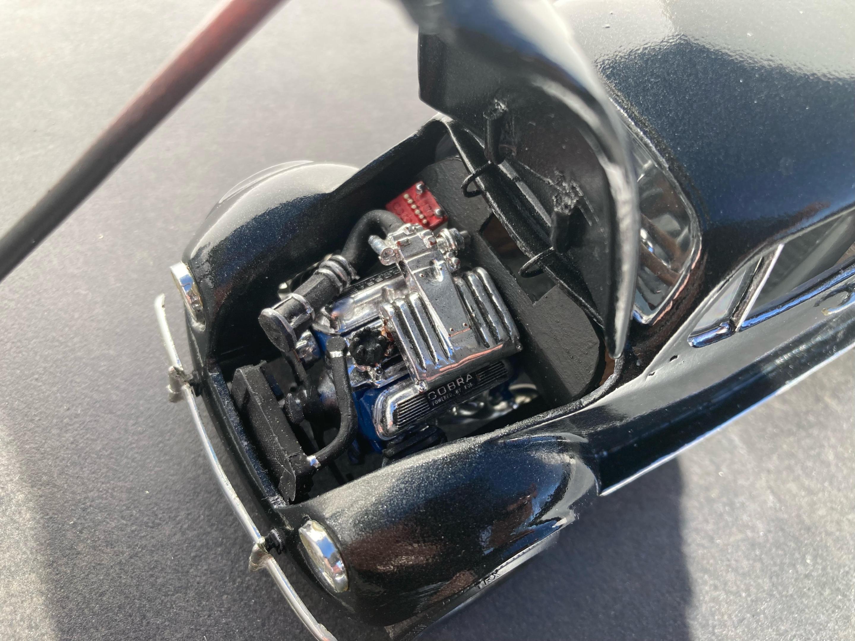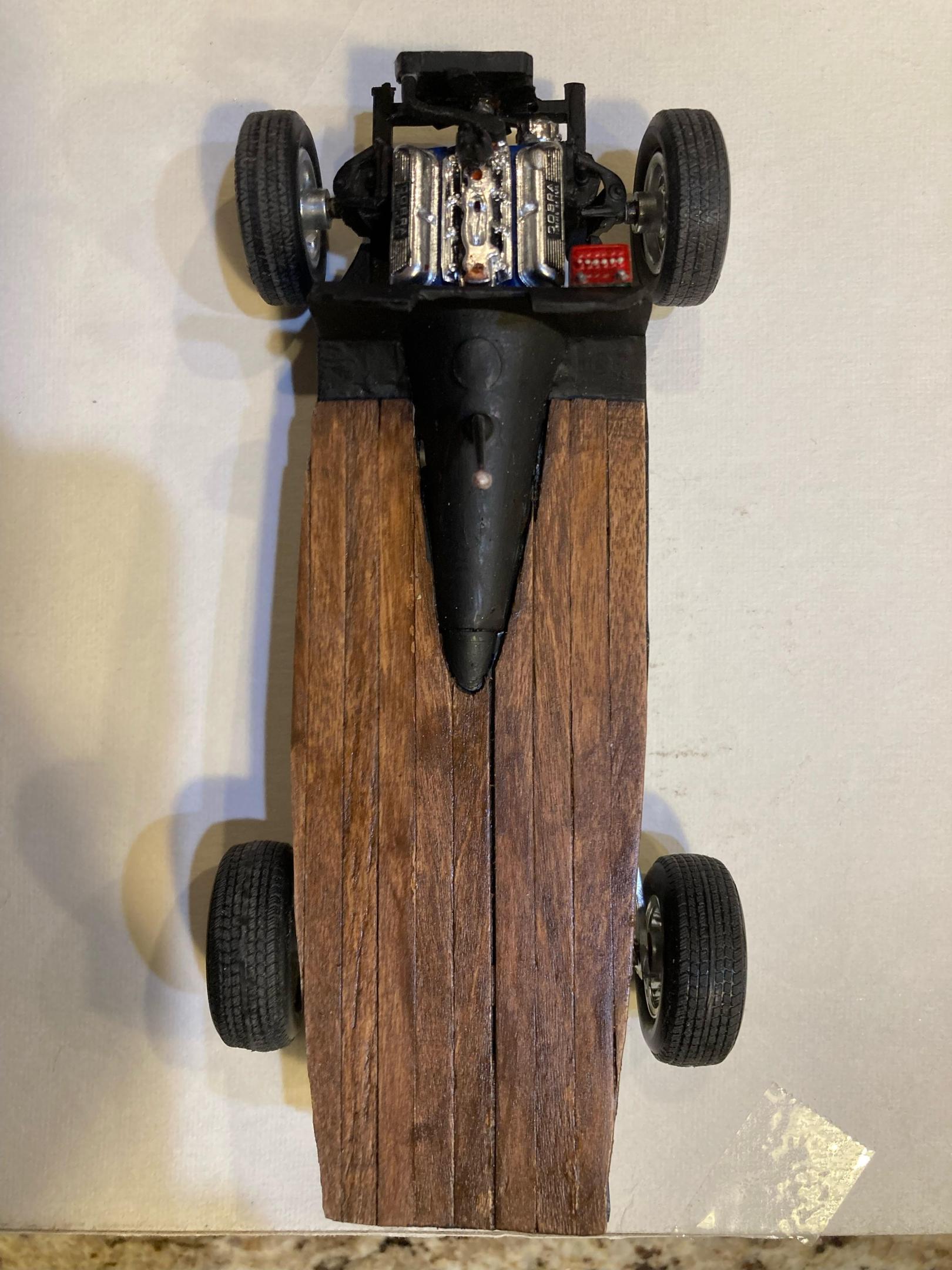 23. I did a bit more work on this. Smoothed out the body (it likely will need more body work). I used stained and sealed coffee stirrers for the floor. I'm also working on rear door hinges. Looking to paint it a metallic black, but I have to make sure the body work can support black. Being that the vehicle is powered by a V8 and the bug doesn't have a front grill, I had to make one. I think it looks pretty good. I also added tires and Cragar wheels. Thanks for looking. Dave