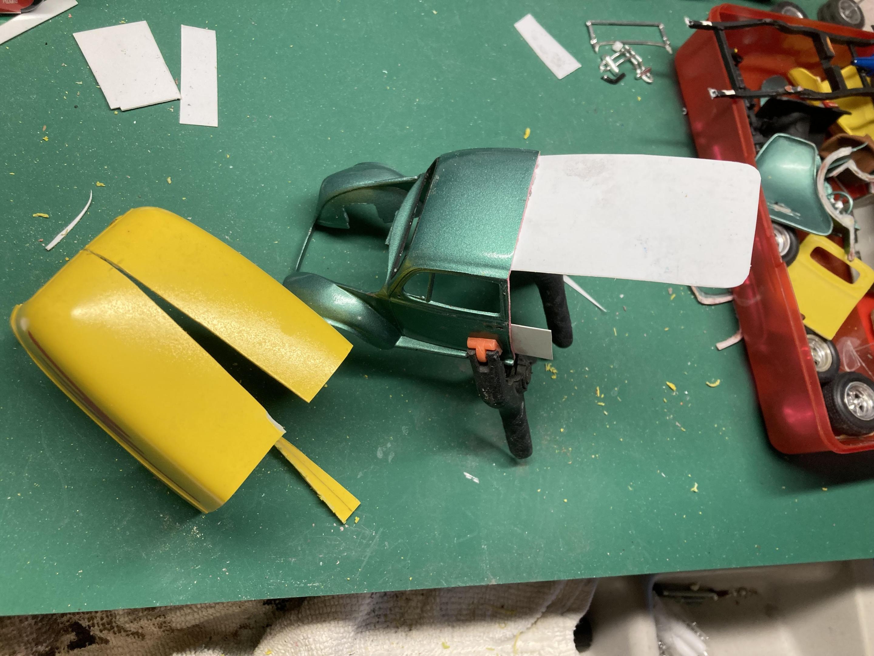 7. I was looking thru all my old model parts and saw that this VW bug had the same roof curve as the 1940 Ford delivery, so I decided to see what I could do with them. I cut the rear off the bug and the rear off the Ford. The Ford back was a bit wider than the VW, so I cut a vee in the van roof and added bracing to fit the bug. They fit now with some body work. I'm not sure about the shot with those fenders. I will have to comb thru all my fenders and see if something fits better. The Ford fenders were too long and looked out of proportion. Probably a set of Cragars will look good. Haven't thought about power train and color yet. More to come! Thanks for looking and I hope you like it. Dave