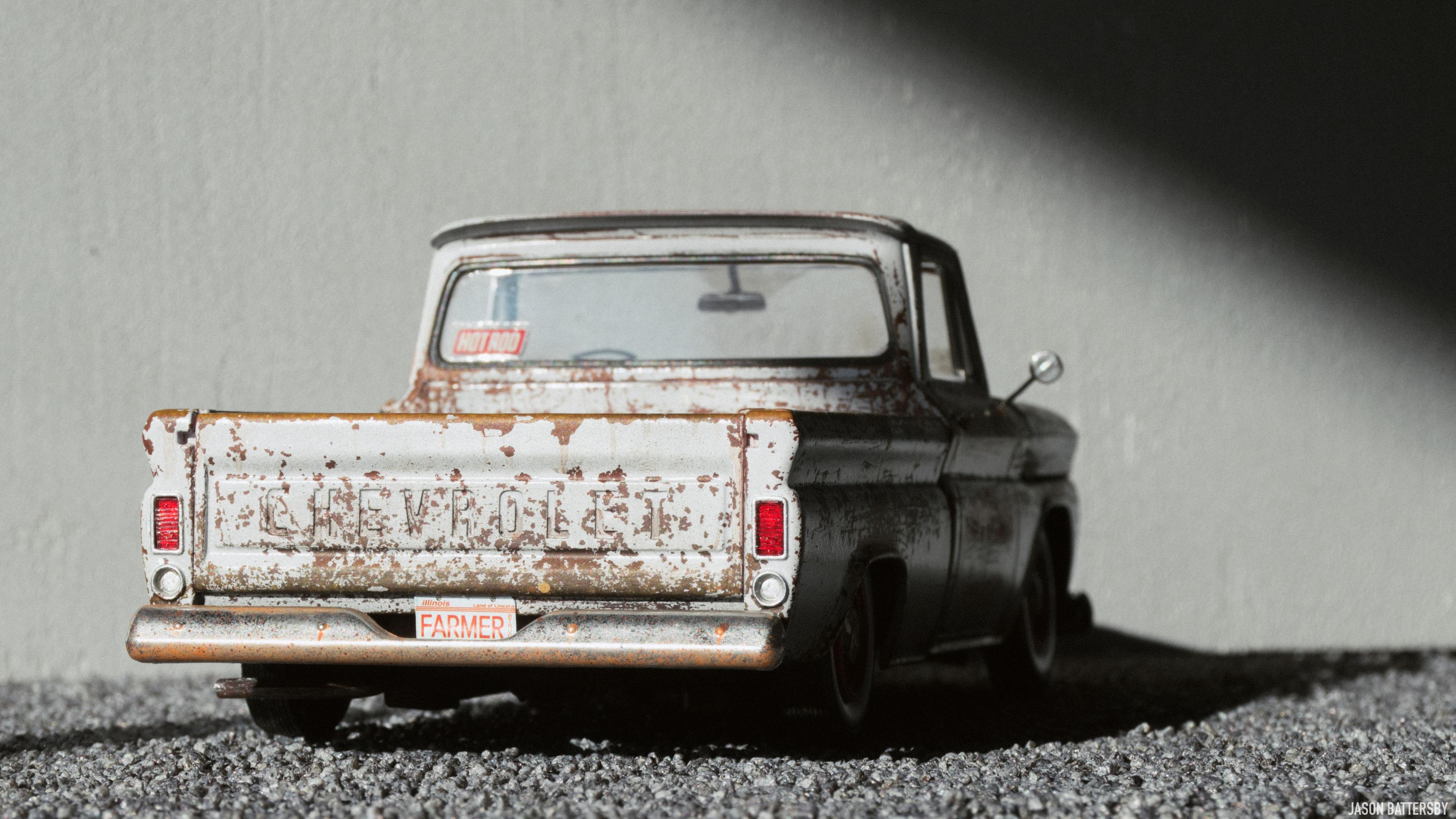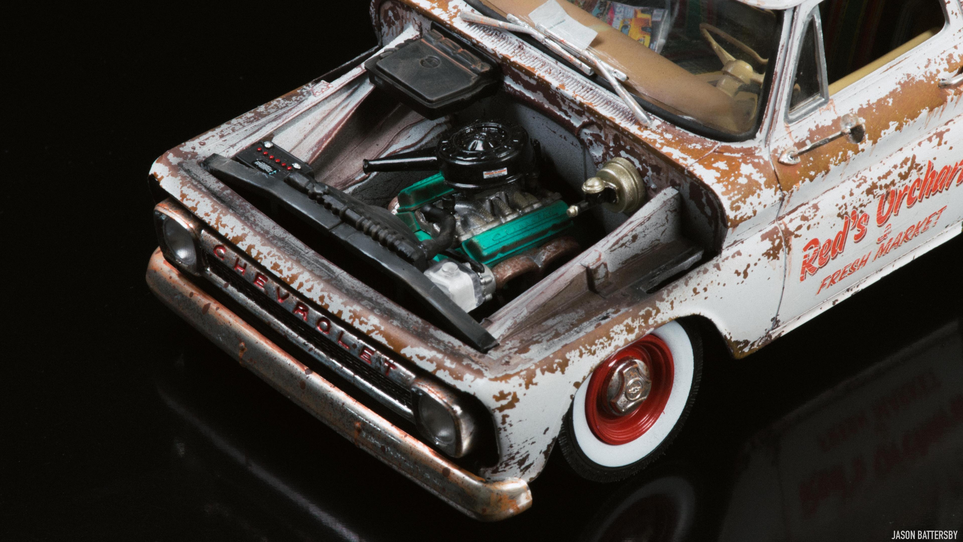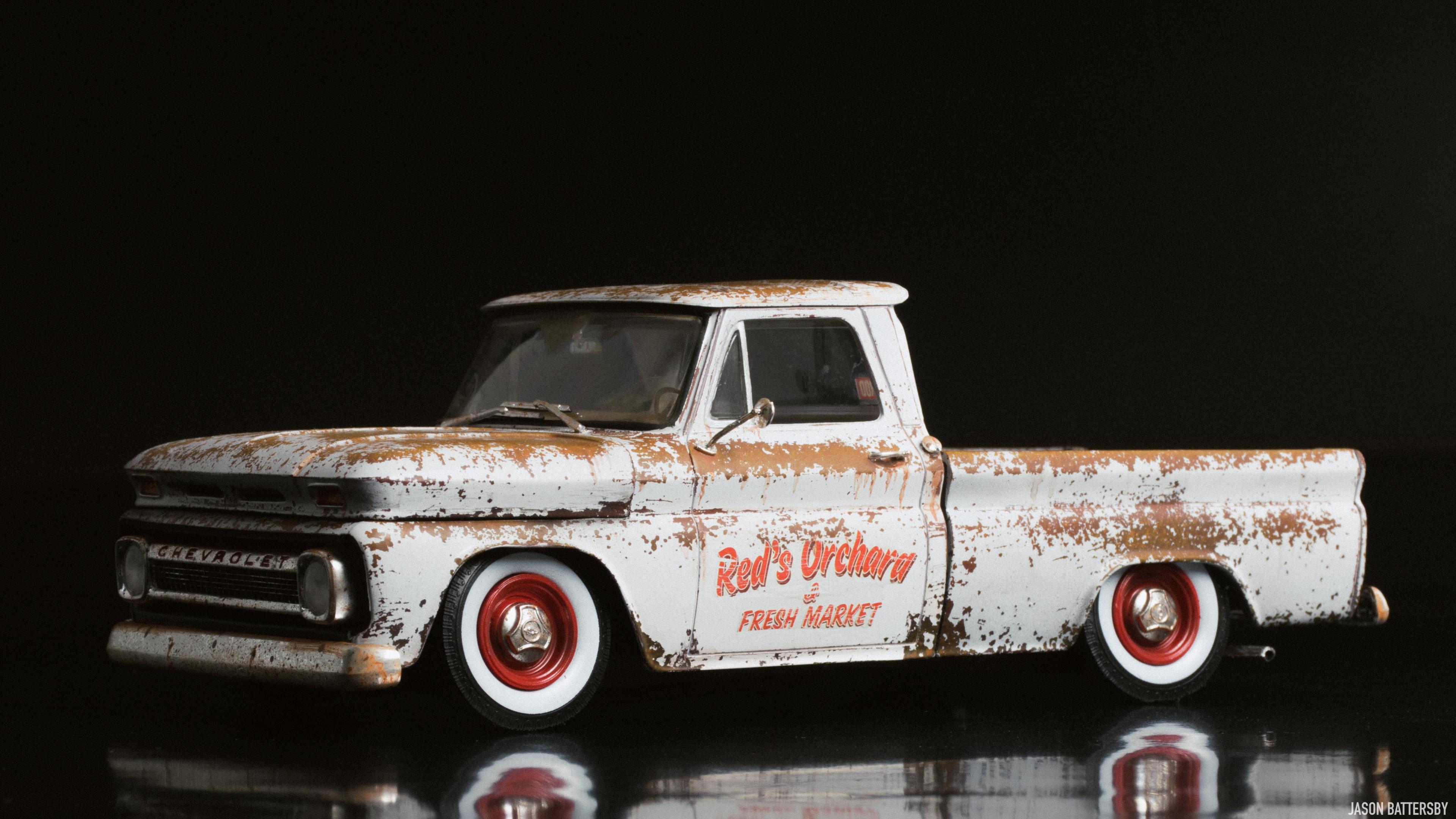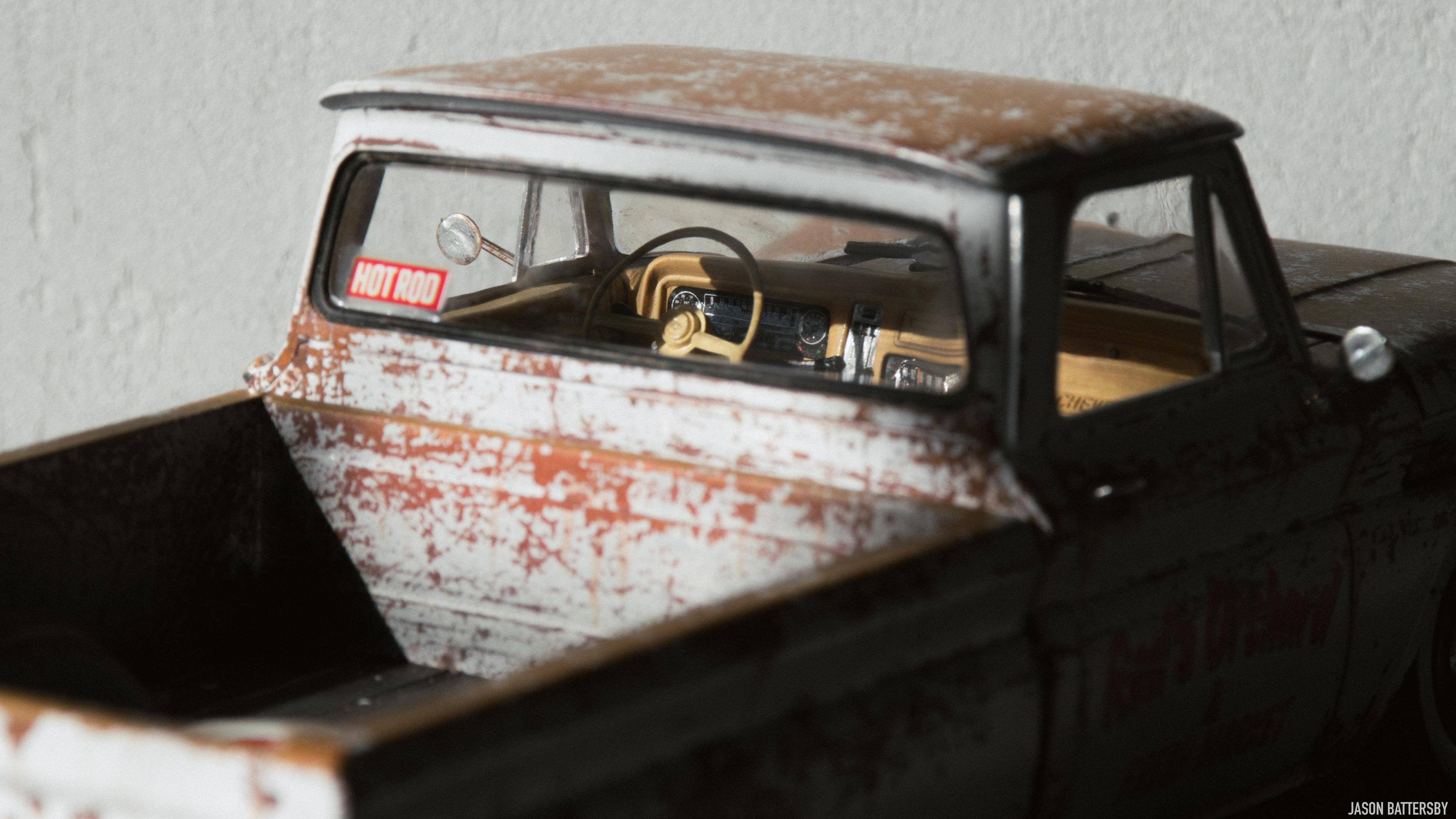 Hi guys, I'm happy to share my first completed build for 2021, Revell's 1966 Chevrolet Fleetside pickup. I received this model for Christmas this past December and knew straight away I would like to try a weathered rat rod look. My idea for this build was to make it look like a barn find turned shop truck, hence the patinaed body but cleaned up wheels and lowered stance. This was only my second time weathering a model, using Vallejo Rust acrylic paints to build up the rust shades. The body was then sprayed with Vallejo chipping medium plus some salt to get more variation in the chips. The body was then sprayed with Tamiya X-2 Gloss White acrylic, and when dry I used water, a toothbrush and my finger nails to chip and scratch off the paint. The rest is built box stock, I just focused on weathering and dirtying up as many areas of the interior and engine bay as possible. For the rusty chrome it was a mix of sponging on the Vallejo rust shades, and Tamiya semi-gloss clear to give the chrome that faded look. This is a great model kit, everything seems to fit together perfectly, I will definitely pick up another one and give it a different look. Enjoy!