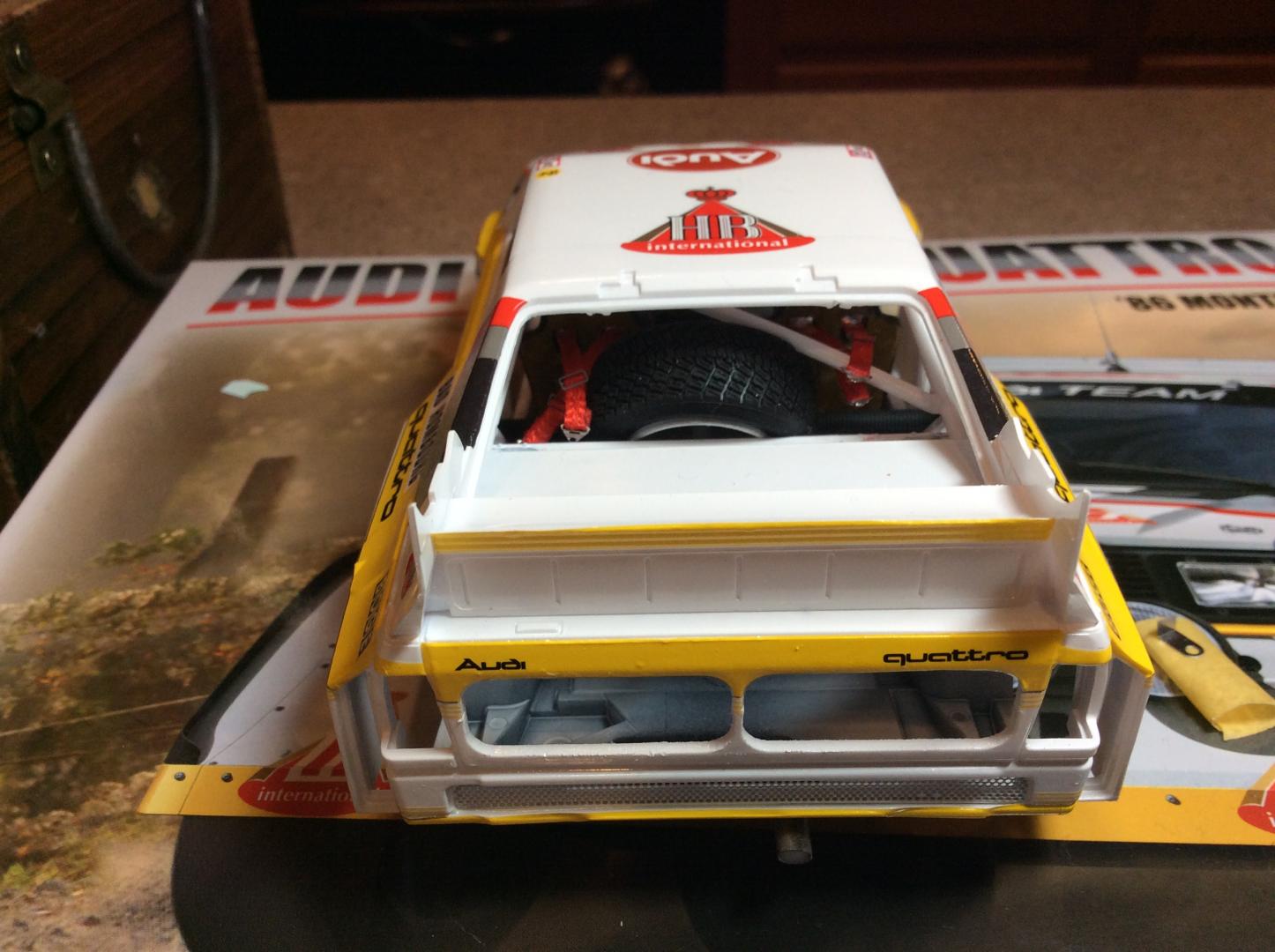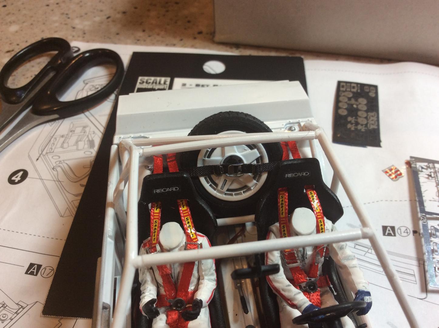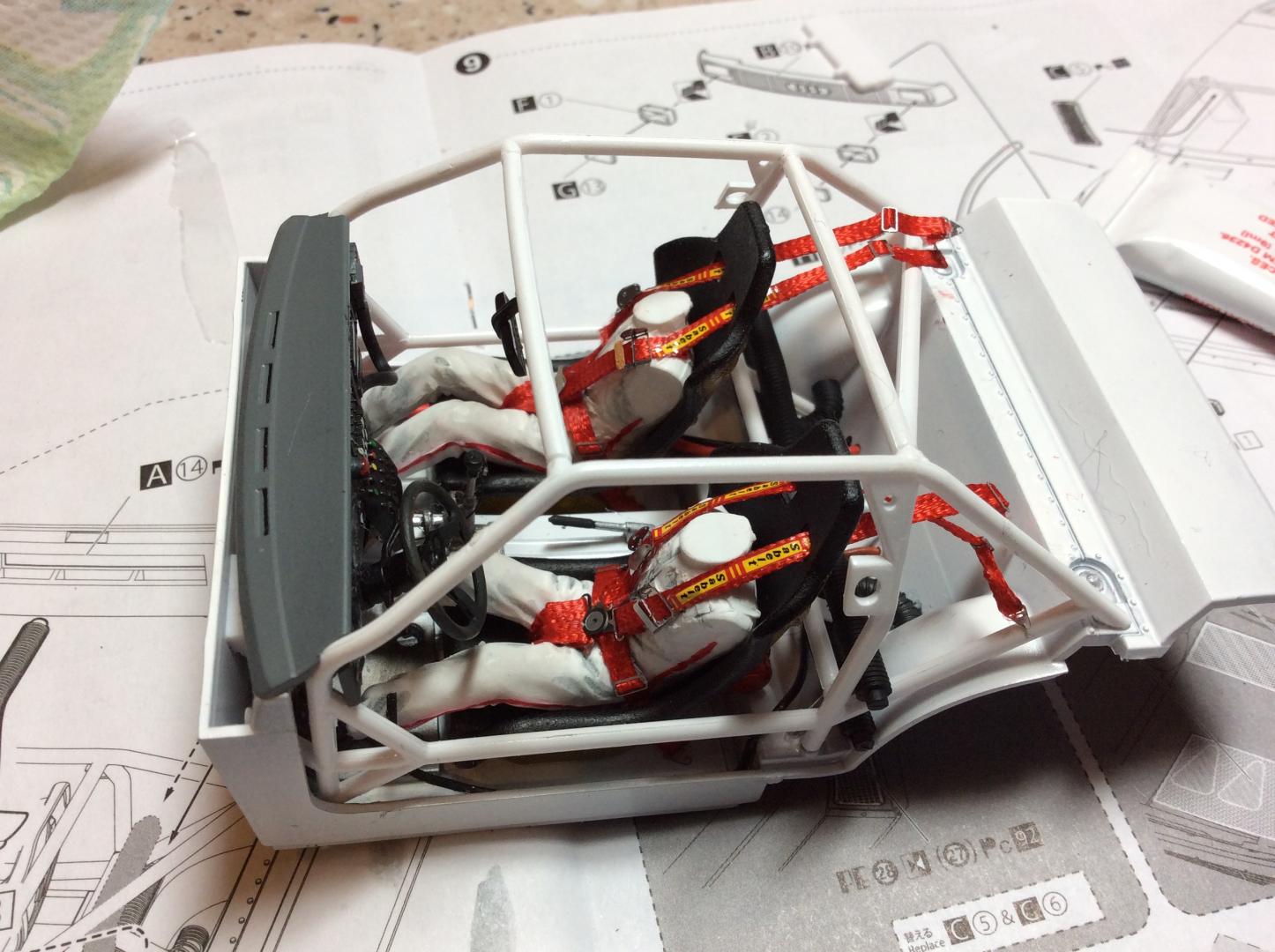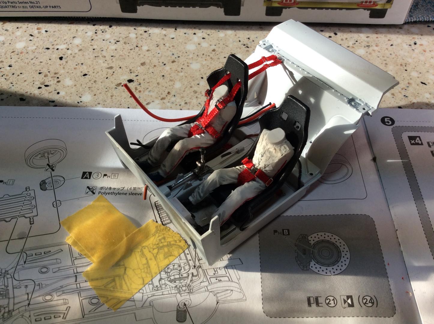 Had found some time over the weekend to get some things done with the Audi. I ran some lines in the interior just have to add the fuel line. The fire extinguisher is painted and drying. It goes behind the front seats. The dash is in place and decals and some details have been added. The wheel has been weathered with some light brown to simulate a worn look. Co driver has been fitted into the seat and I will start to detail it with some light and medium grey washes. The rear wing base has been fitted and the top elements have been dry fitted. If you build this kit the wing is very flimsy. There are three injection marks on the thinnest element. The two tiny nubs that stick out of the wing fit against the wing base.