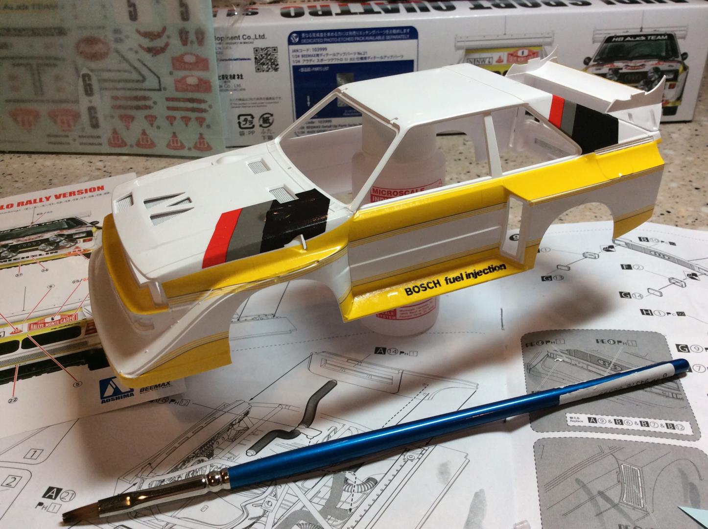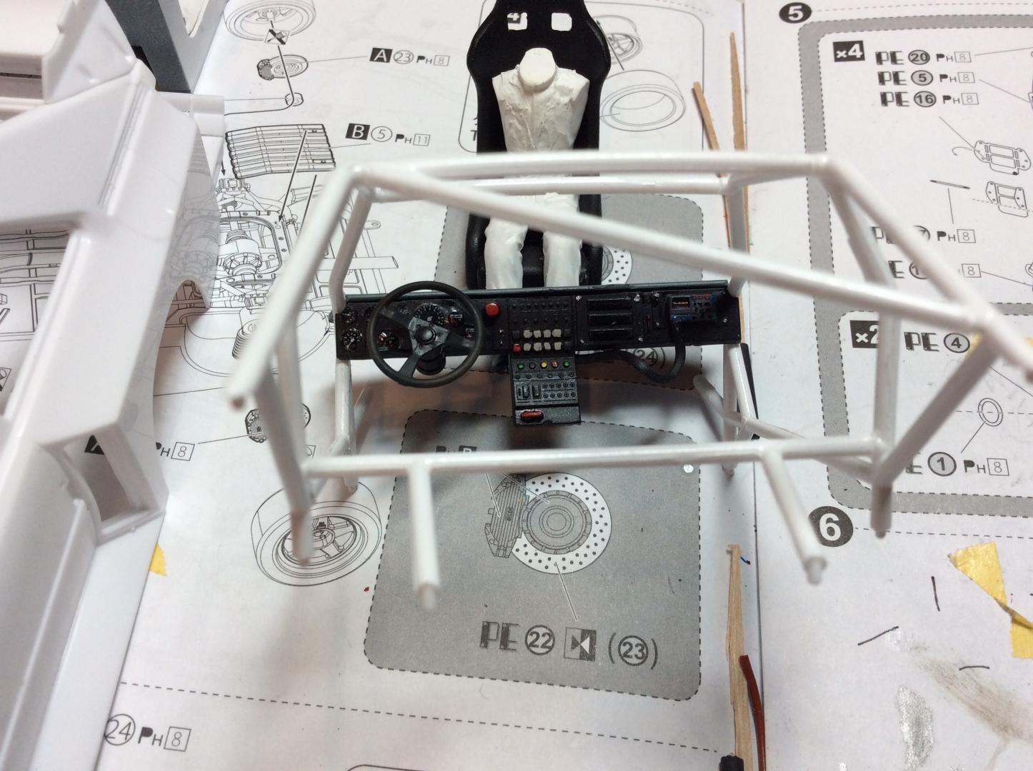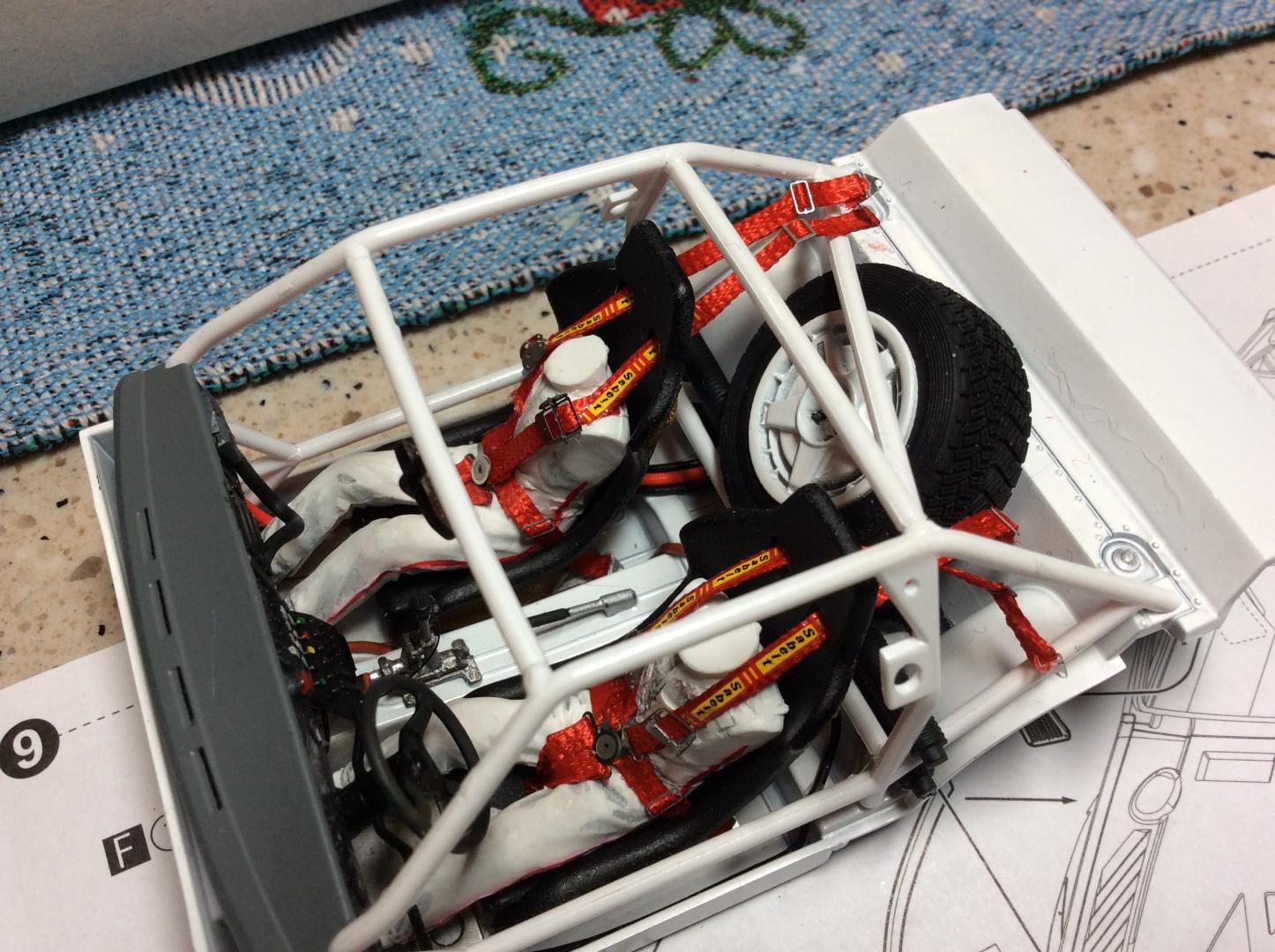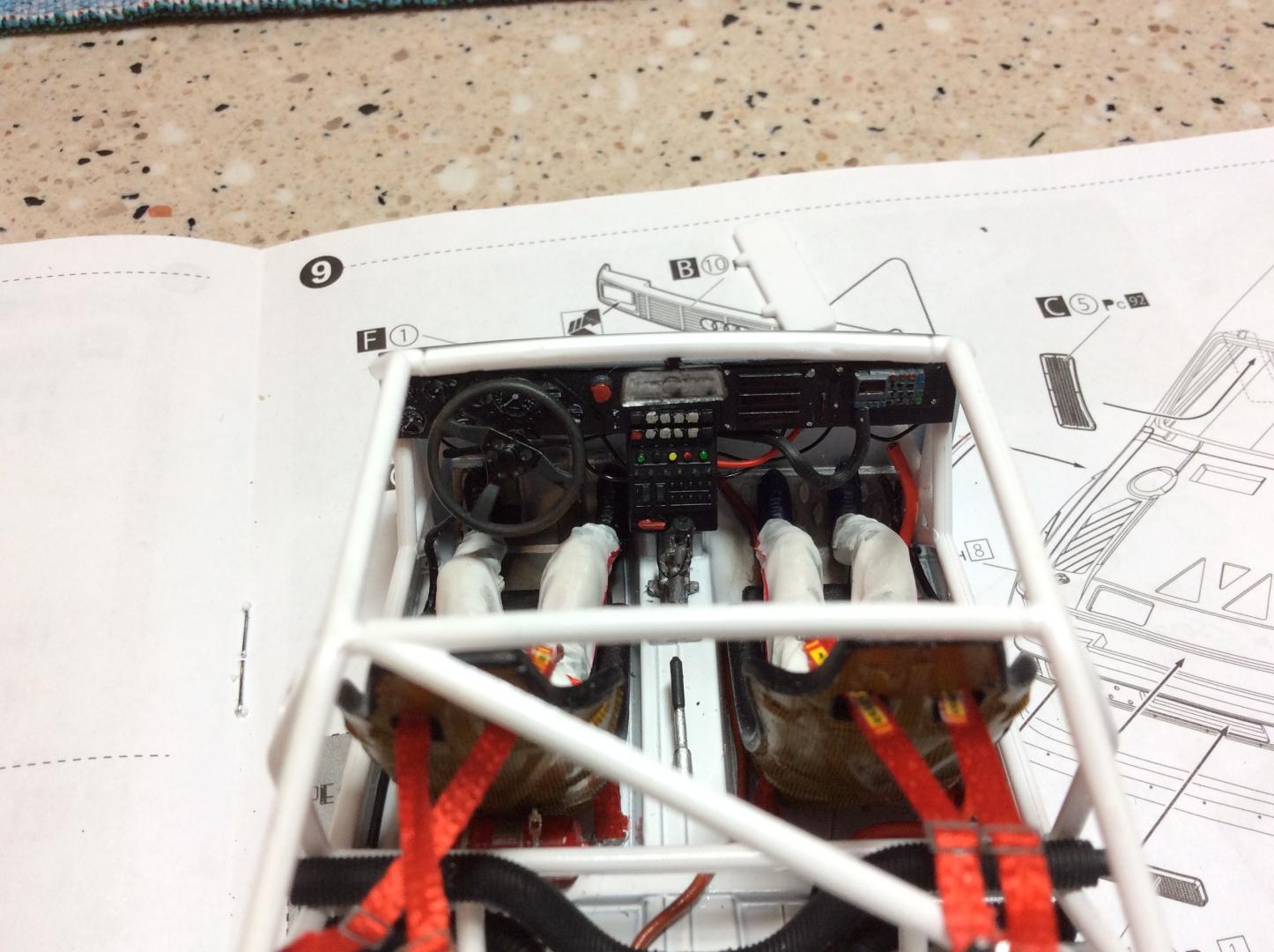 Had found some time over the weekend to get some things done with the Audi. I ran some lines in the interior just have to add the fuel line. The fire extinguisher is painted and drying. It goes behind the front seats. The dash is in place and decals and some details have been added. The wheel has been weathered with some light brown to simulate a worn look. Co driver has been fitted into the seat and I will start to detail it with some light and medium grey washes. The rear wing base has been fitted and the top elements have been dry fitted. If you build this kit the wing is very flimsy. There are three injection marks on the thinnest element. The two tiny nubs that stick out of the wing fit against the wing base.