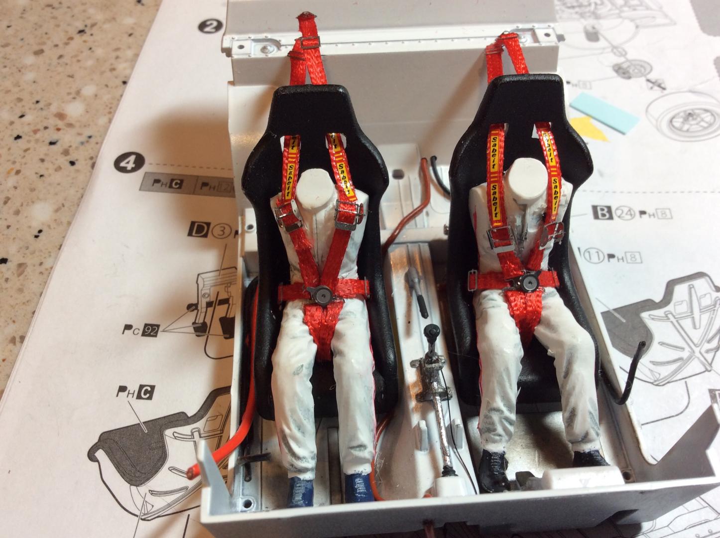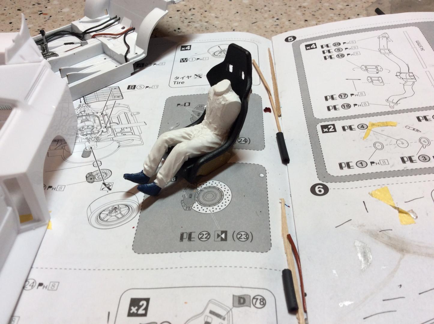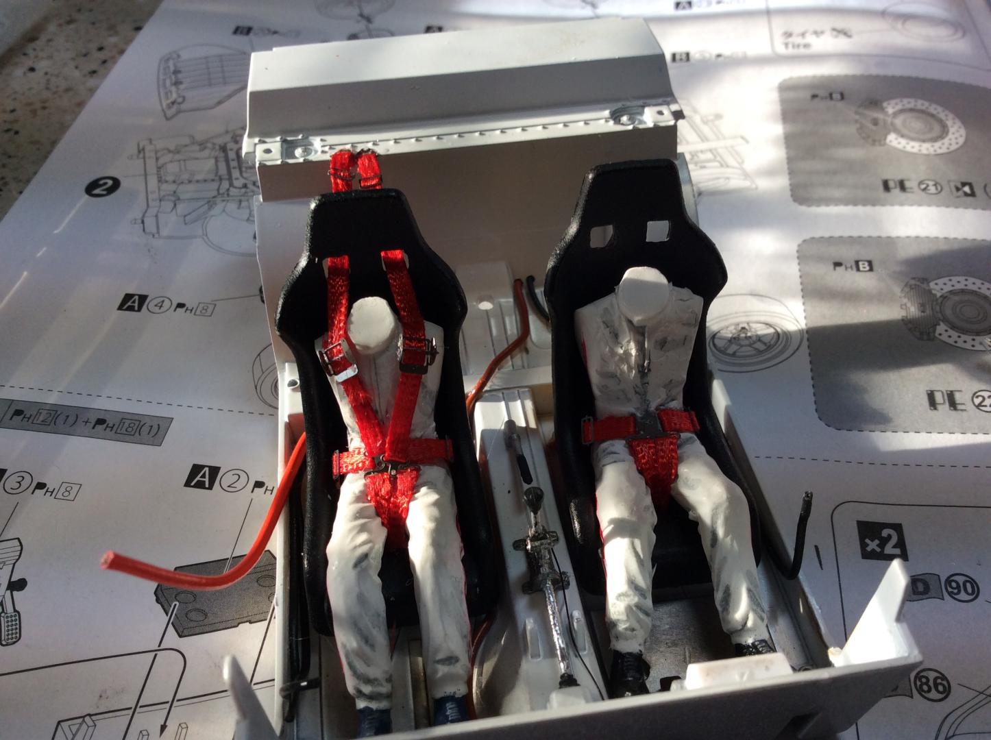 I had some time to do a few more things today. I love days off from work. Started working on the drivers and the belts. A bit disappointed in the detail kit as it does not give you enough material to make the full belts. I think they need to give you two pairs of ribbon. I have plenty in the supply box?. The drivers came from a Tamiya kit. I used the panel line detail in dark grey to pick out some of the wrinkles in the suit. Red line was done with a medium Sharpie. Suits were painted flat white. I put the body on just for a mock up.