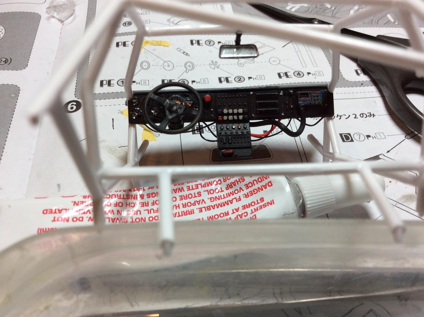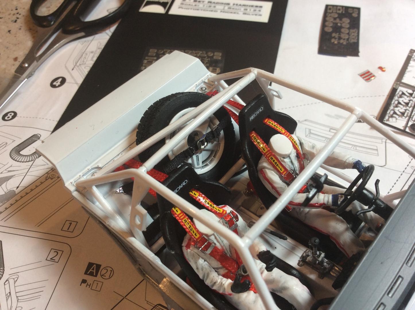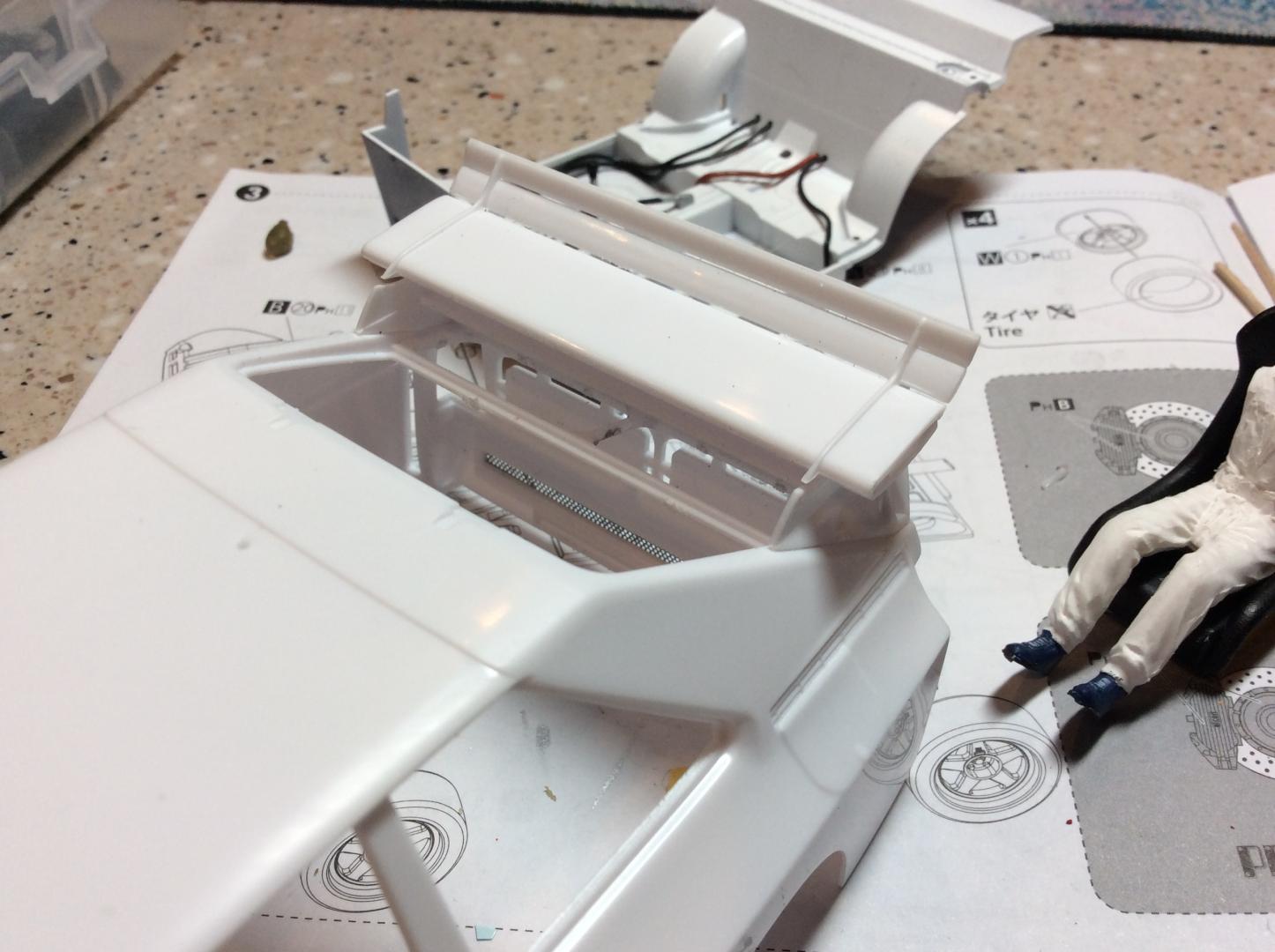 I had some time to do a few more things today. I love days off from work. Started working on the drivers and the belts. A bit disappointed in the detail kit as it does not give you enough material to make the full belts. I think they need to give you two pairs of ribbon. I have plenty in the supply box?. The drivers came from a Tamiya kit. I used the panel line detail in dark grey to pick out some of the wrinkles in the suit. Red line was done with a medium Sharpie. Suits were painted flat white. I put the body on just for a mock up.