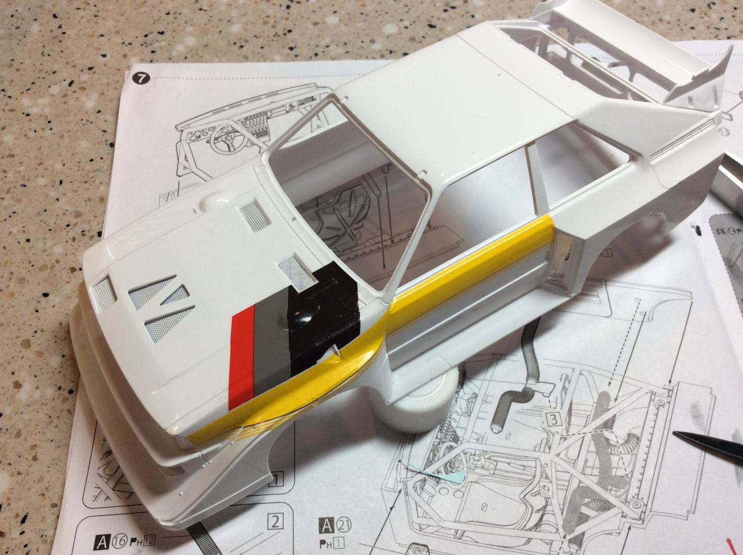 One side done with all the base decals. The trick is keep the thin navy line and the pinstripes all in line. One tip... if you add the rear wing on before putting the c pillar decal on,you will need to trim it a bit.