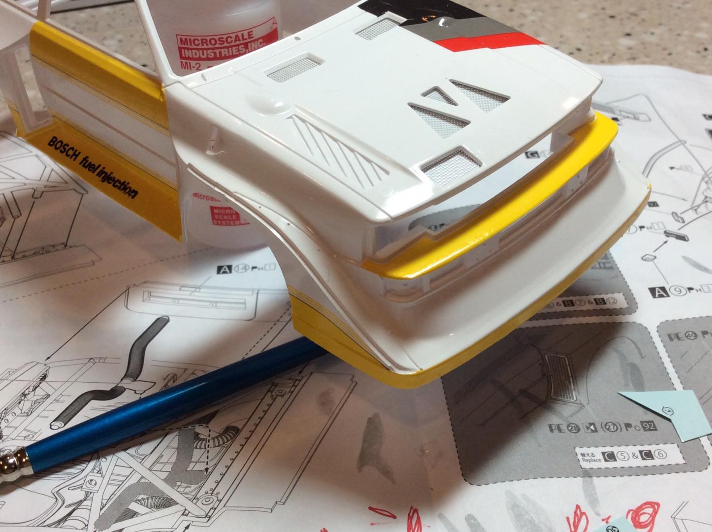 Let the decal madness begin. Started adding the front fender decals. The yellow part over the front wheel needs to be trimmed after it is applied. There is a trim line that can be followed. The fender decal is probably the hardest one. Goes over the hood wart and though the fender vent. Decals are a bit thick,but got it to bend with red label set and a hair dryer.