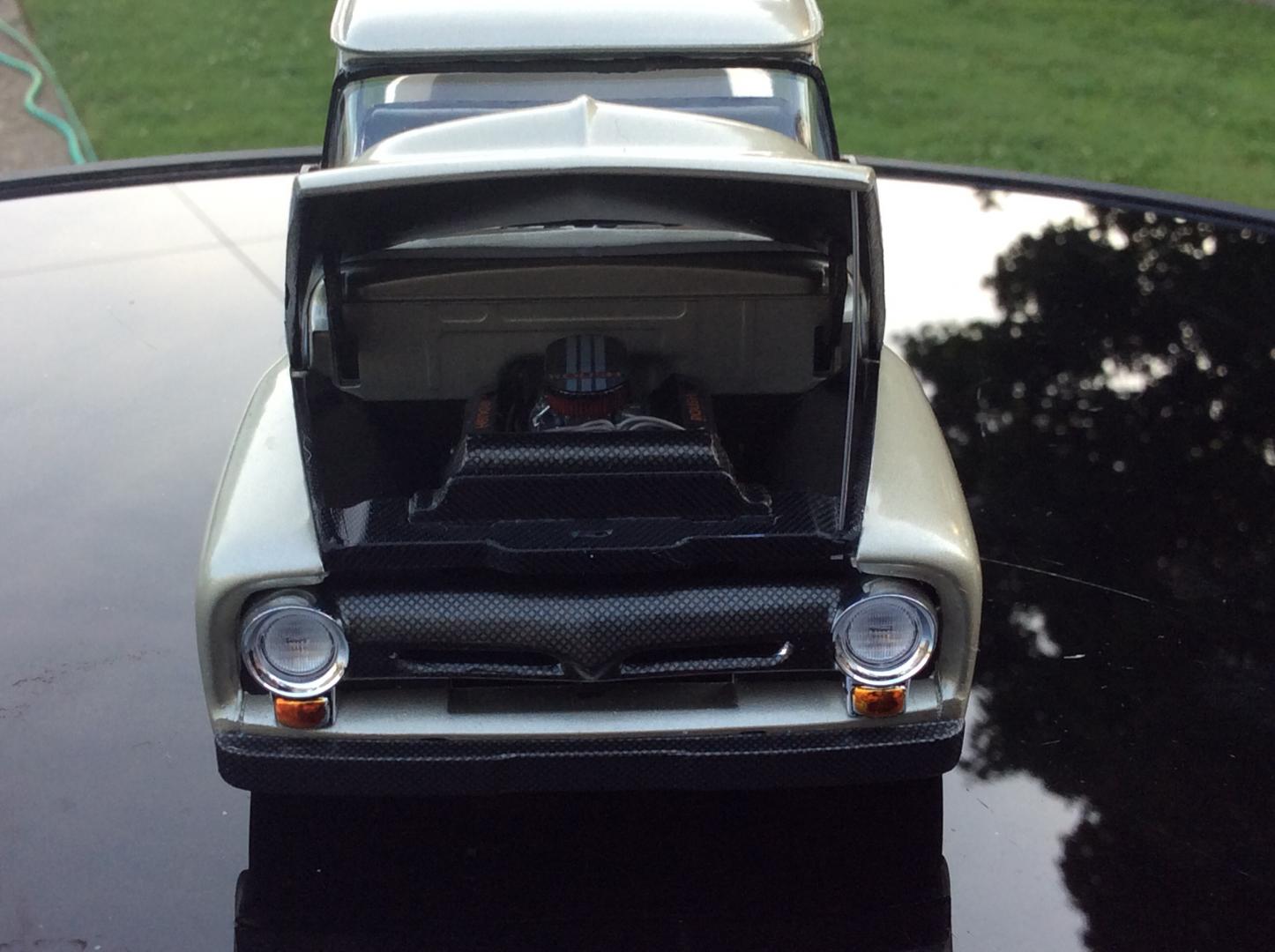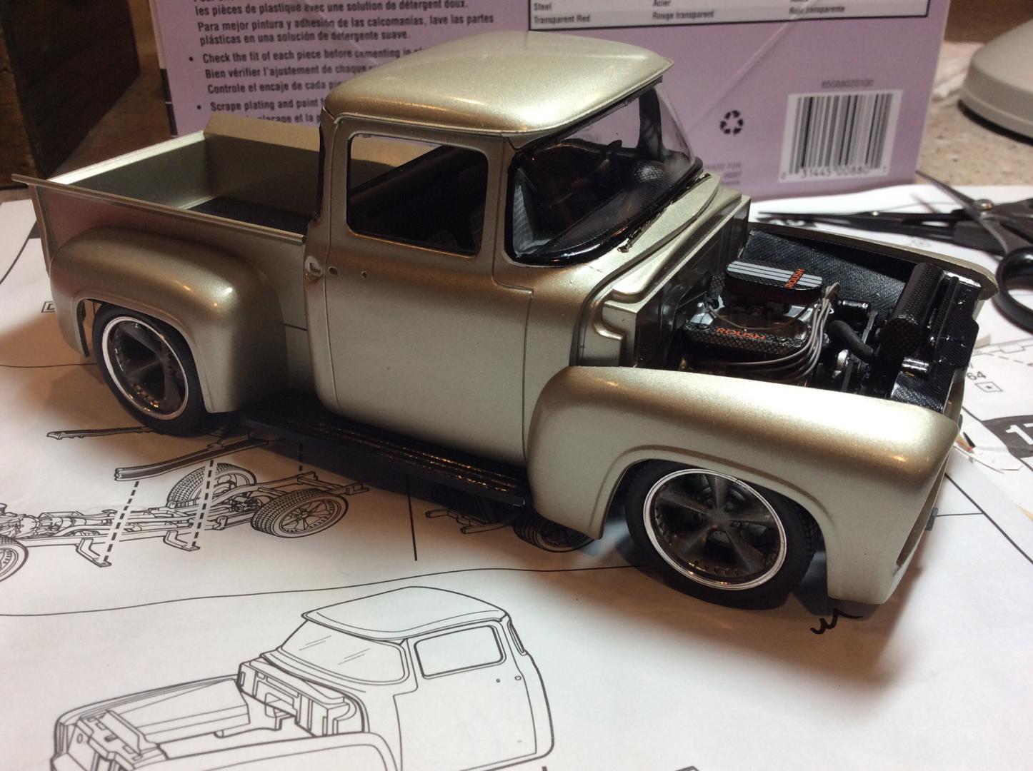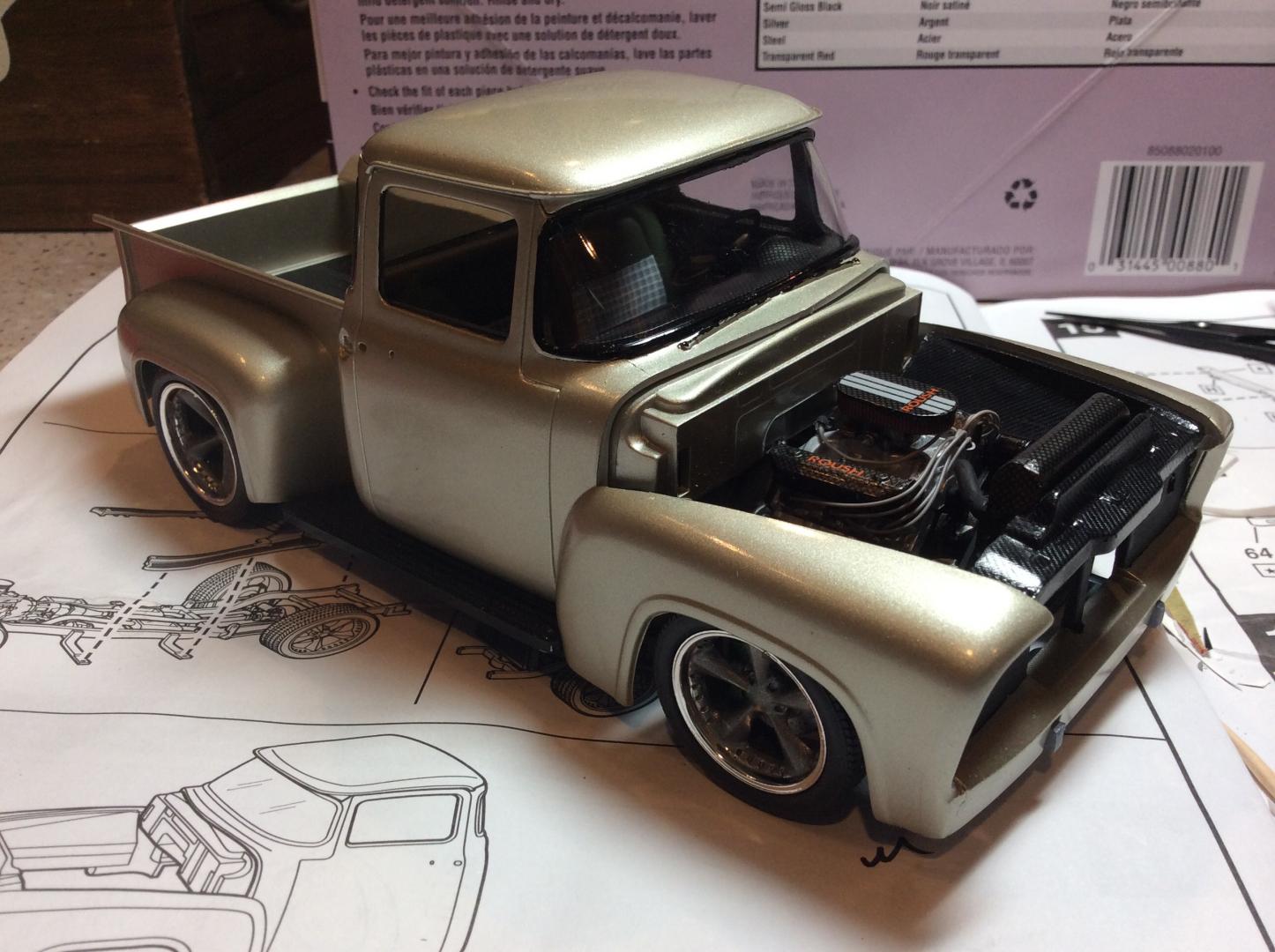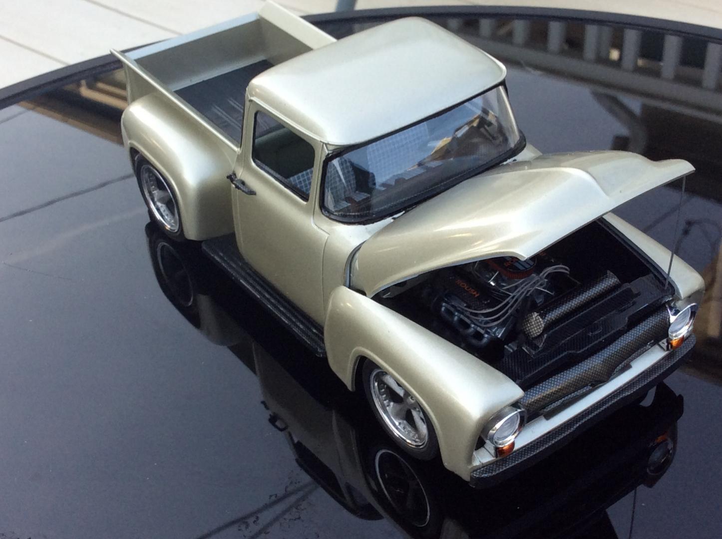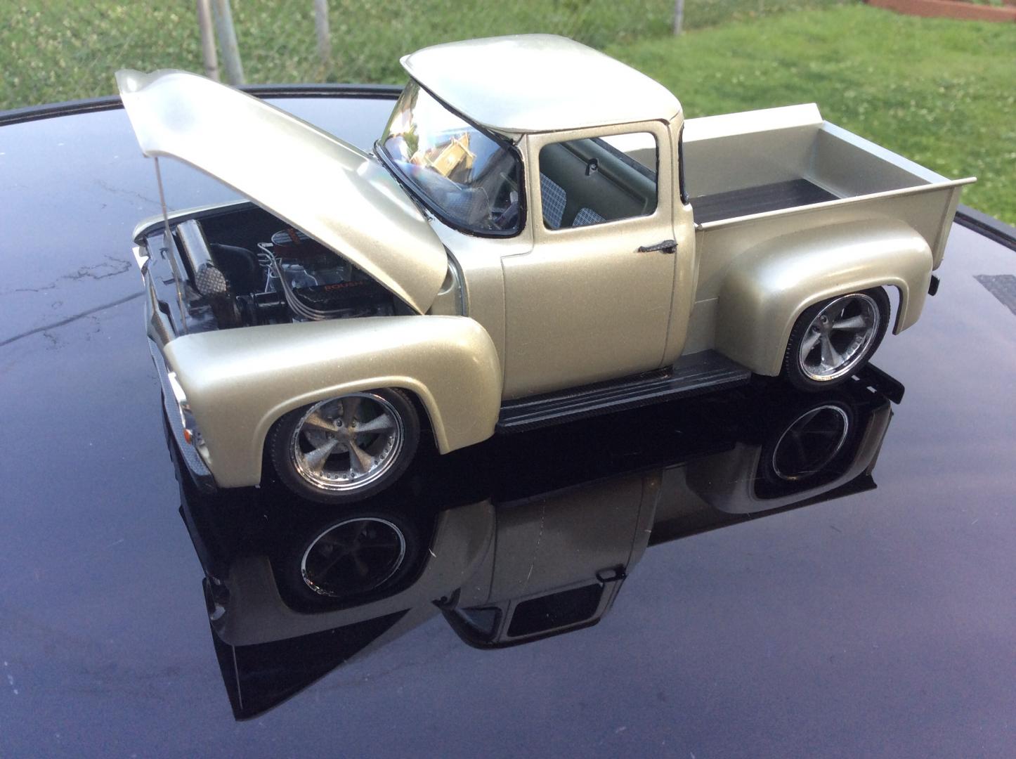 This is the first truck that I ever built. It was a Father's Day present from my kids. The kit is the Revell Foose FD 100 kit. The kit is box stock with the addition of carbon fiber decals and a few wires under the hood. Scale Motorsports decals were used on the bumpers and grill. They were used on the dash and radiator framing. Tamiya ultra fine carbon was used in the bed and running boards as well inside the engine compartment . Scale Motorsports plaid was used on the seats. The paint is Tamiya champagne gold.