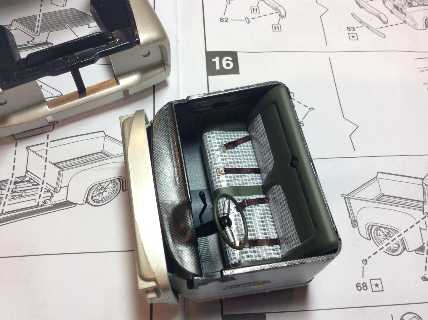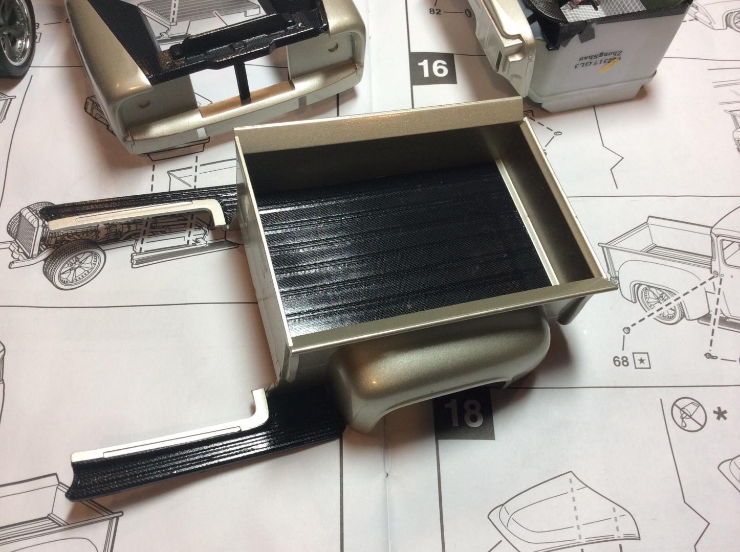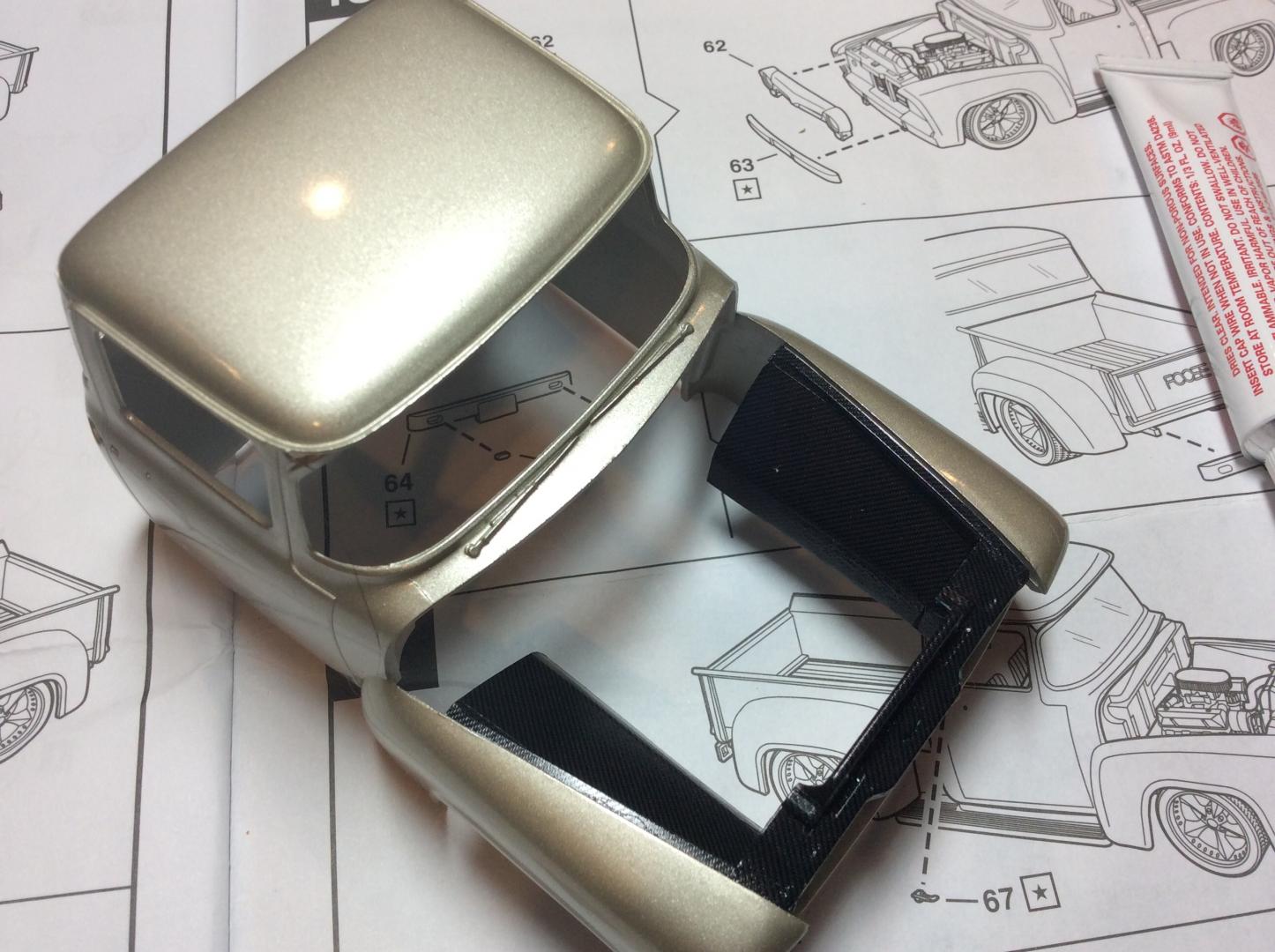 The kid was bought as a farthers day present last year. My son said I needed a truck in my collection of race cars. He asked me to build it while in between other cars. It's the Revell Foose kit mainly box stock, but with my love for carbon decals. The color is Tamiya champagne gold. The interior is a mix of colors and Scale Motorsports decals. The belts were made from Tamiya tape and left over parts. The chassis is painted Tamiya semi gloss met. Grey.. .....6/20. Had some free time to get the fit issue of the cab just right. Working on the grill and bumpers which will be carbon.