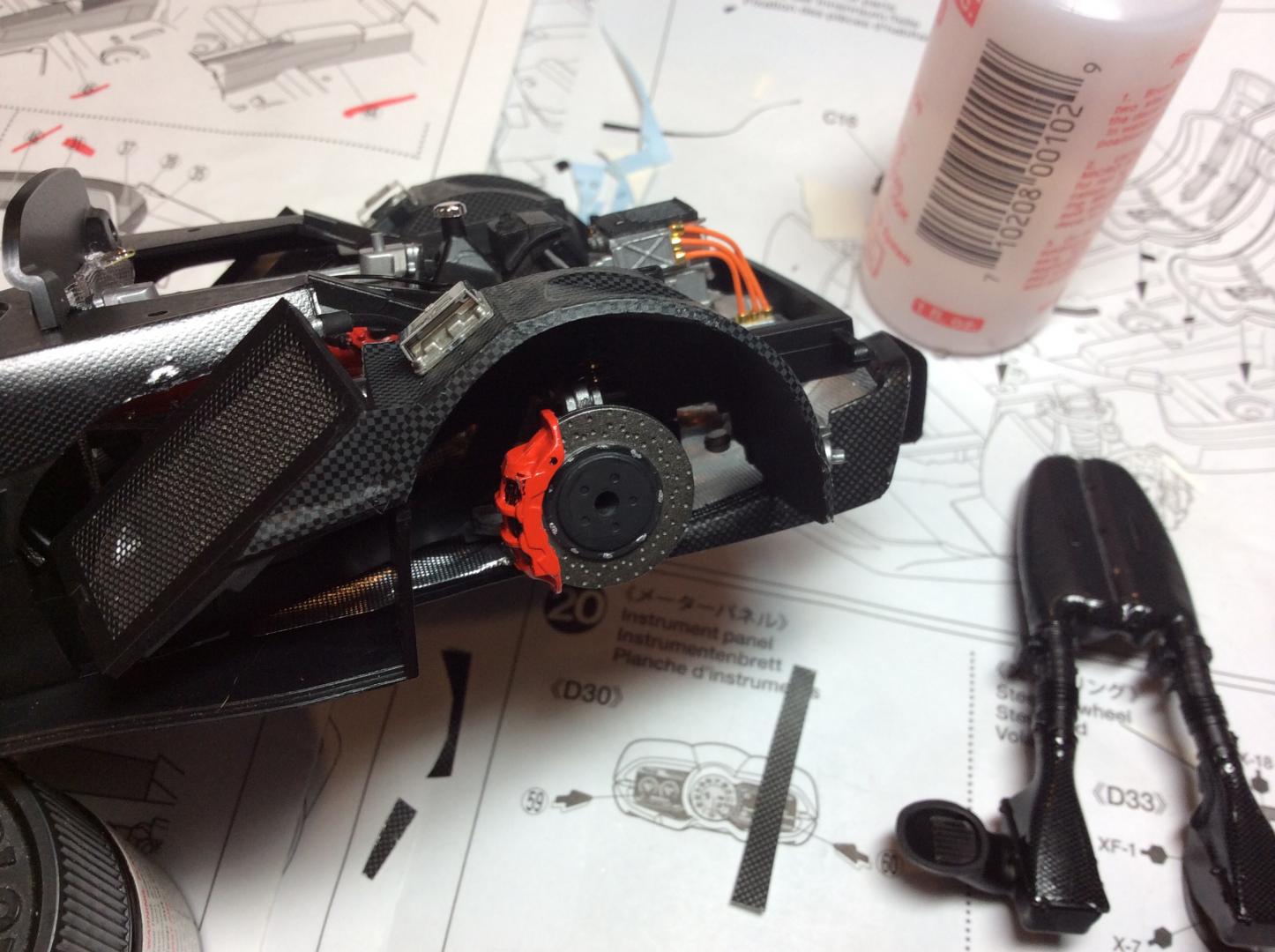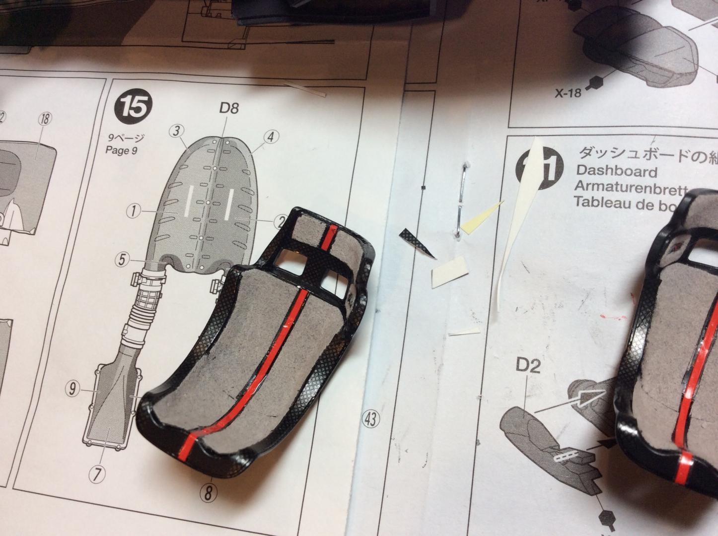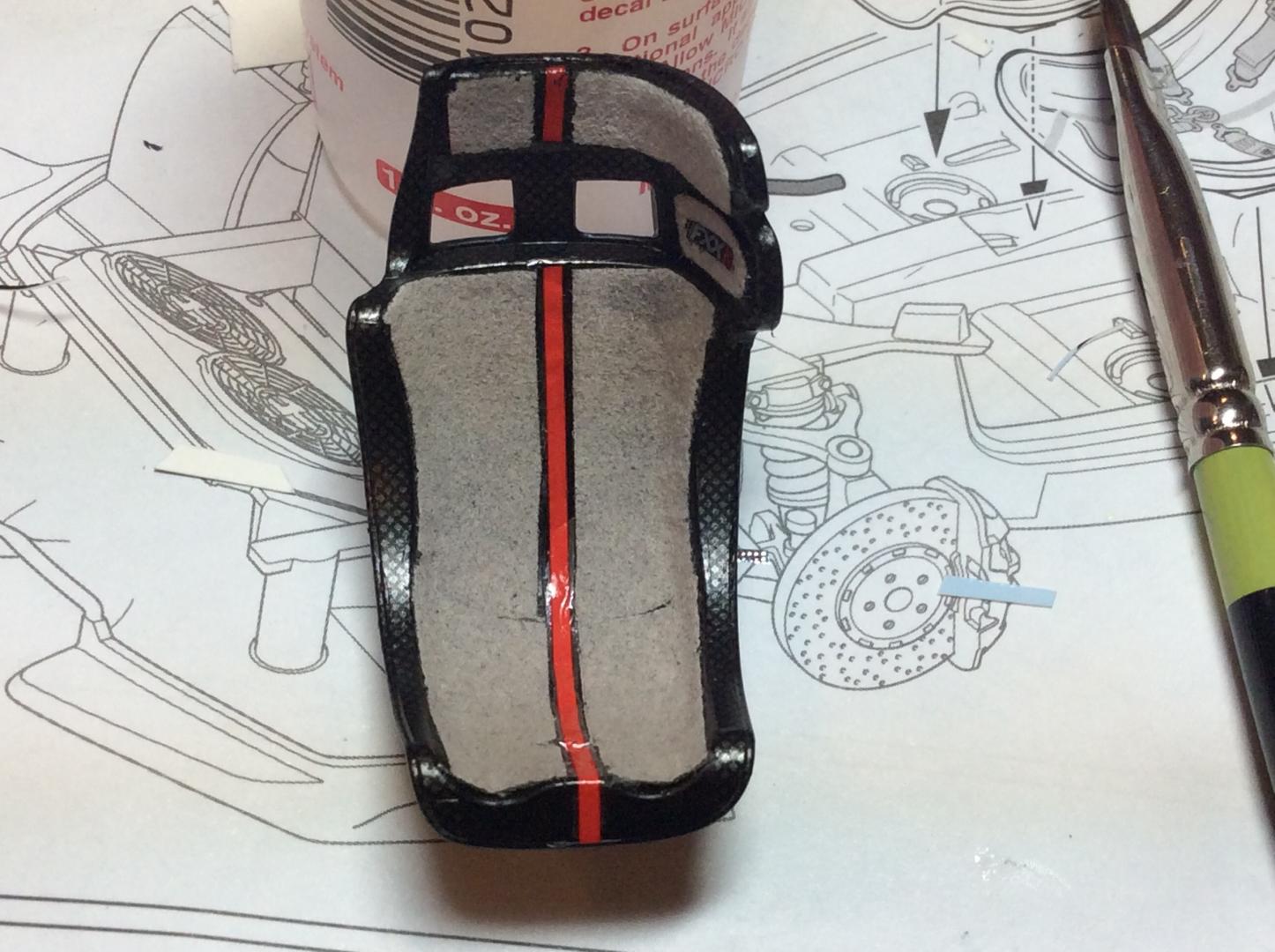 With parts drying on my FordGT ,I went back to work on the Fxx-k. The rear wheel wells have been added and sprayed with a flat coat. I put some extra decals on the outer edge of the wells because the back will be displayed open and it would show just a plan edge. Some wiring has been added and the lower tray has the heat shield on it. With the seats I wanted to try something different. The plain black carbon seat wasn't what I was looking for. I used plamoz velvet paper sticker. Super thin and has a good feel to it. The small seam will be covered by the belts. The seat were covered with carbon .